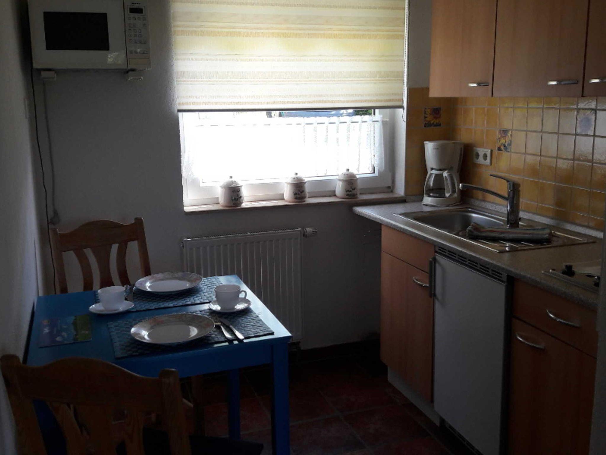 Ausstattung Küche: Mikrowelle, 2 Kochplatten, Kühlschrank, Wasserkocher, Eierkocher, Toaster, Kaffeemaschine.