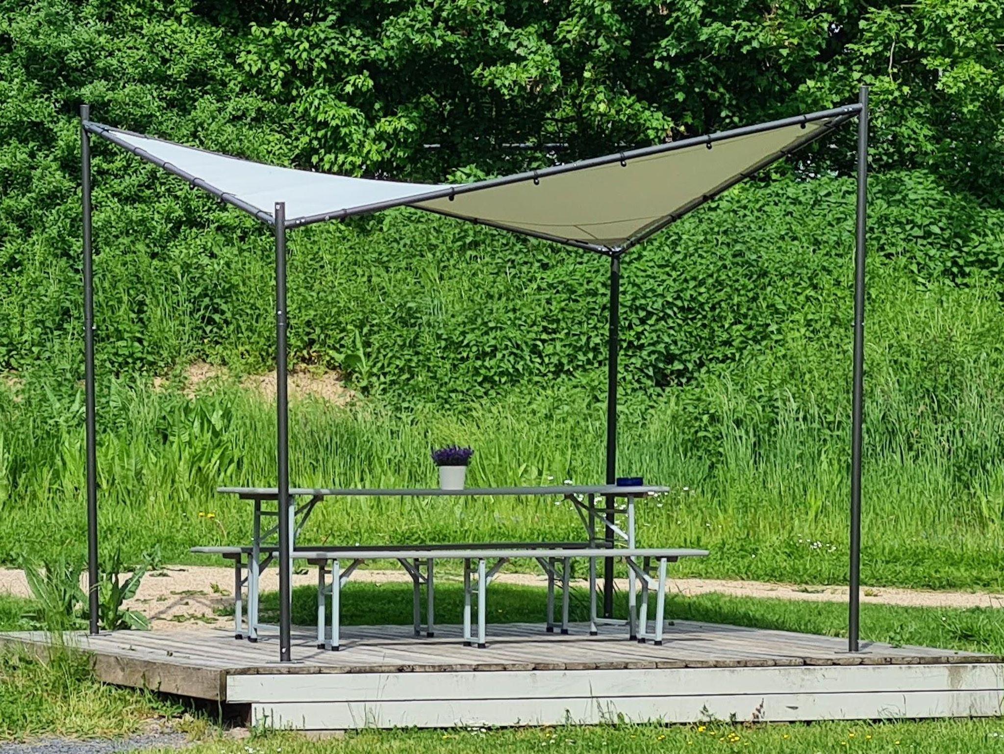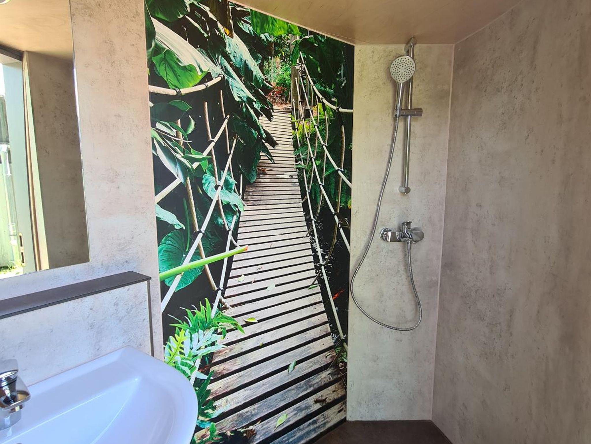 Zwei Sanitärfässer auf dem Schmetterlingsparkgelände bieten komfortable Duschen und Toiletten.