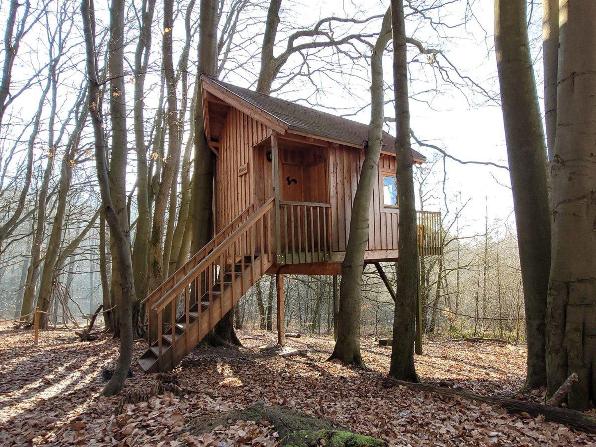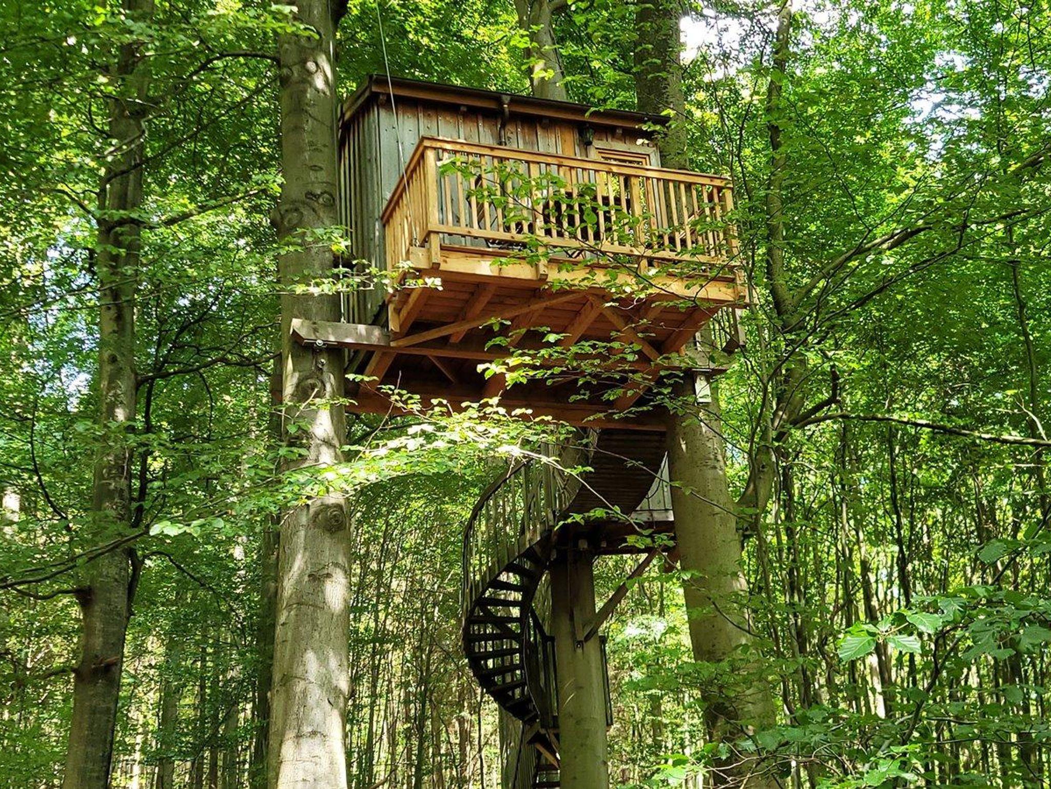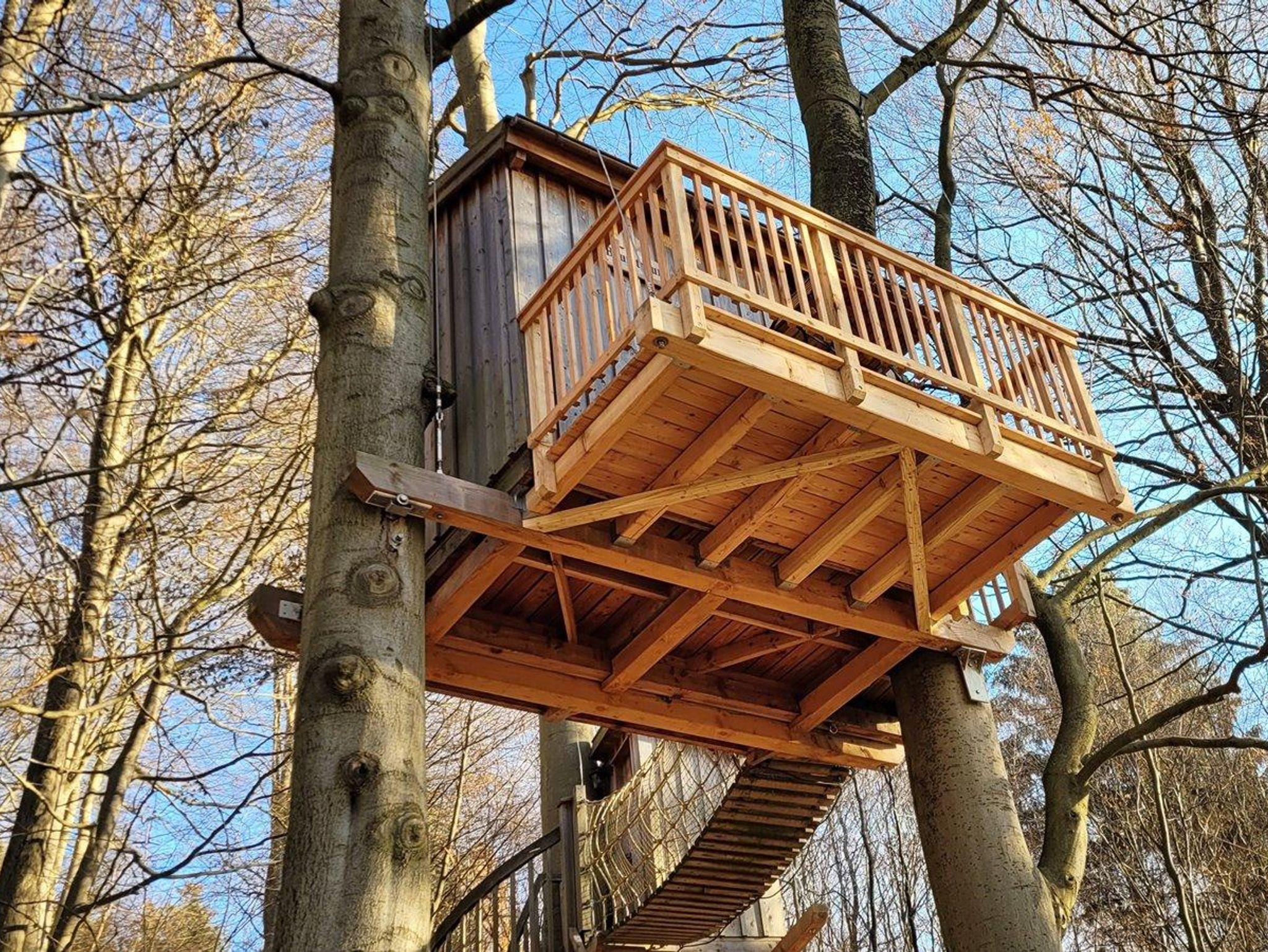 Das etwas andere Baumhaus. Komplett ohne Stützpfeiler, nur gehalten von Stahlseilen, hängt das Baumhaus zwischen zwei mächtigen Buchen.