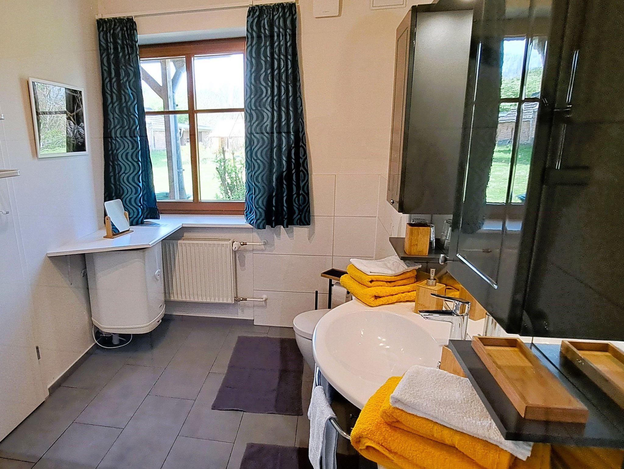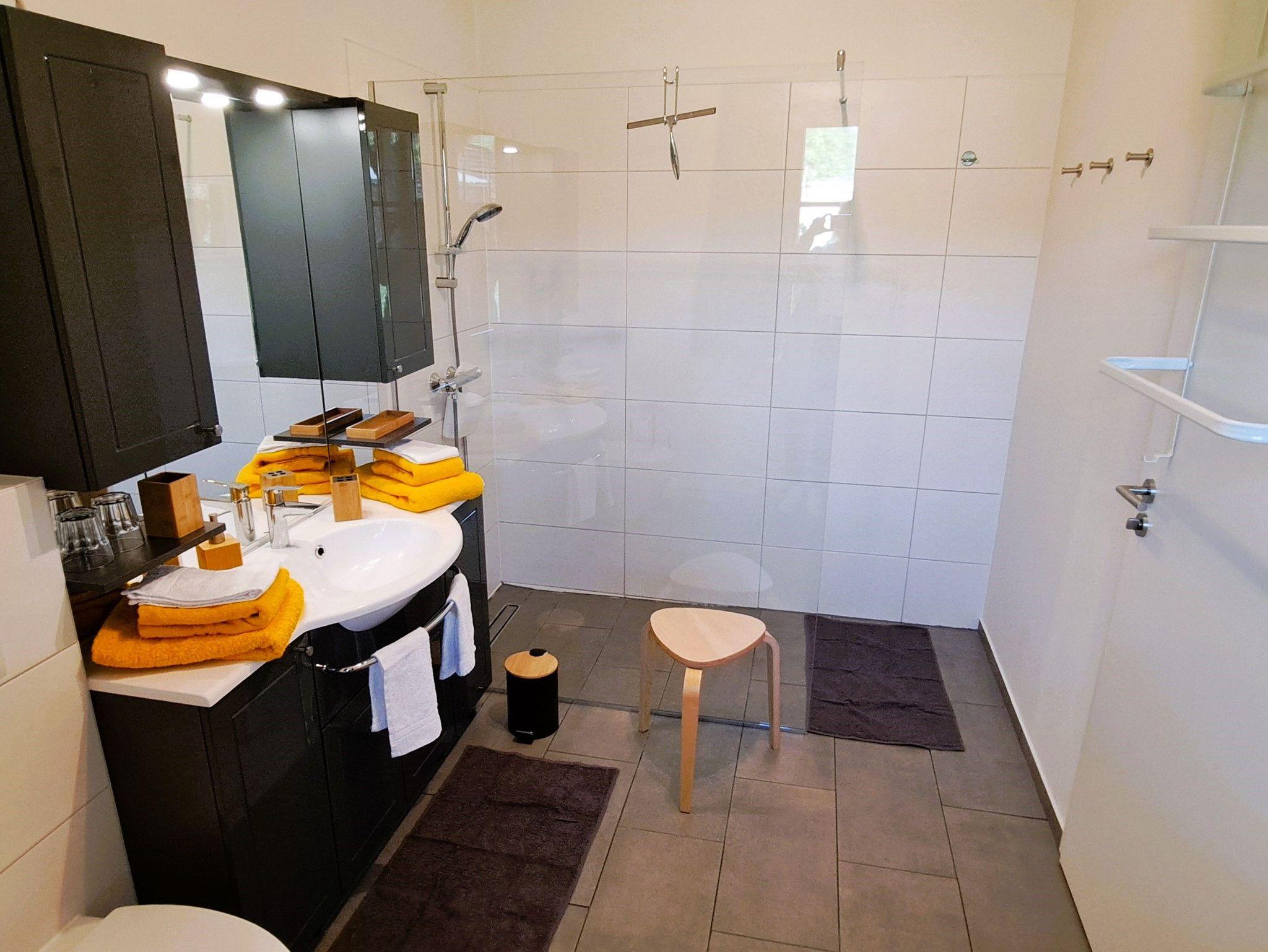 Das Badezimmer verfügt über eine ebenerdige Dusche, einen Waschtisch und ein WC. Hier finden Sie auch ausreichend Ablagemöglichkeiten für Ihre Pflegeprodukte und andere Utensilien. Alle Zimmer verfügen über fest installierte Fliegengitter.