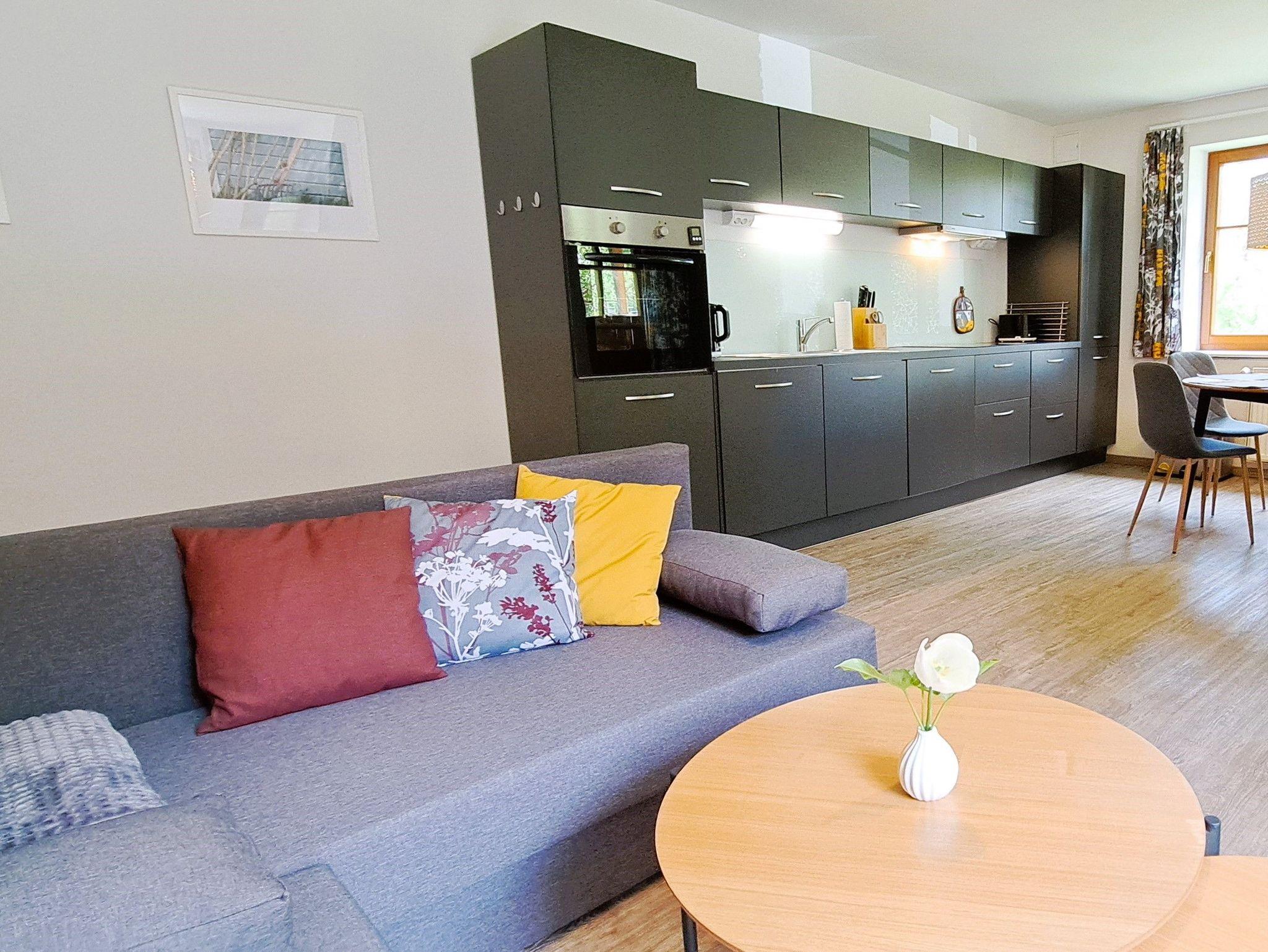 Die Couchlandschaft im Wohnzimmer verfügt über einen Flachbildfernseher und kann bei Bedarf in eine Schlafmöglichkeit für 2 Personen umgewandelt werden. Das ist ideal für eine kleine Familie oder ein Paar, die zusätzlichen Platz zum Schlafen benötigen.