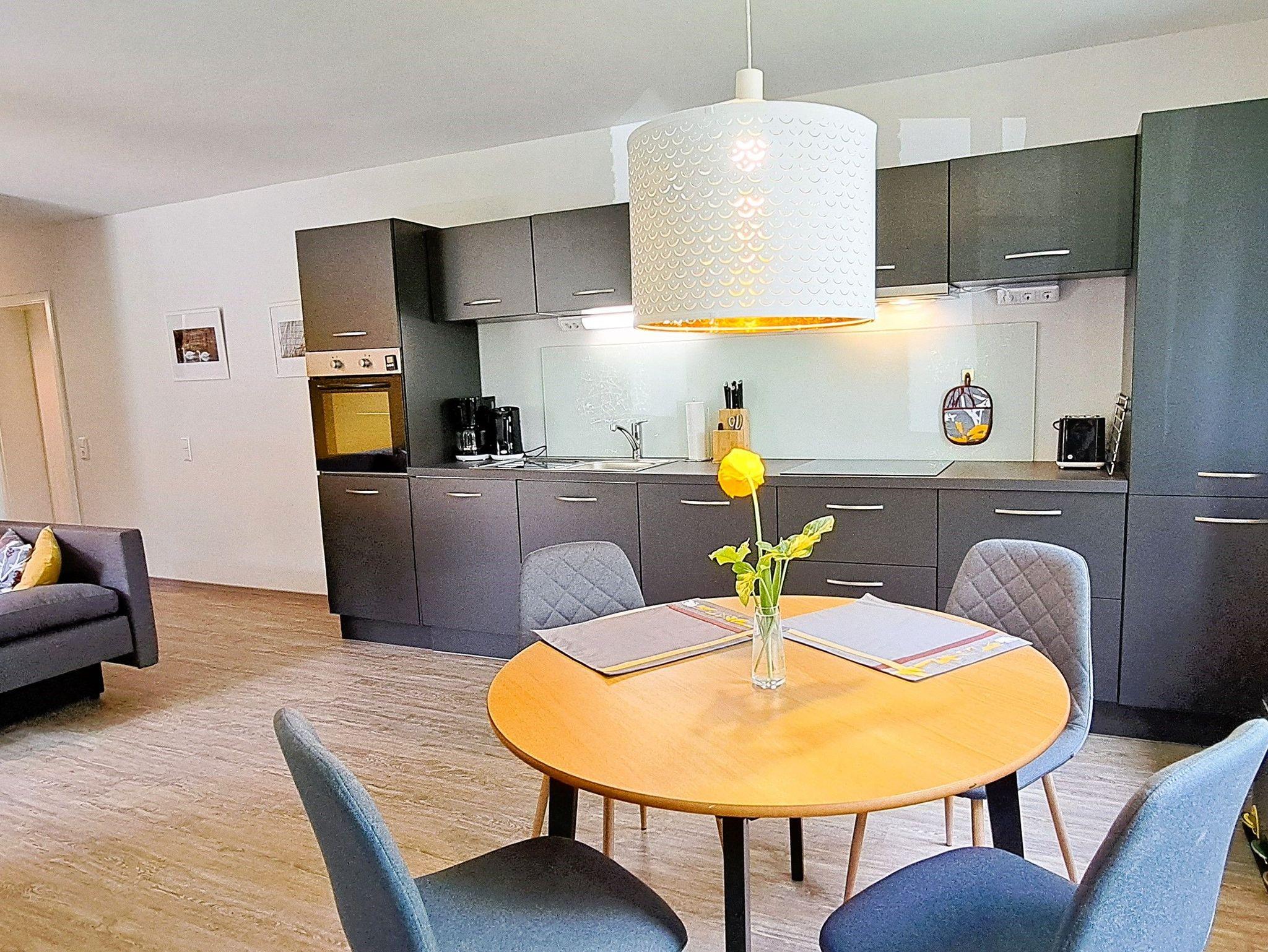 Von hier aus betreten Sie den offenen Wohn-, Koch- und Essbereich. Die moderne Küche ist komplett ausgestattet und bietet alles, was Sie zum Kochen benötigen. Am Esstisch für 4 Personen können Sie gemütlich Ihre Mahlzeiten genießen oder einfach gemeinsam Zeit verbringen.