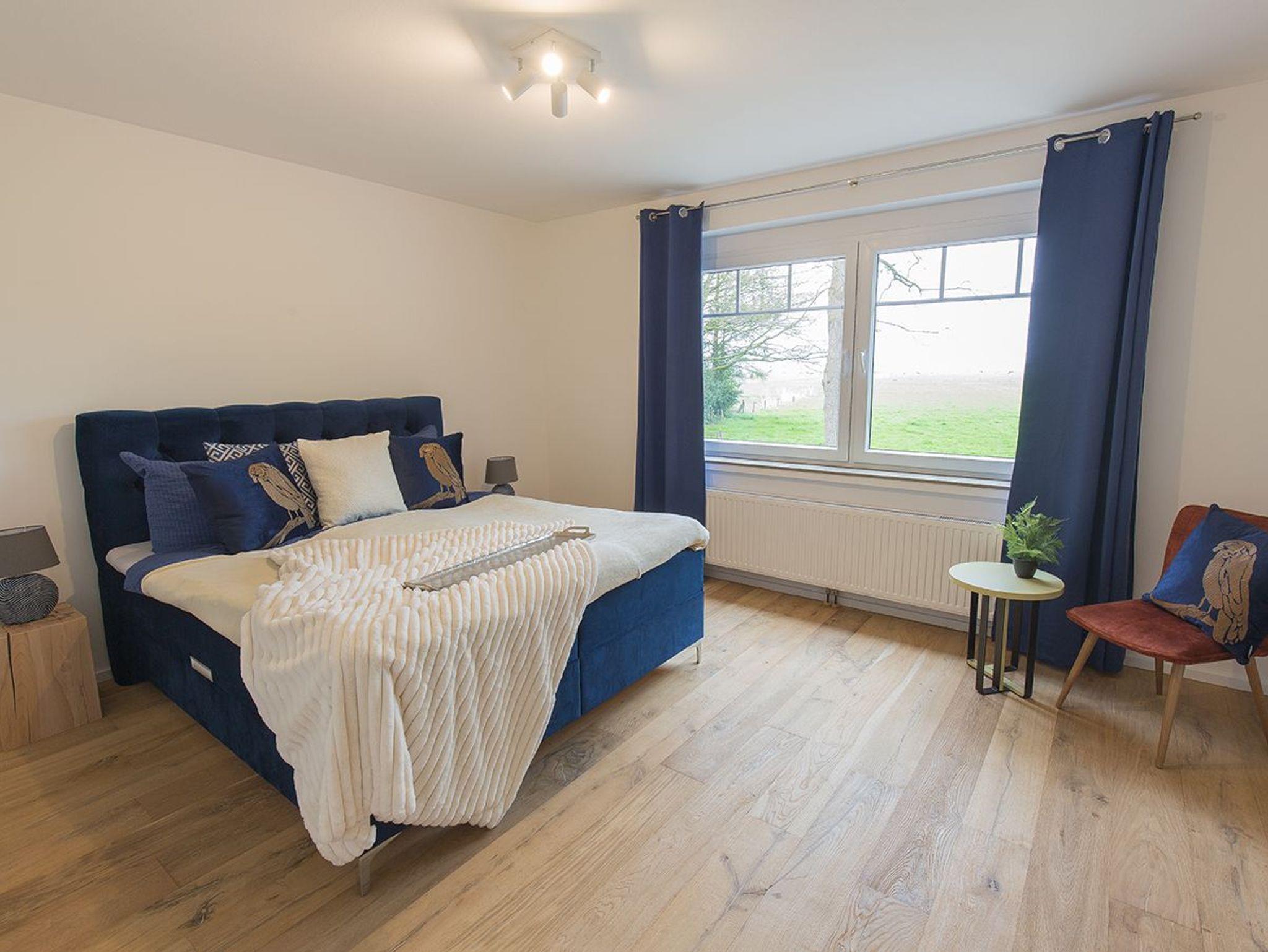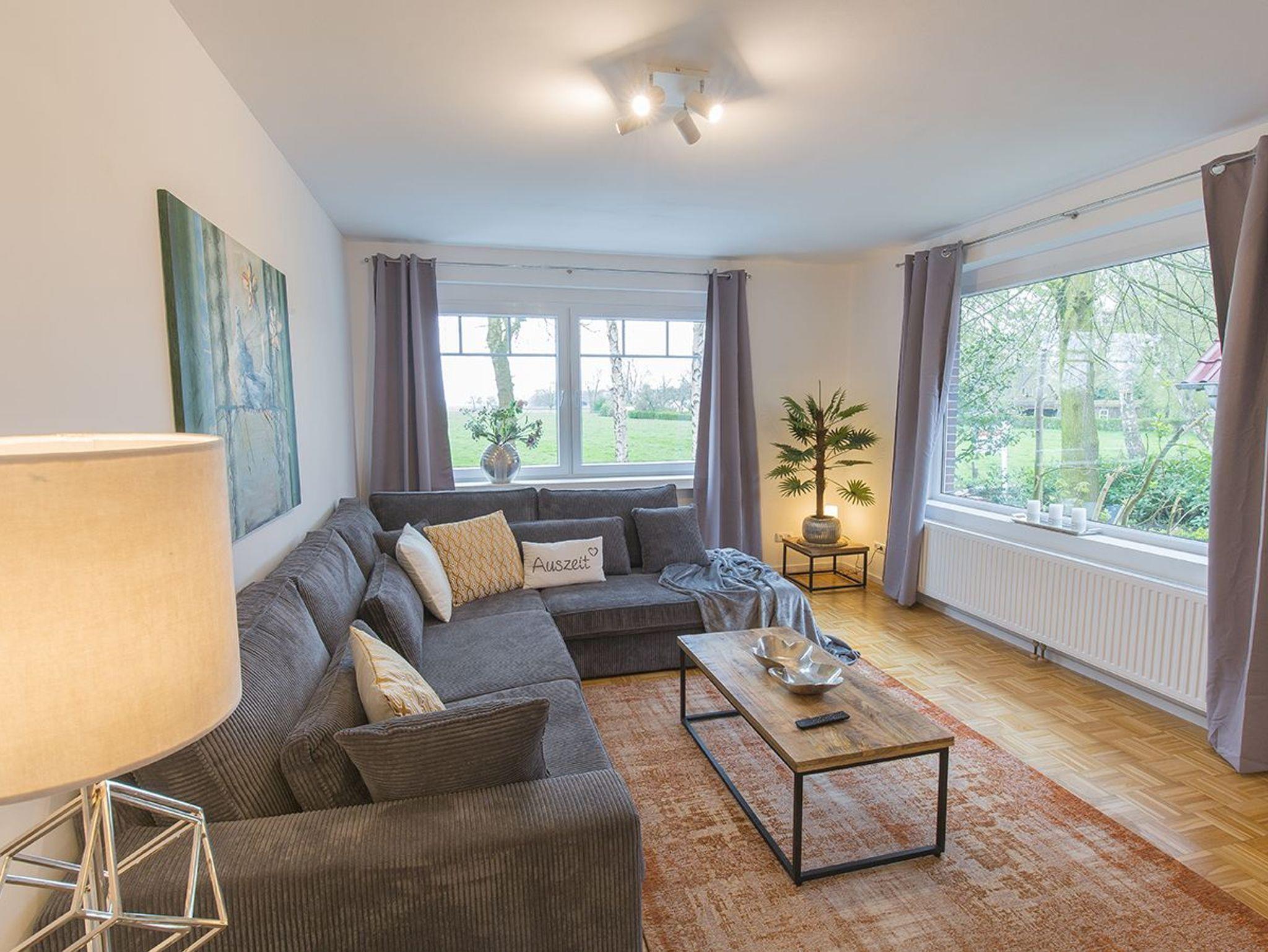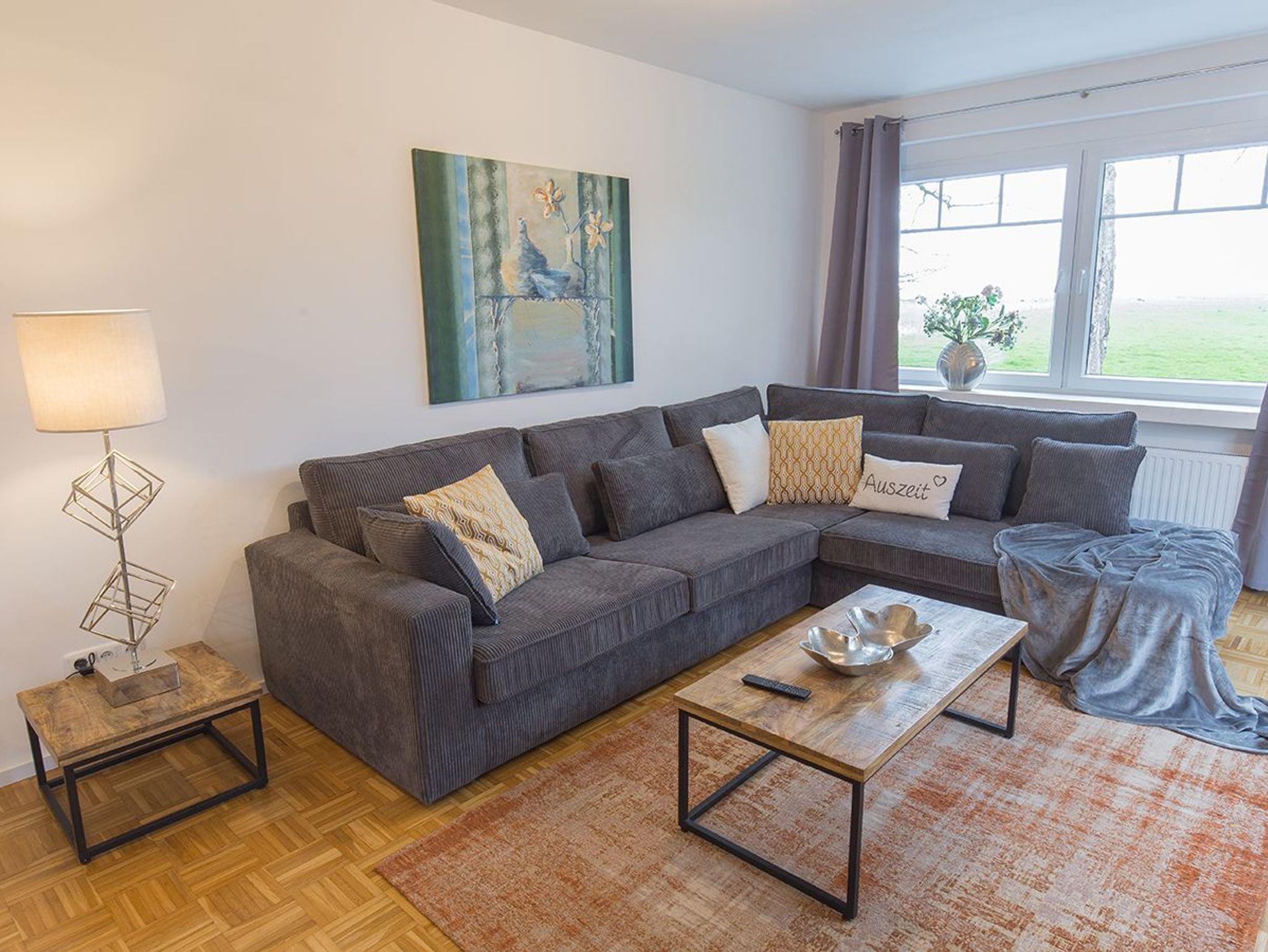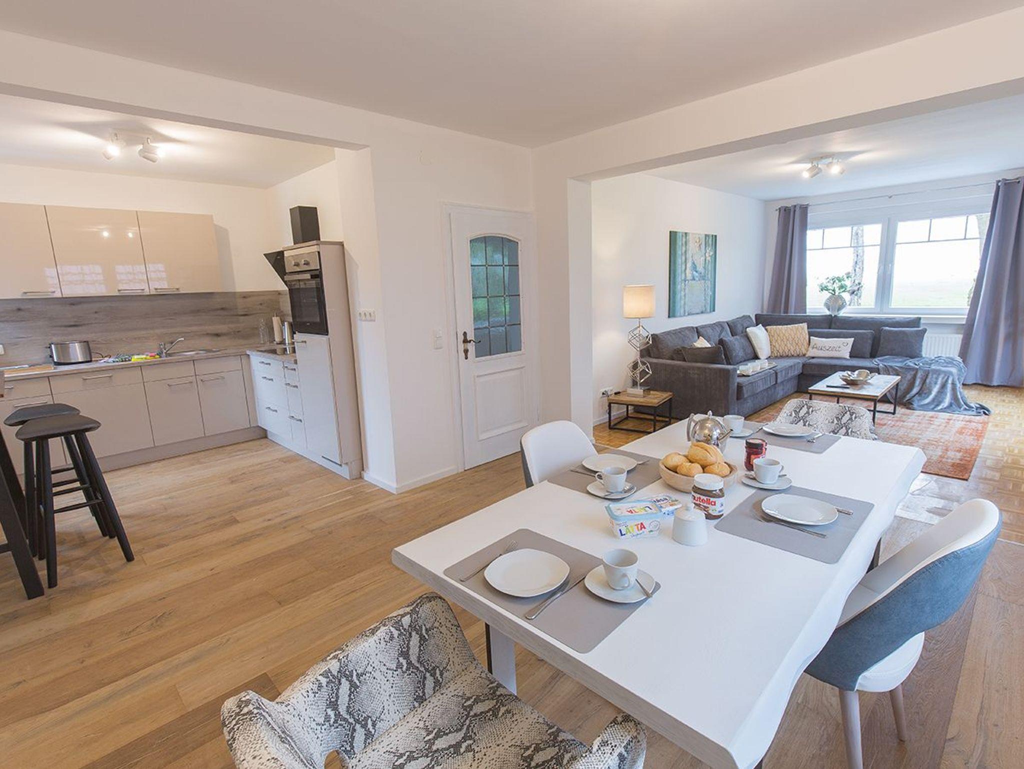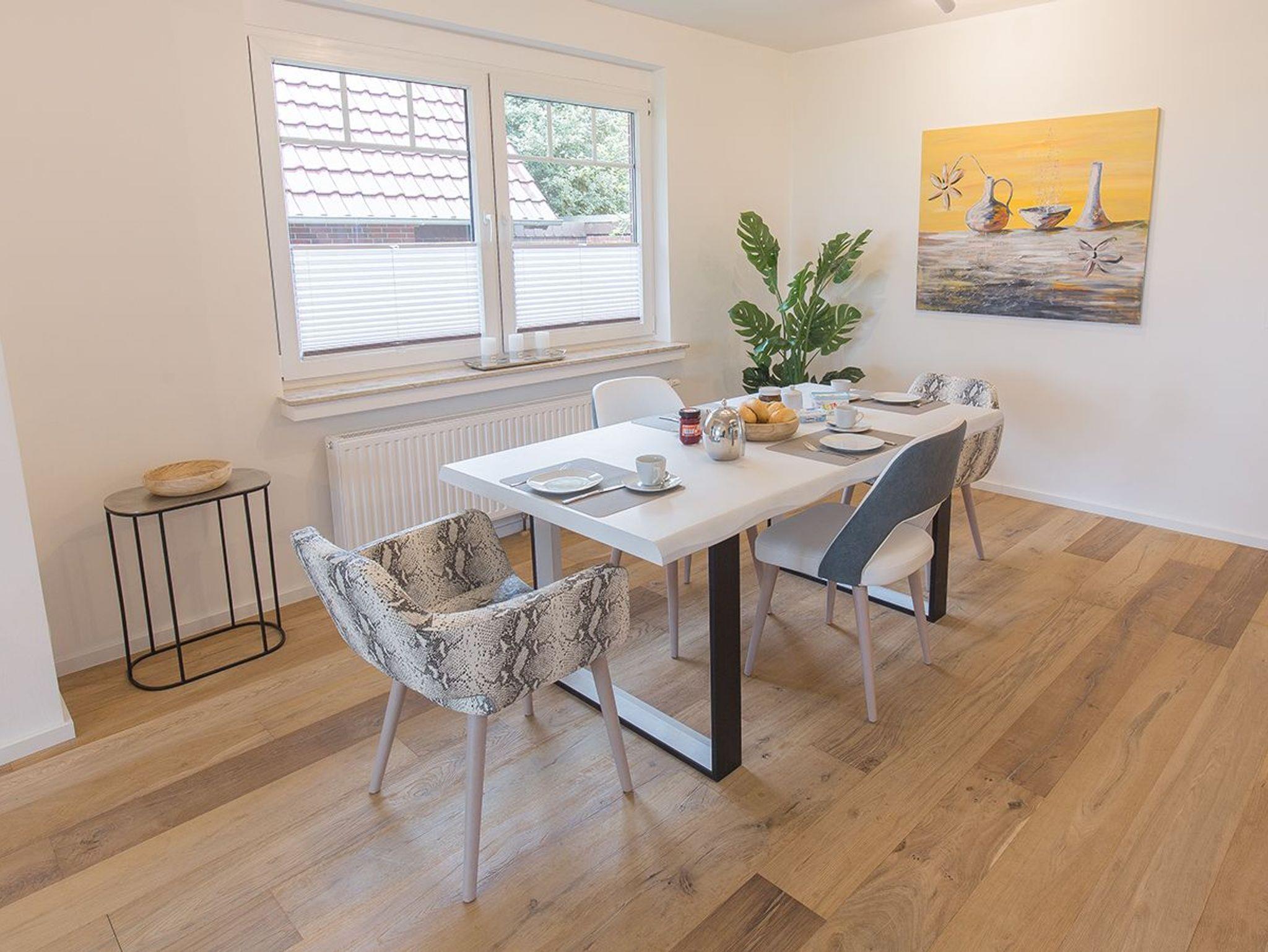 Hier fühlen Sie sich sofort wohl. Unsere frisch sanierte Wohnung Fresenhuus 1 ist Teil der Ferienwohnungsanlage achtteihn und liegt in der Oldeoogstraße in Dangast mitten im Grünen. Ihr Stellplatz befindet sich unmittelbar vor der Anlage. In der gesamten Wohnung wurde gemütliches Echtholz-Eichenparkett verlegt. Ab Eingang betreten Sie eine helle geräumige Diele mit Blick zur Garderobensitzbank. Links geht es in das Schlafzimmer mit großem Boxspringbett und rechts zum geräumigen Duschbad mit Fußbodenheizung und Walk-In Regendusche. Weiter geradeaus befinden sich das offene Esszimmer, das Wohnzimmer mit extra-großem Sofa mit Récamiere und Schlaffunktion sowie einer schicken Hochglanz-Einbauküche. Genießen Sie den tollen Garten, die unverbaute Aussicht auf Felder und Wiesen Richtung Deich sowie die finnische Panoramasauna. Garten- und Saunanutzung sind gemeinschaftlich für Gäste aller sieben Wohnungen der Ferienanlage nutzbar!