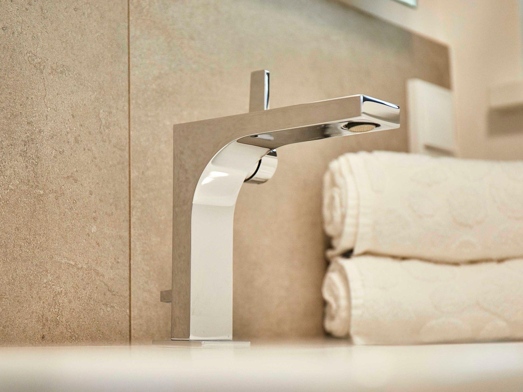 Die Bäder verfügen über große ebenerdige Regenfallduschen und moderne Design Armaturen.