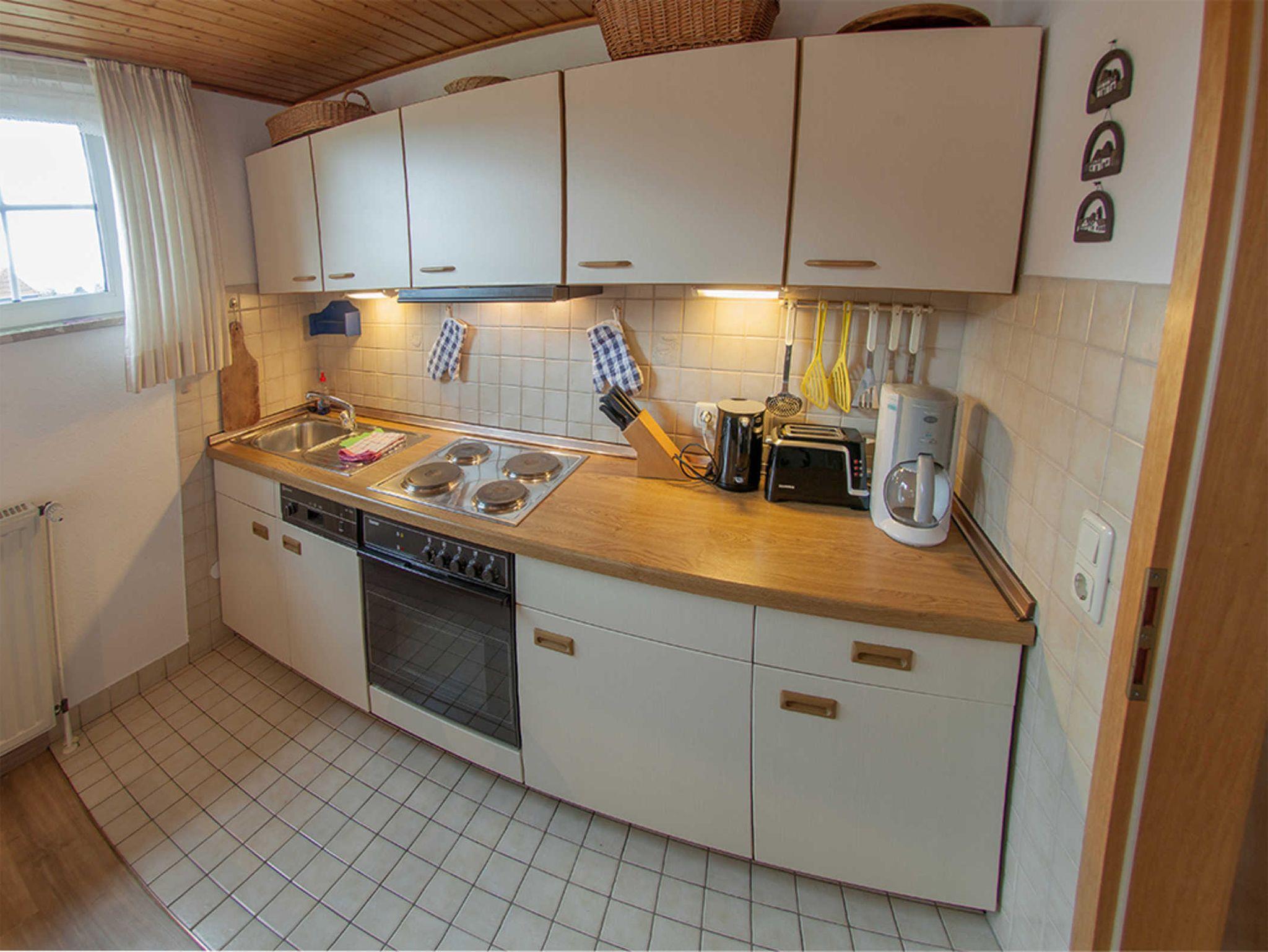 Die Ferienwohnung Helene freut sich auf viele Feriengäste. Die Wohnung hat einen eigenen Treppenaufgang und ist eine Maisonette. Rechts geht es in den Wohnraum mit gemütlichem Sitz- und Essbereich. Wir bieten hier einen großen Flachbild-Fernseher, Blu-ray-Player, Radio und eine Bücherauswahl. Von hier aus gelangen Sie auf den Balkon. In der gut ausgestatteten, separaten Küche gibt es einen weiteren Essplatz. Auch das Elternschlafzimmer mit Doppelbett befindet sich auf dieser Ebene.