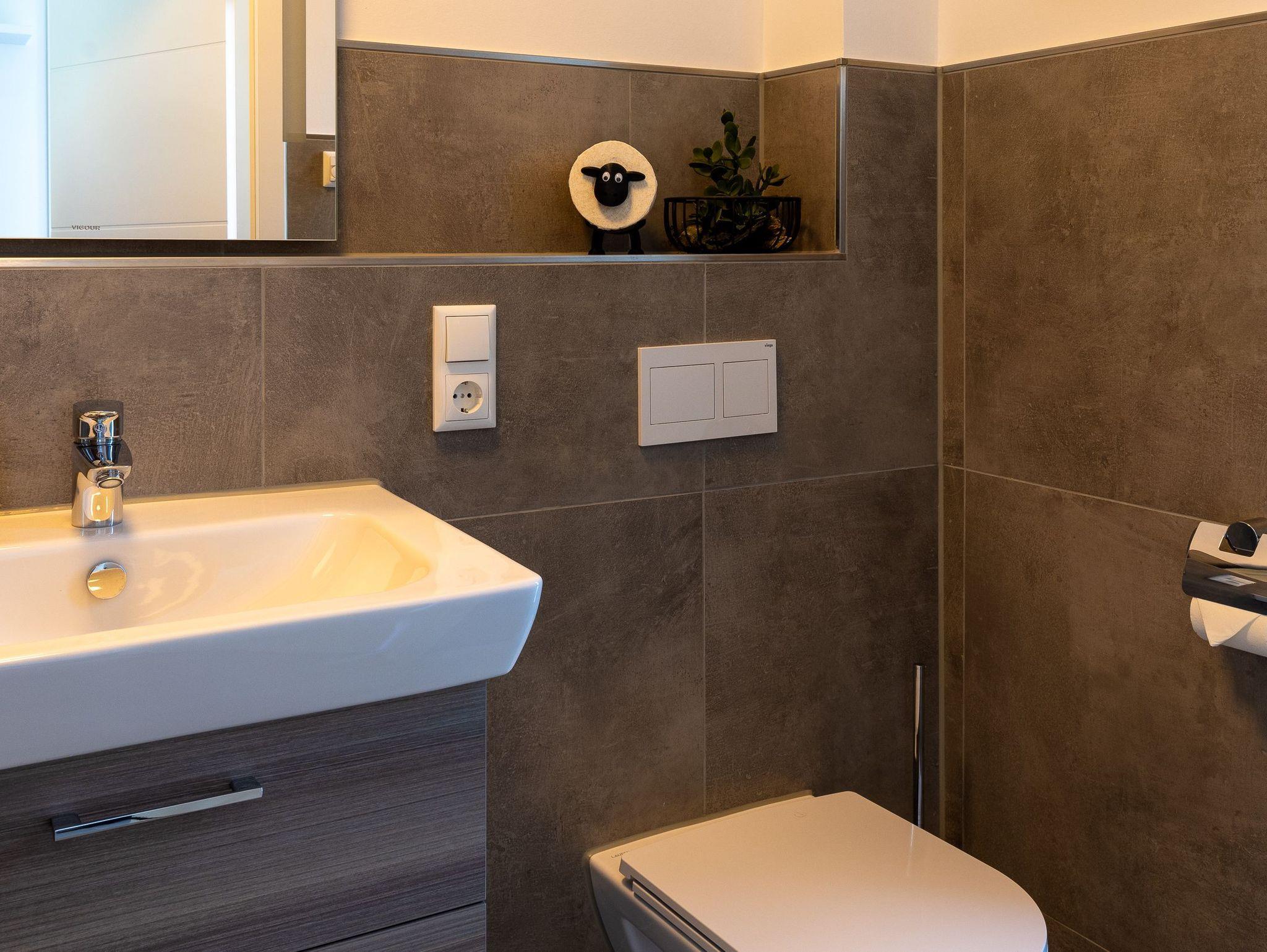 Duschbad (EG): Bodentiefe barrierefreie Dusche, Waschtischanlage mit Spiegel und Unterschrank, WC, Kindertritt, Handtuchhaken, Handtuchheizkörper, Fenster zum Lüften.