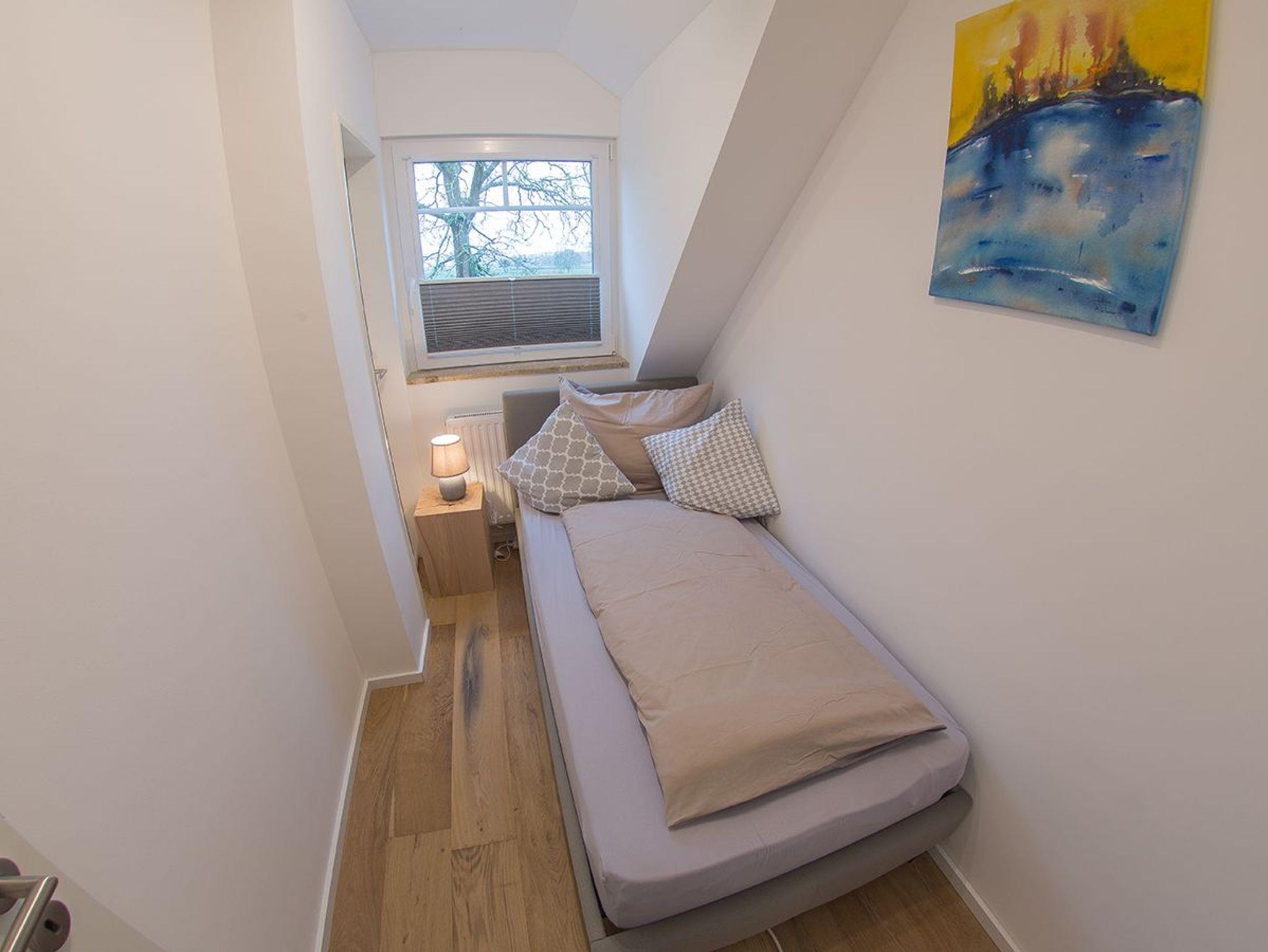 Willkommen in unserer Ferienwohnung Fresenhuus 2 im ersten OG links, Teil der Ferienwohnanlage achtteihn in der Oldeoogstraße. Sie surfen mit Highspeed-Internet; im gesamten Objekt wurde Echtholz-Eichenparkett verlegt Das Bad ist ausgestattet mit Fußbodenheizung und ebenerdiger Walk-In-Regendusche. Hier urlauben bis zu drei Personen und Kleinkind in frischer friesischer Luft. Ein langer heller Flur führt zunächst direkt links in das Schlafzimmer mit Einzelbett und dahinter zum Schlafzimmer mit Doppelbett. Beide Schlafräume sind mit einer Tür verbunden. Ab Diele geht es auch ins moderne Duschbad. Sie gelangen weiter zum großen Raum für die Bereiche Wohnen/Kochen/Essen. Rechts die offene Küche mit vorgelagertem Essplatz und weitere 2 Sitzgelegenheiten an einer Küchentheke direkt vor dem Balkonausgang. Links das bequeme Ottomanen-Sofa mit Schlaffunktion. Der große Balkon bietet einen schönen Rundumblick auf achtteihn, Felder und Wiesen.