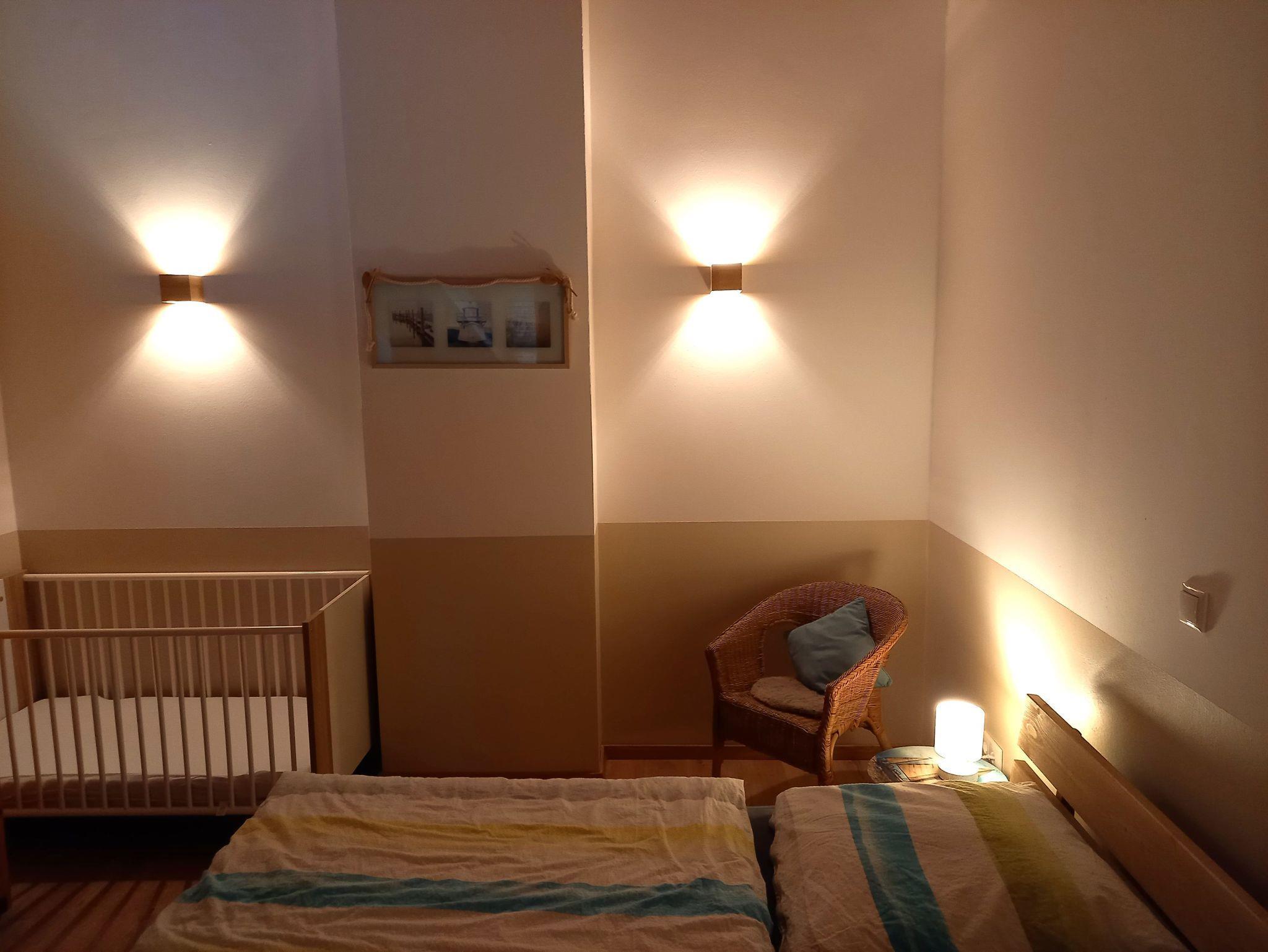 Im Schlafzimmer befindet sich ein Doppelbett (1,80 x 2,00 m) und ein Kinderbett (1,40 x 0,70 m). Im Wohnbereich befindet sich ein Schlafsofa (1,60 x 2,00 m)