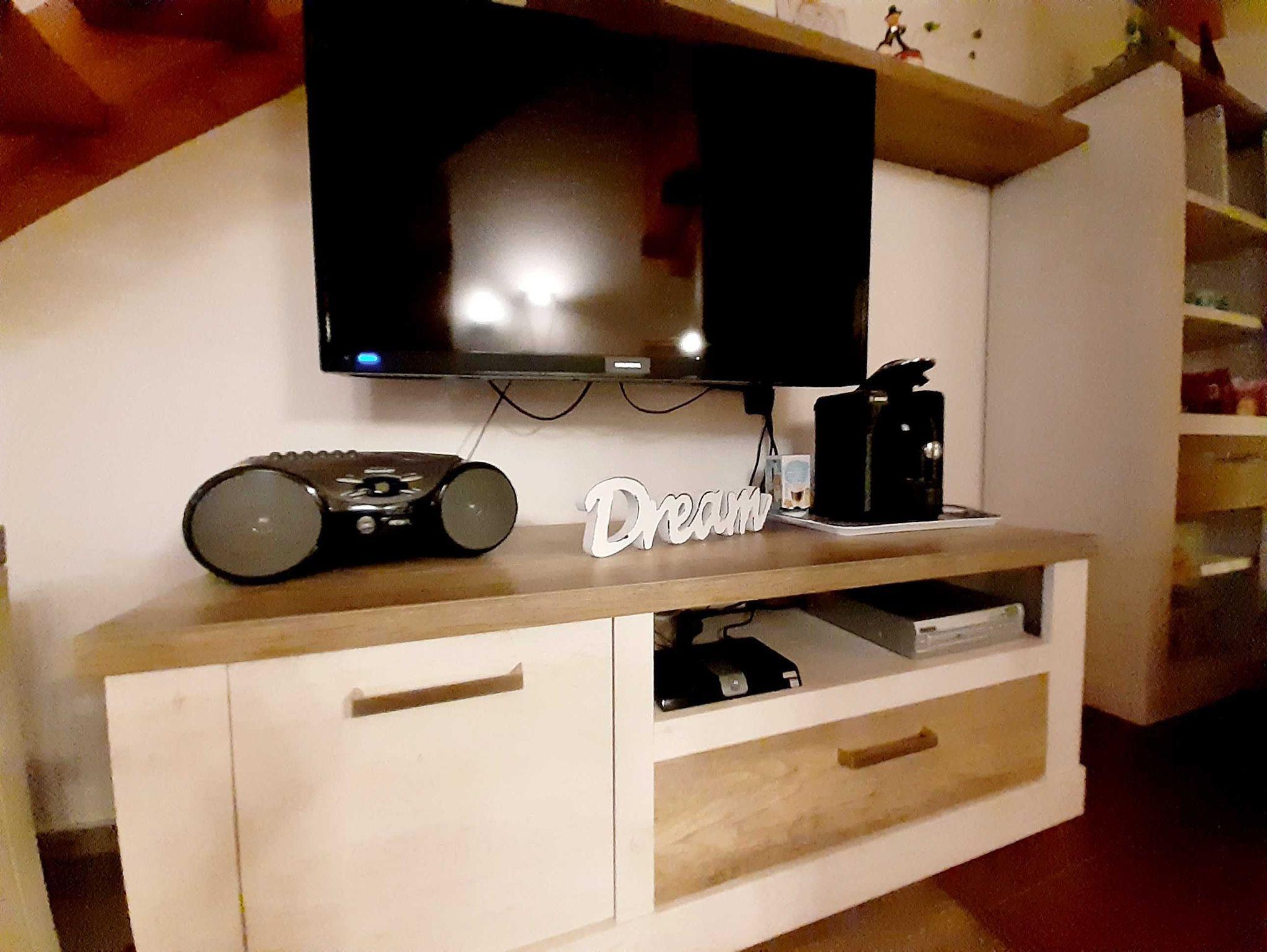 Sie verfügt über ein separates Schlafzimmer mit einem Doppelbett und einem Babybett, eine große Schlafcouch im Wohn- Essbereich, eine Küche mit allem, was man für einen Urlaub braucht und ein geräumiges Badezimmer mit Badewanne.