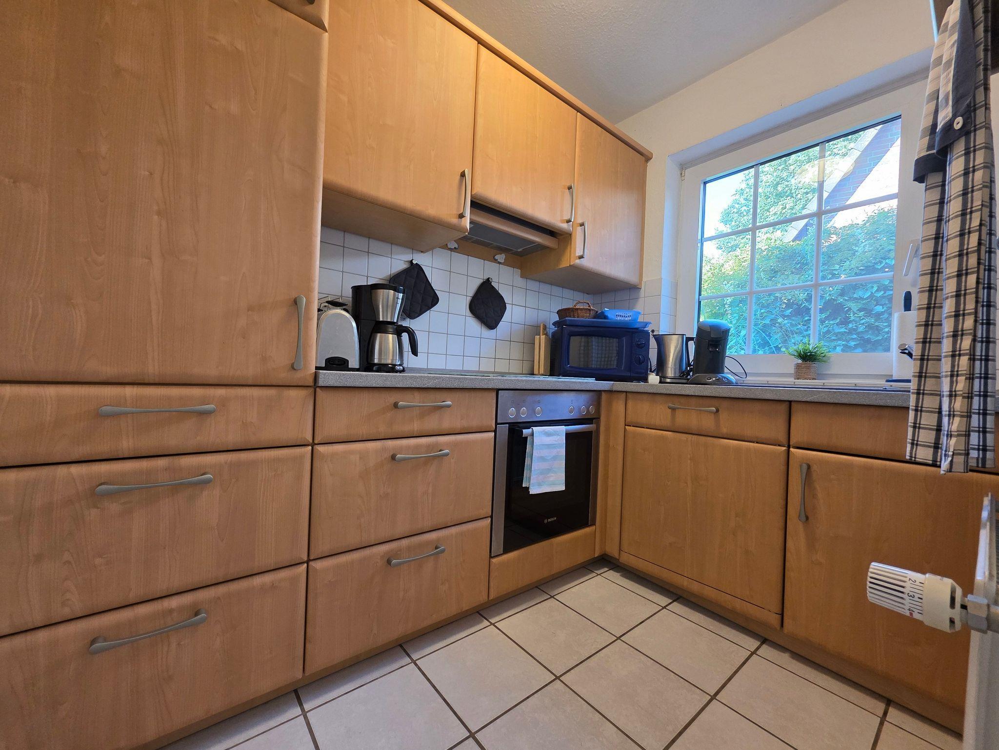 Die separate Küche enthält eine große Spülmaschine, einen Herd mit Cerankochfeld, Dunstabzug und eine umfangreiche Gesamtausstattung (Kaffeemaschinen, Wasserkocher, Toaster, Espressokocher, Raclette, etc.), die keine Wünsche offen lässt.