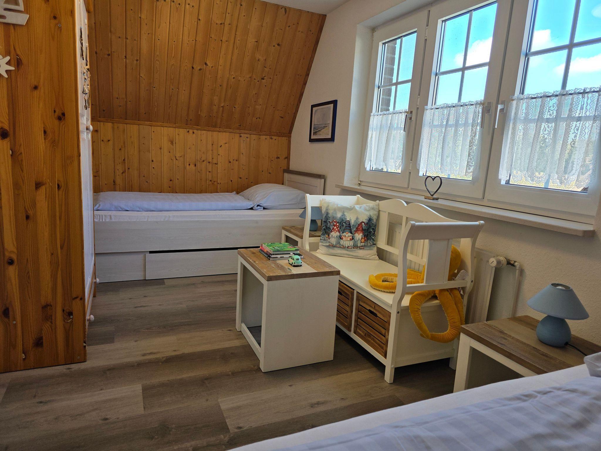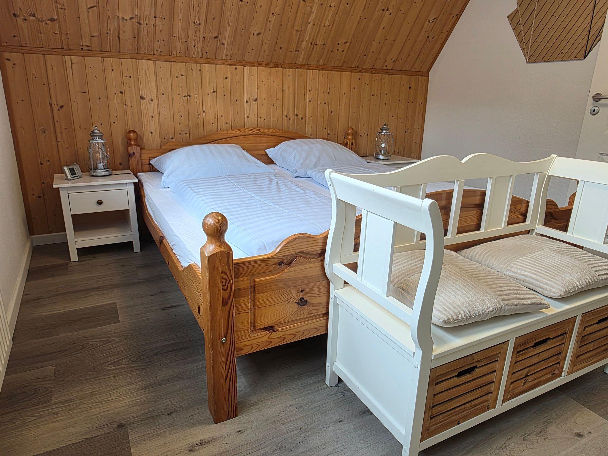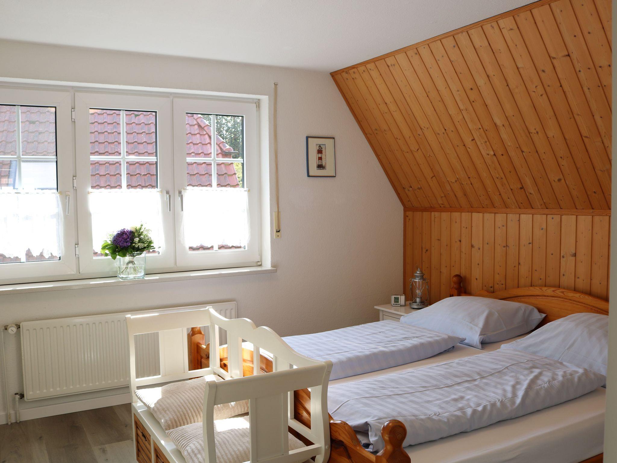 Im ersten Obergeschoß befinden sich ein Schlafzimmer mit Doppelbett und ein Schlafzimmer mit zwei getrennt stehenden Betten sowie das Badezimmer mit Dusche.