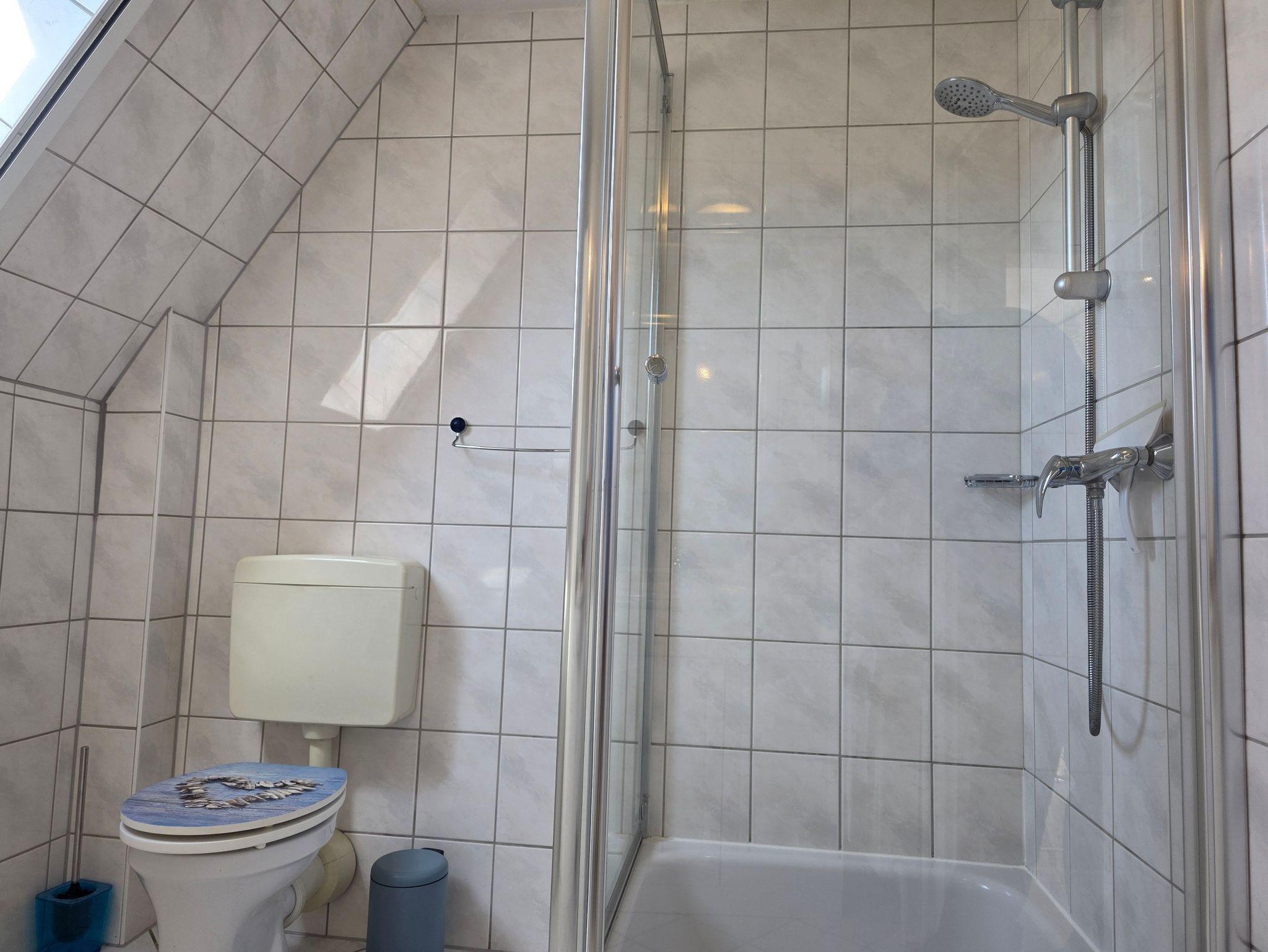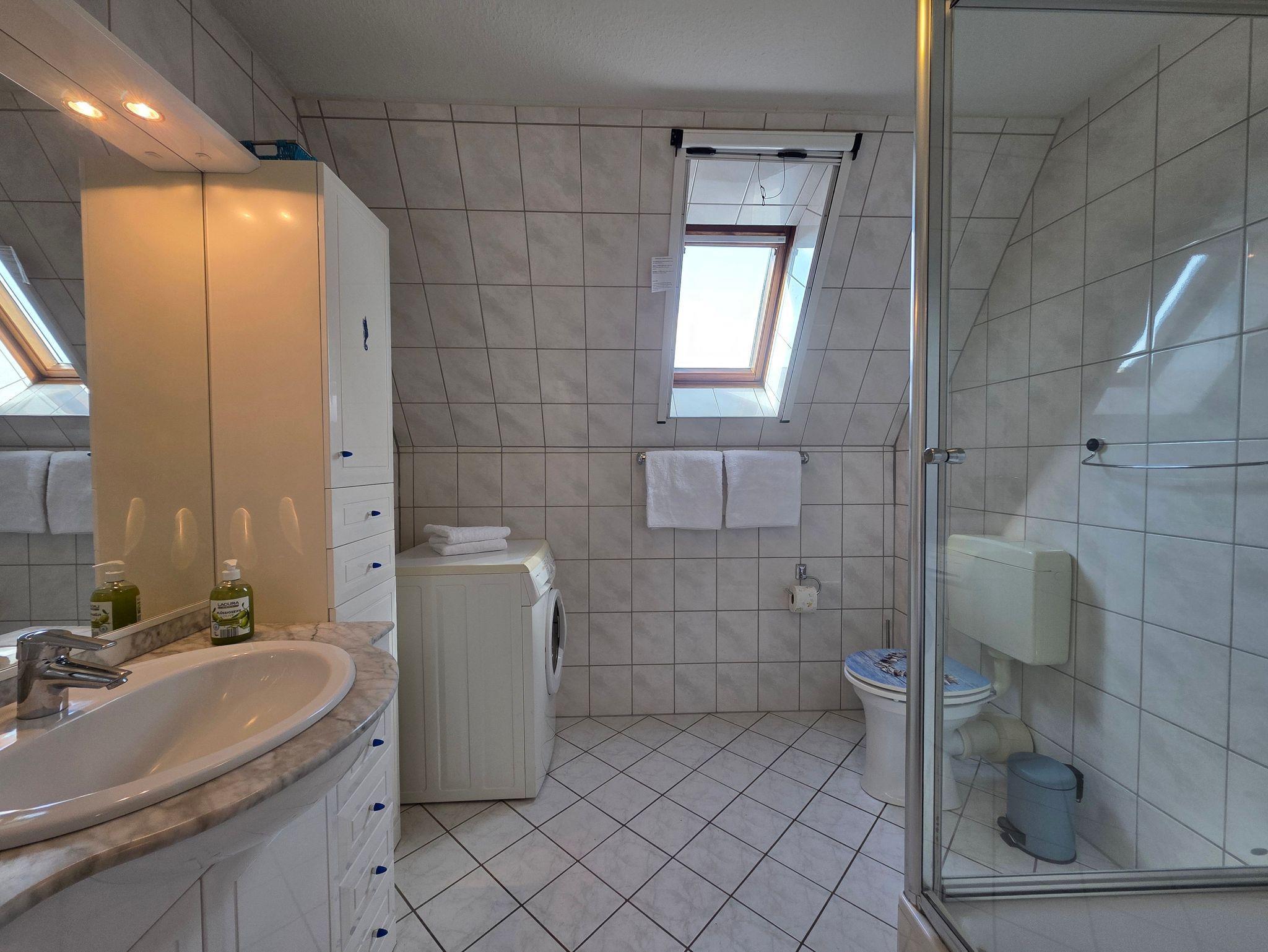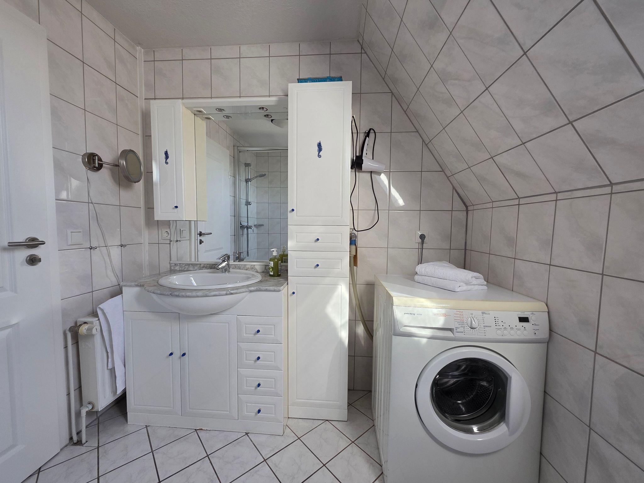 Das Badezimmer im 1. OG verfügt über eine Dusche, Waschbecken, Fön, WC, eine Waschmaschine und ist voll gefliest.