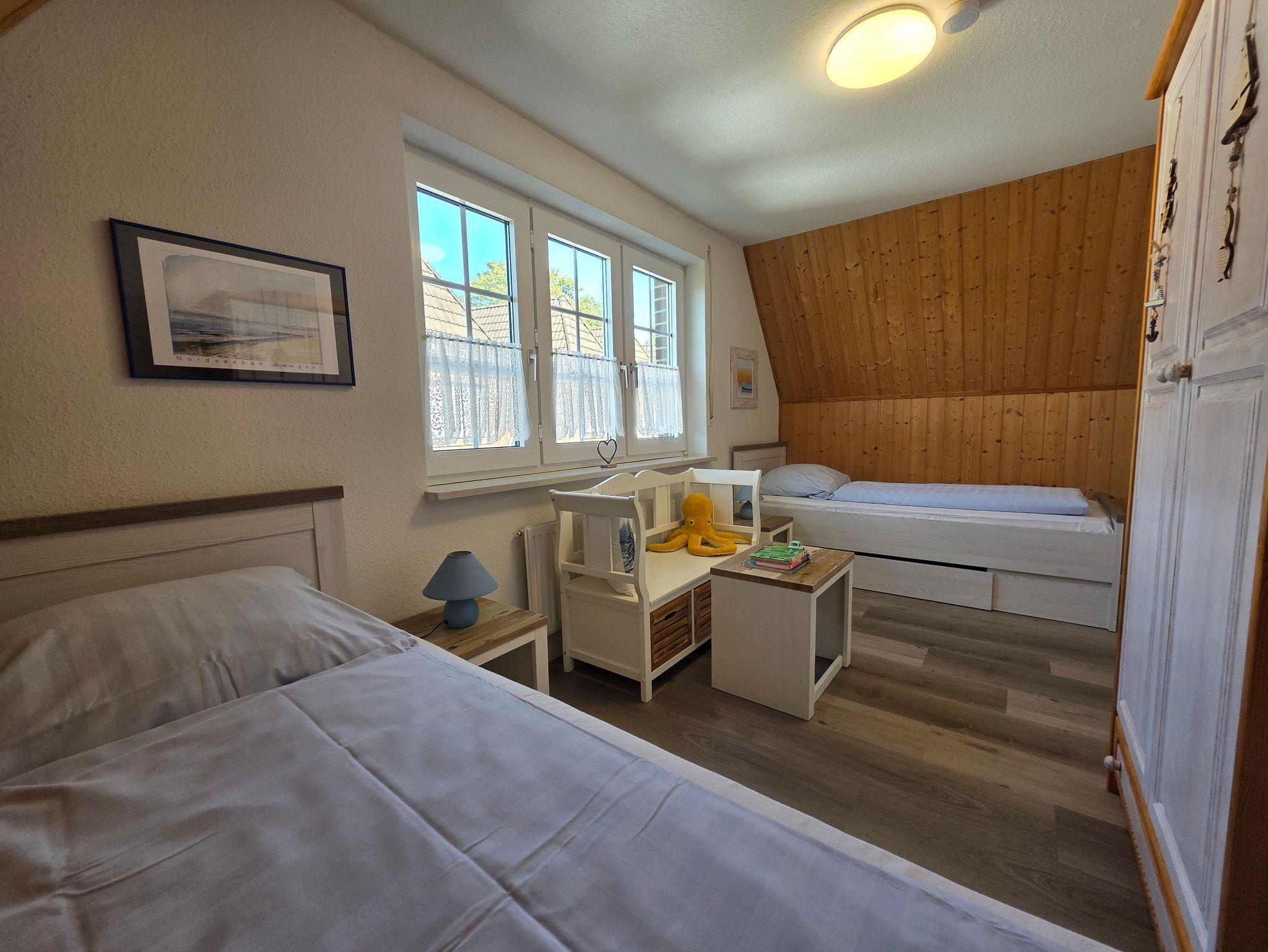 In einem der Schlafzimmer befindet sich ein Doppelbett (180x200cm), im anderen zwei Einzelbetten (90x200cm).