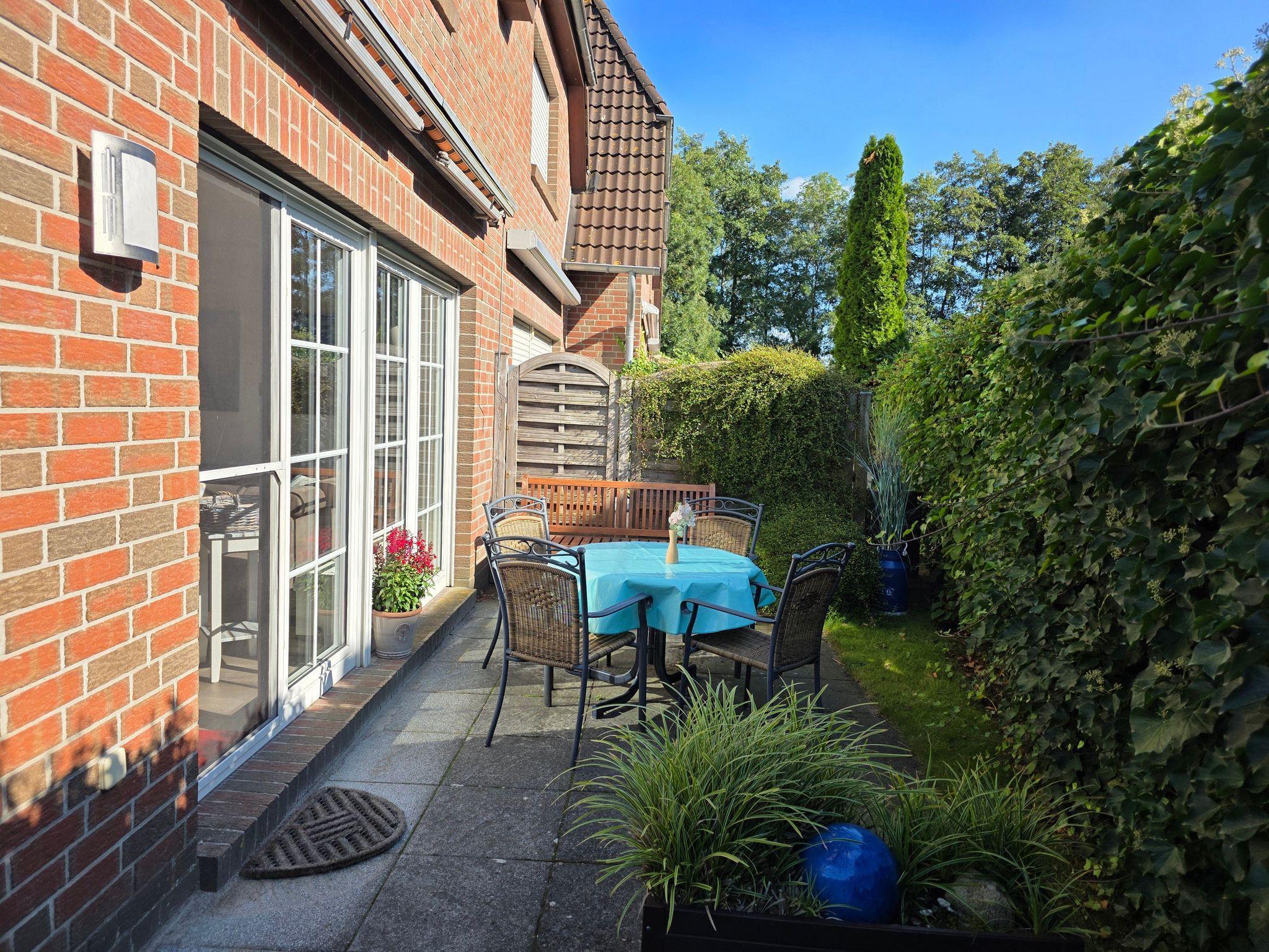 Die an den Wohnbereich anschließende, sichtgeschützte Terrasse mit Gartenmöbeln, Markise und Garten in Südlage lädt zum Verweilen und Sonnenbaden ein.