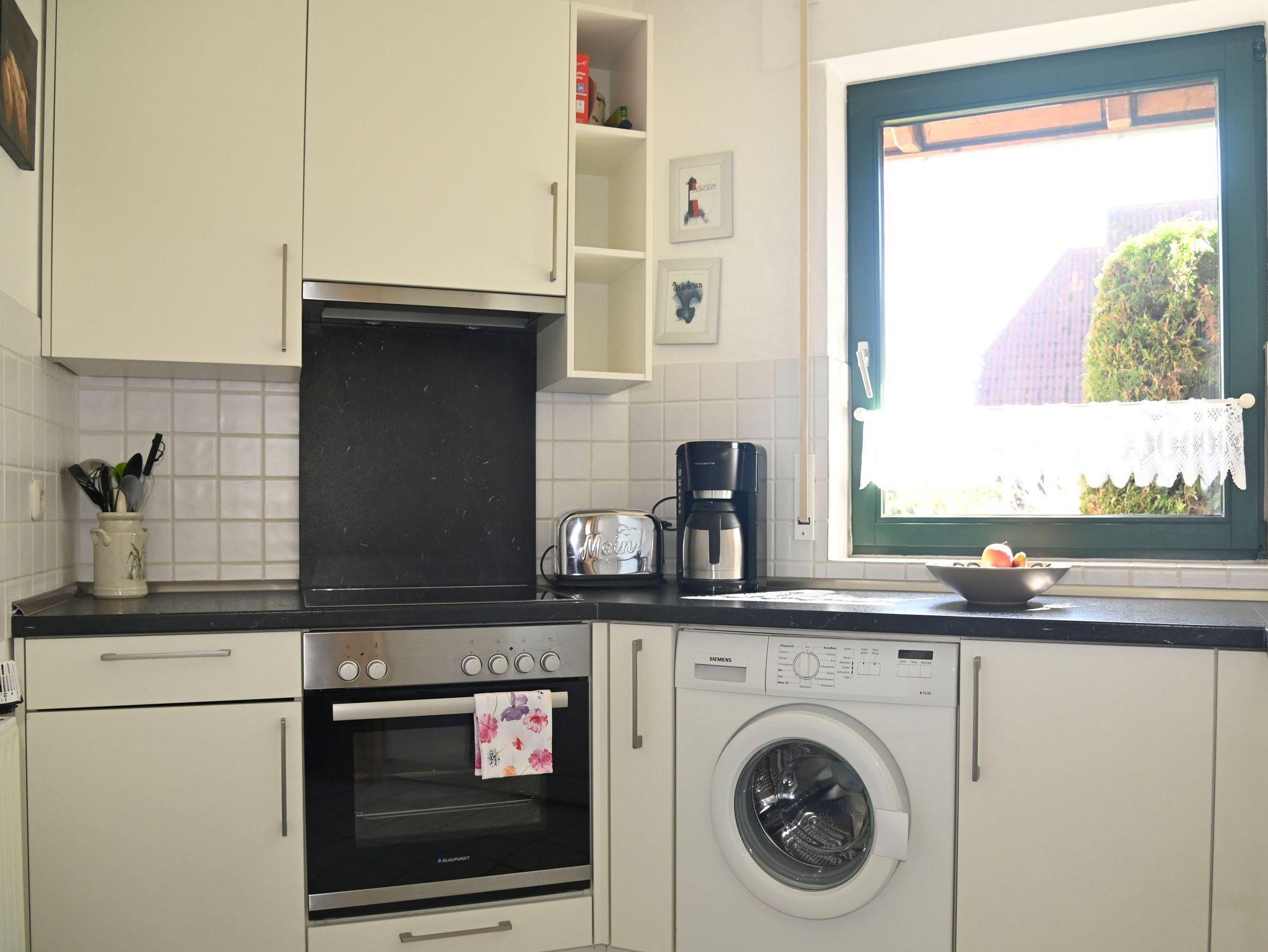 komplett eingerichtet, Spülmaschine, Waschmaschine, E-Herd mit Ceranfeld und Backofen, Kühlschrank mit Gefrierfach, Kaffeemaschine usw.