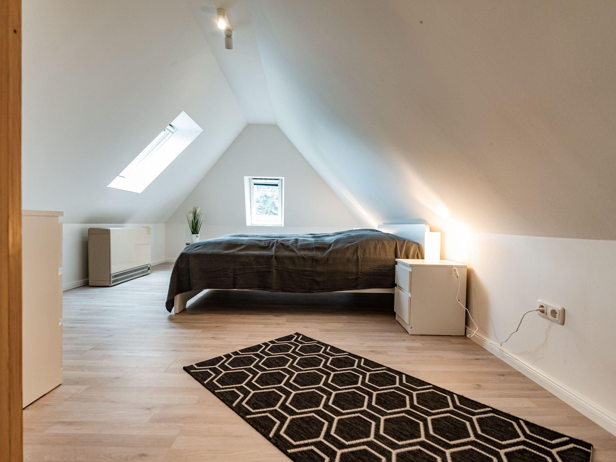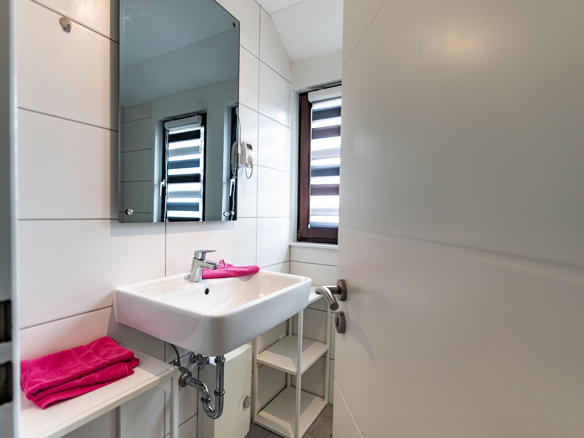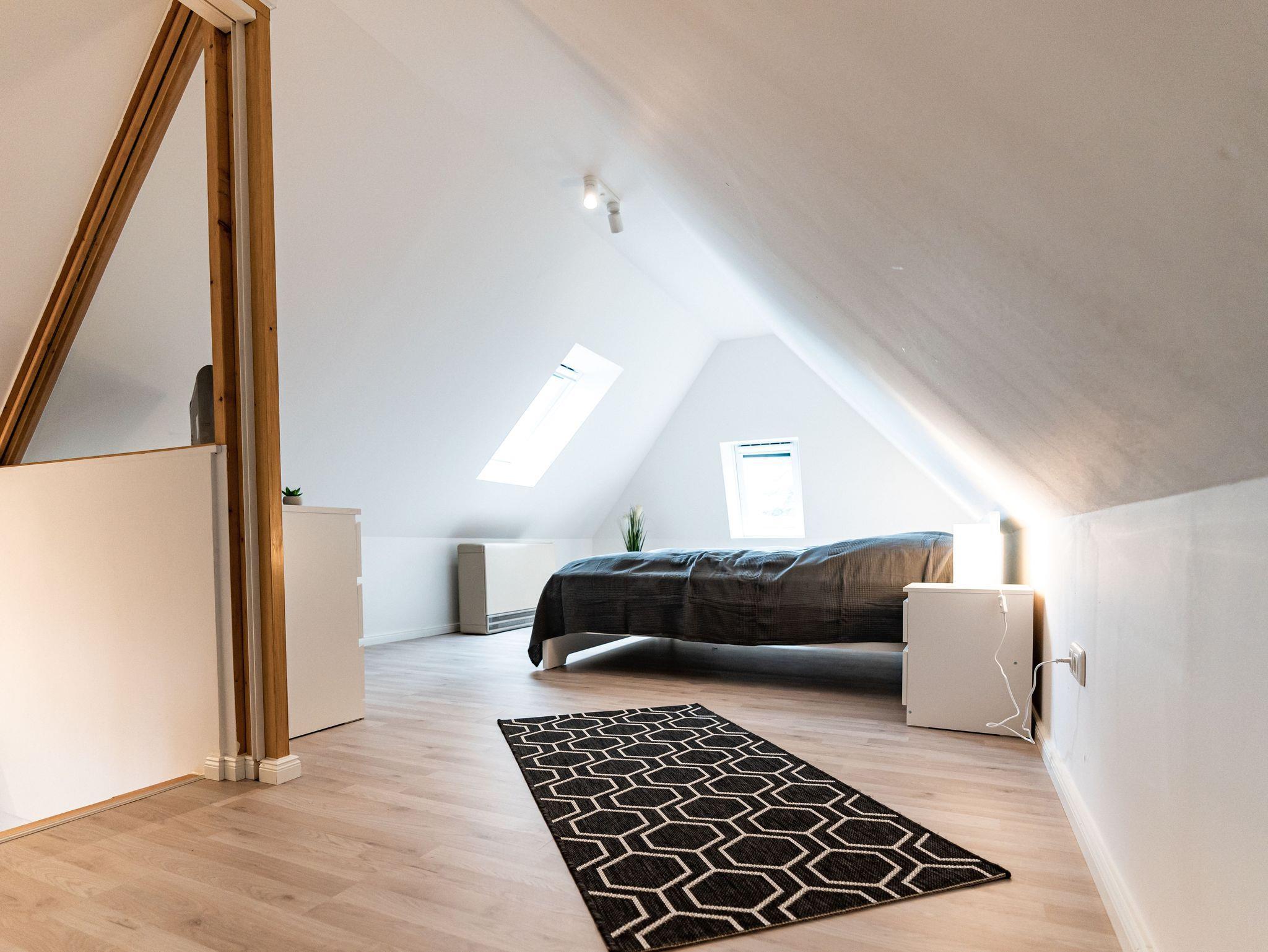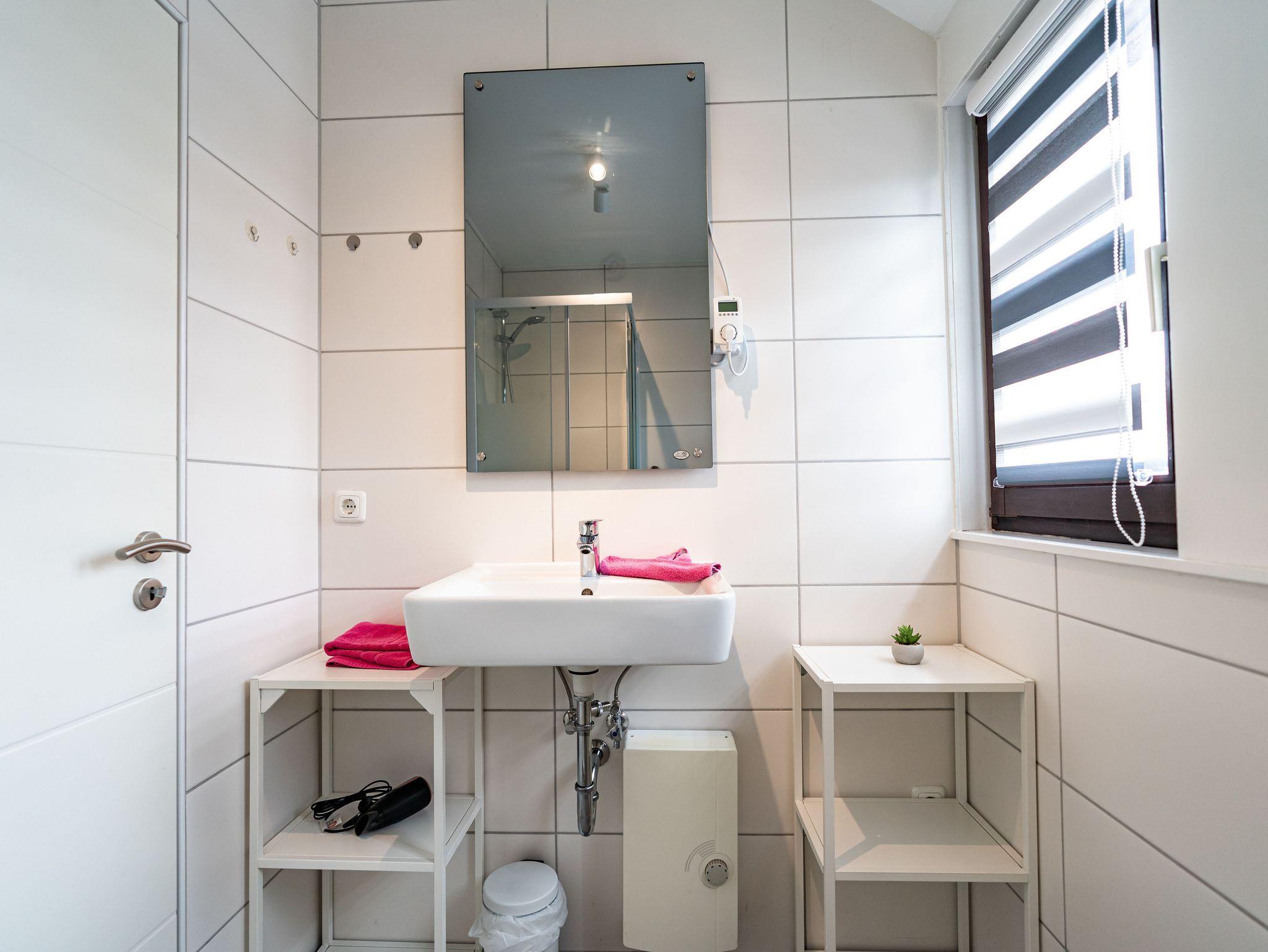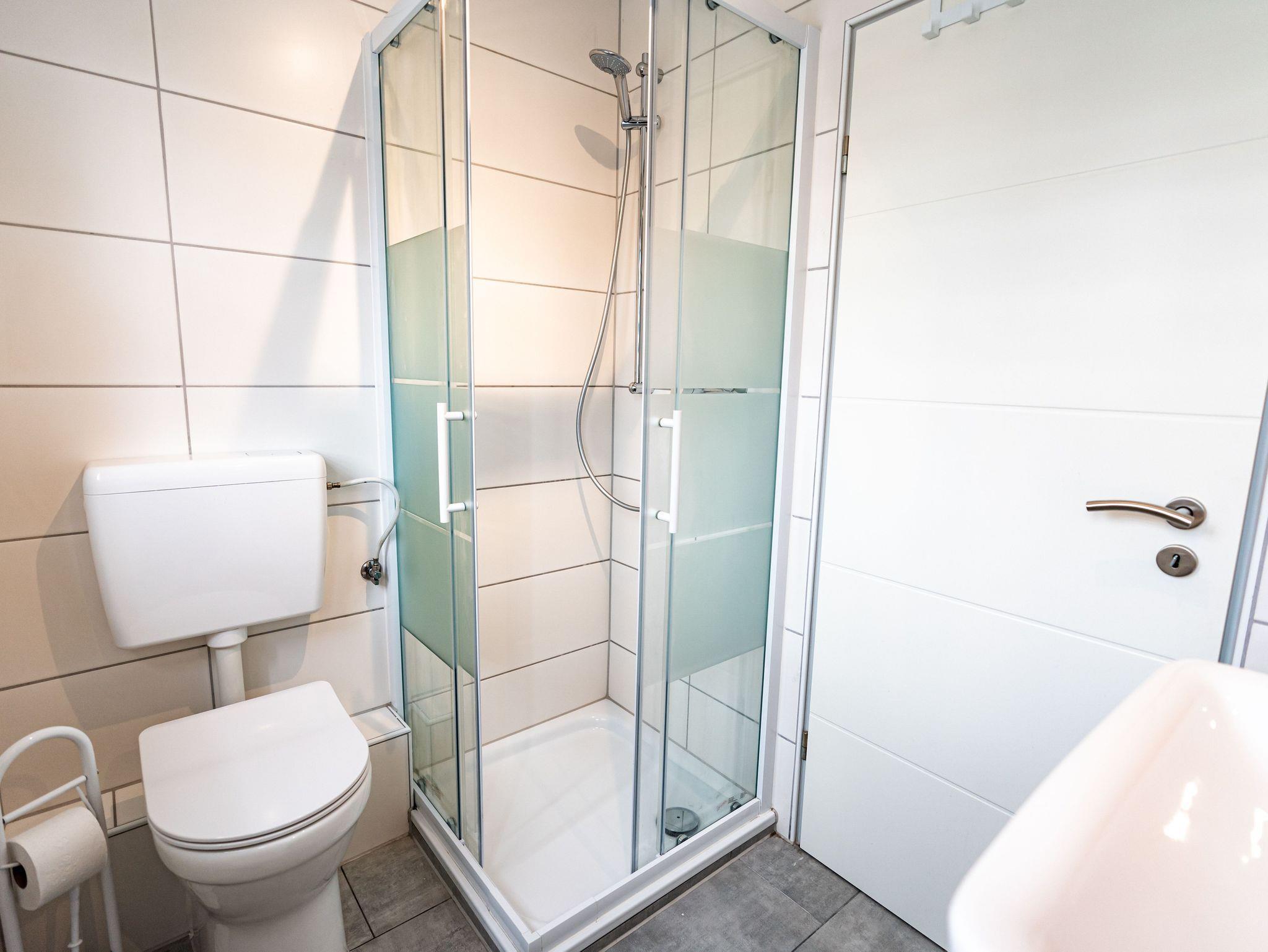 Eine Treppe führt Sie hinauf in die Maisonette-Ebene. Hier befindet sich das zweite Schlafzimmer mit Doppelbett. Das Fenster-Duschbad entspricht dem neuesten Standard.