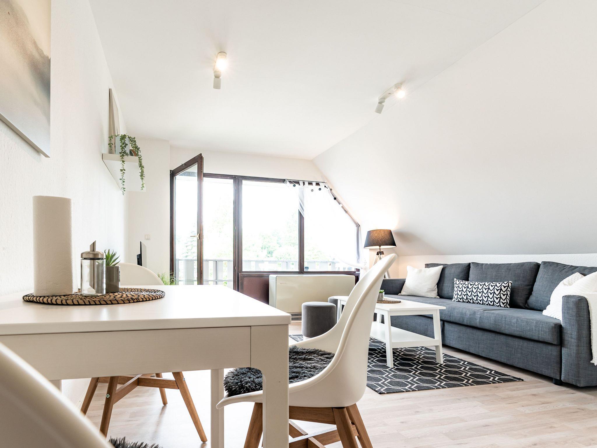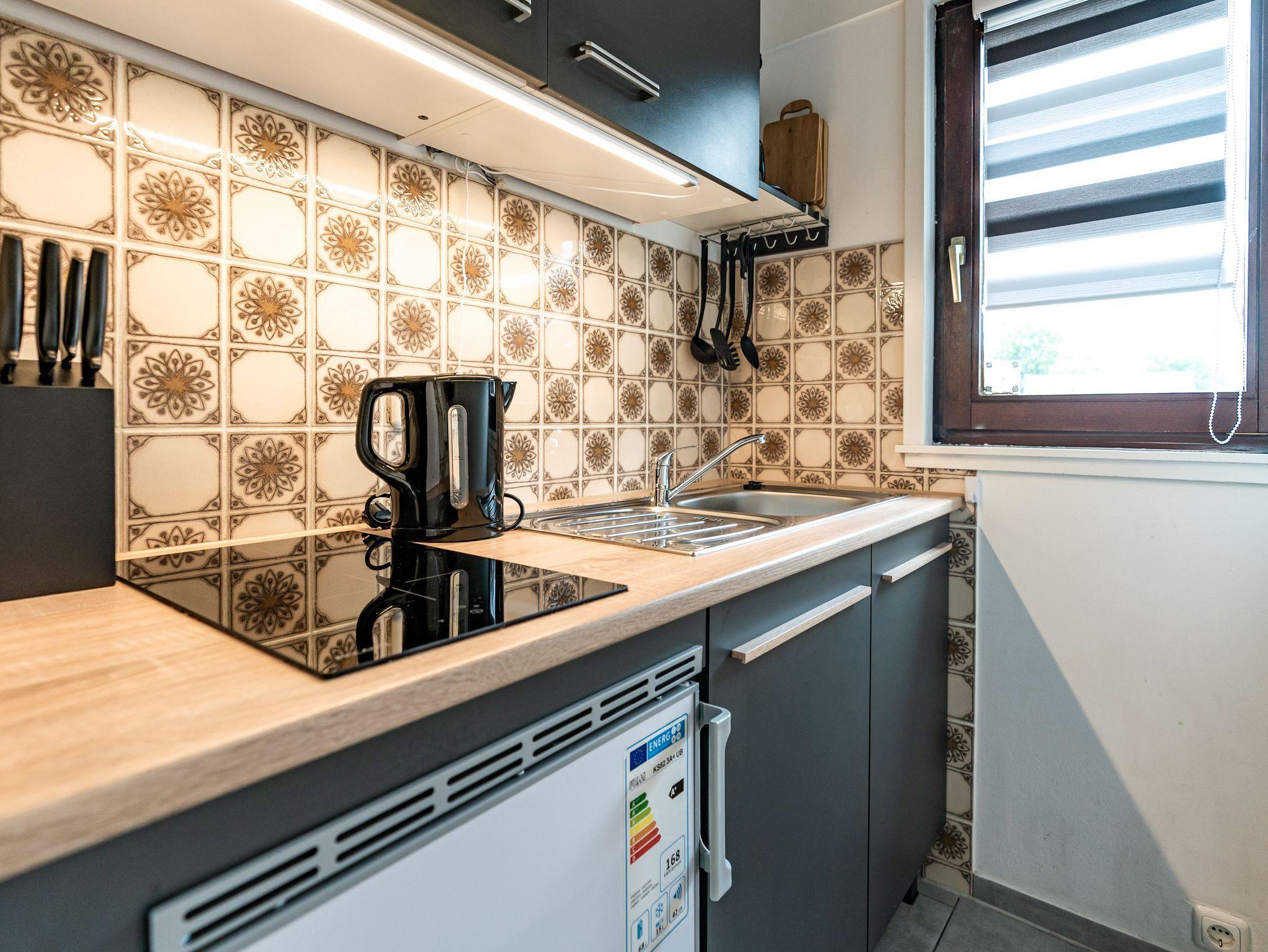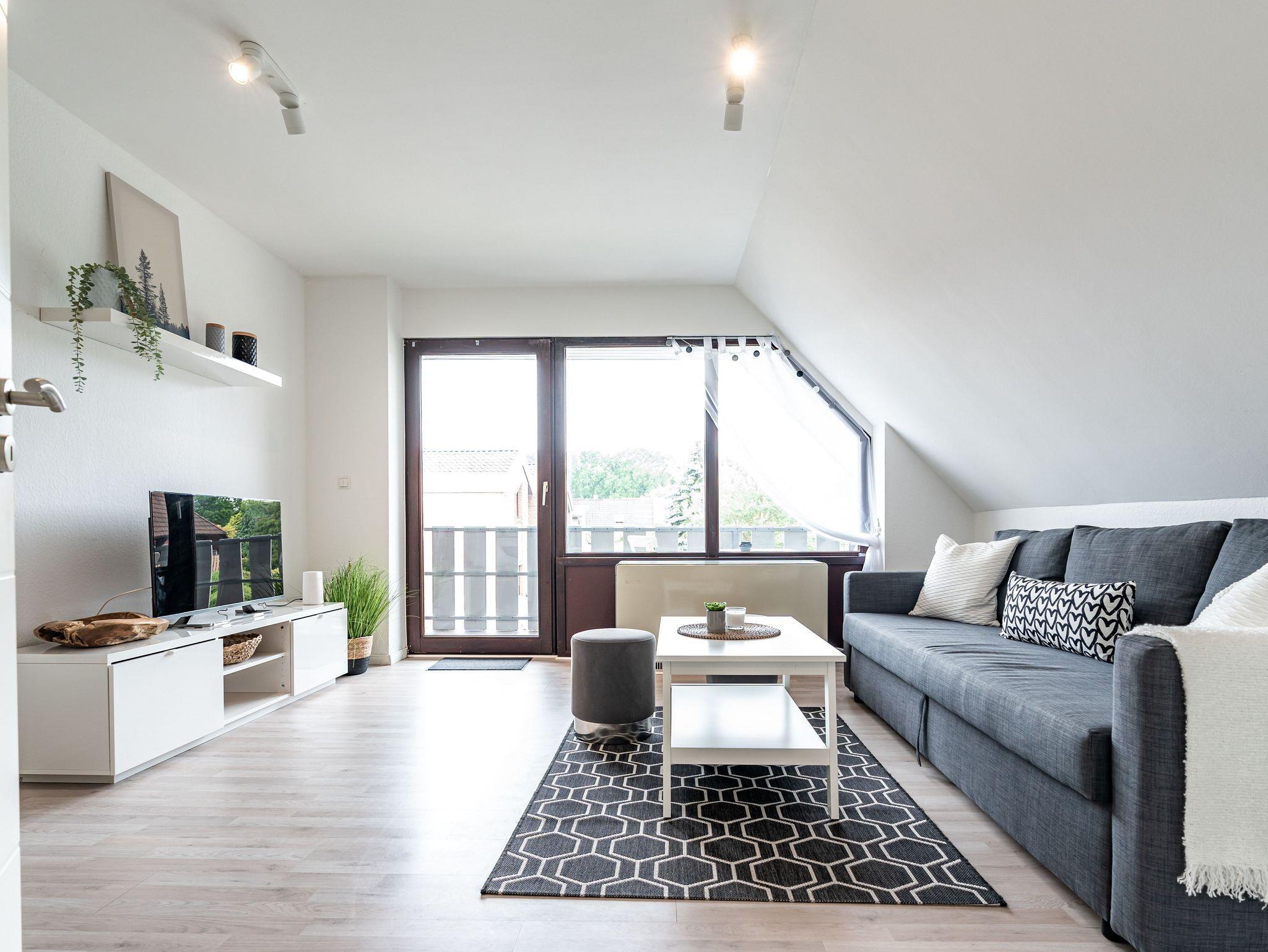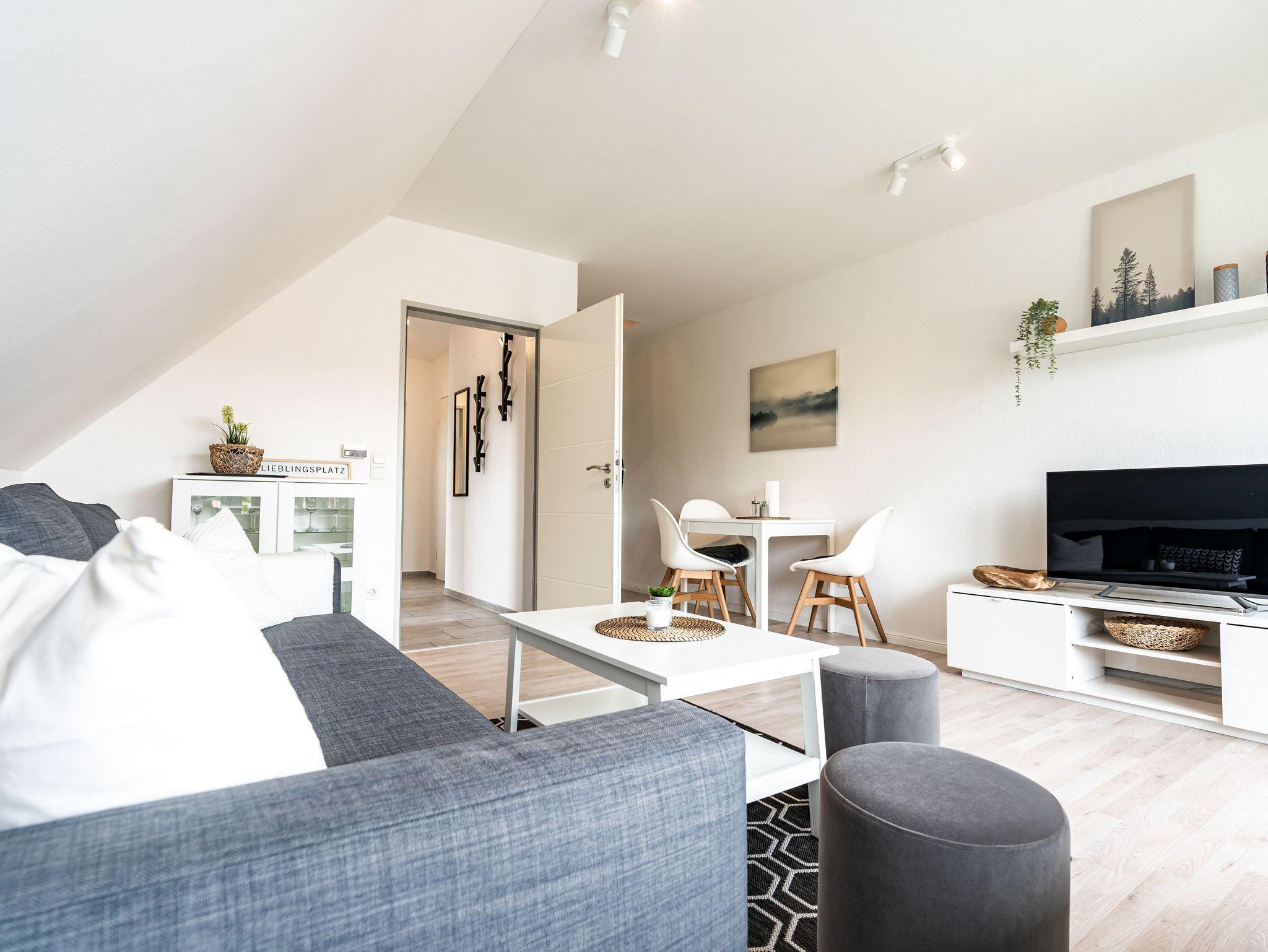 Diese schicke sanierte Oberwohnung mit Stellplatz vor dem Haus in der Humenser Str. 4 garantiert einen entschleunigten Urlaub. Vom Dielenbereich mit Garderobe gelangen Sie in der ersten Ebene ins schicke Wohnzimmer mit vorgelagertem Essplatz und dem ersten Schlafraum mit Doppelbett. Sie genießen dort Blick auf den möblierten Balkon mit Sonnenschutz. Die separat gelegenen Küchenzeile ist klein, aber fein, und für die Zielgruppe gedacht, die eher weniger Kochambitionen hat.