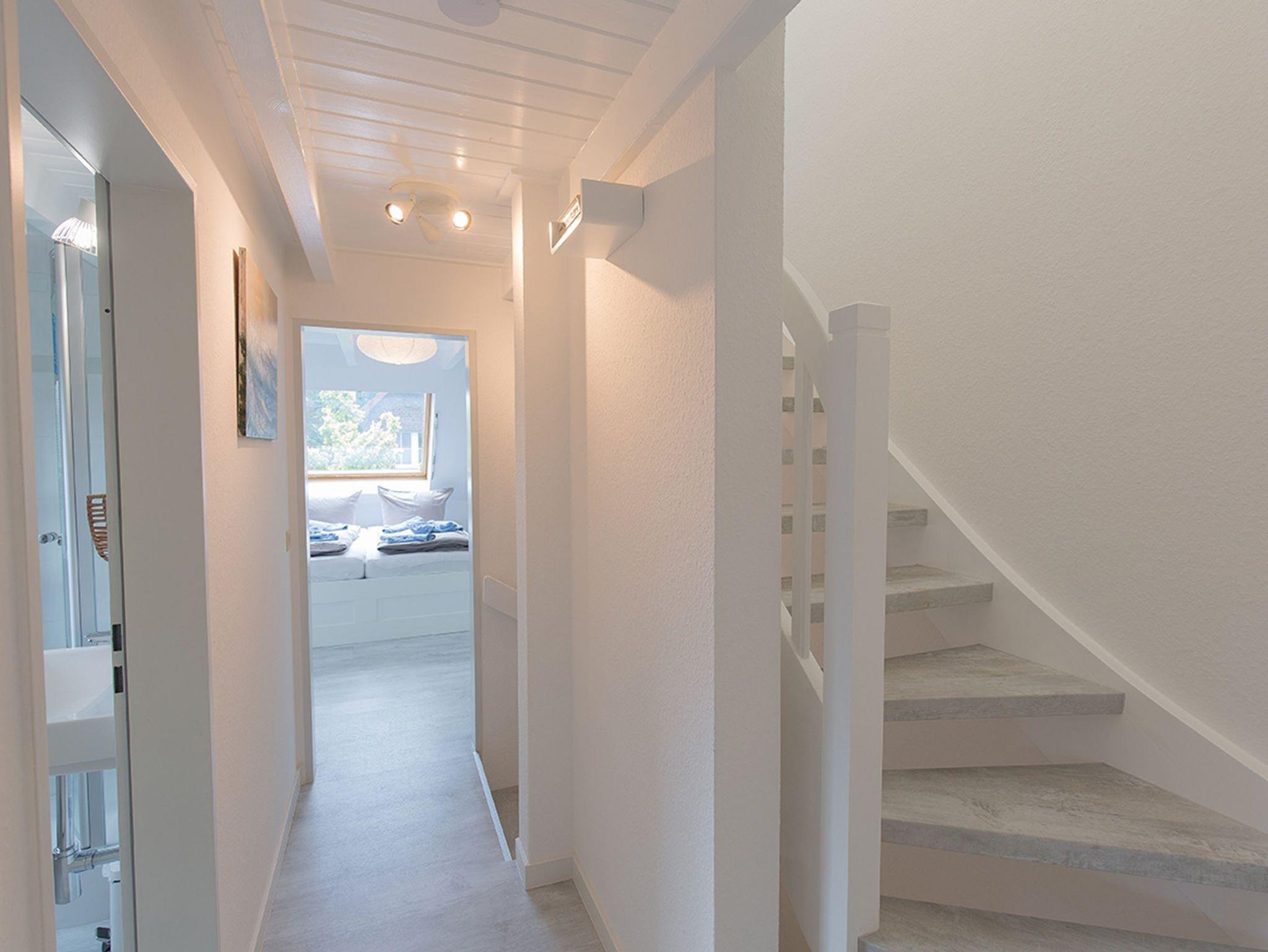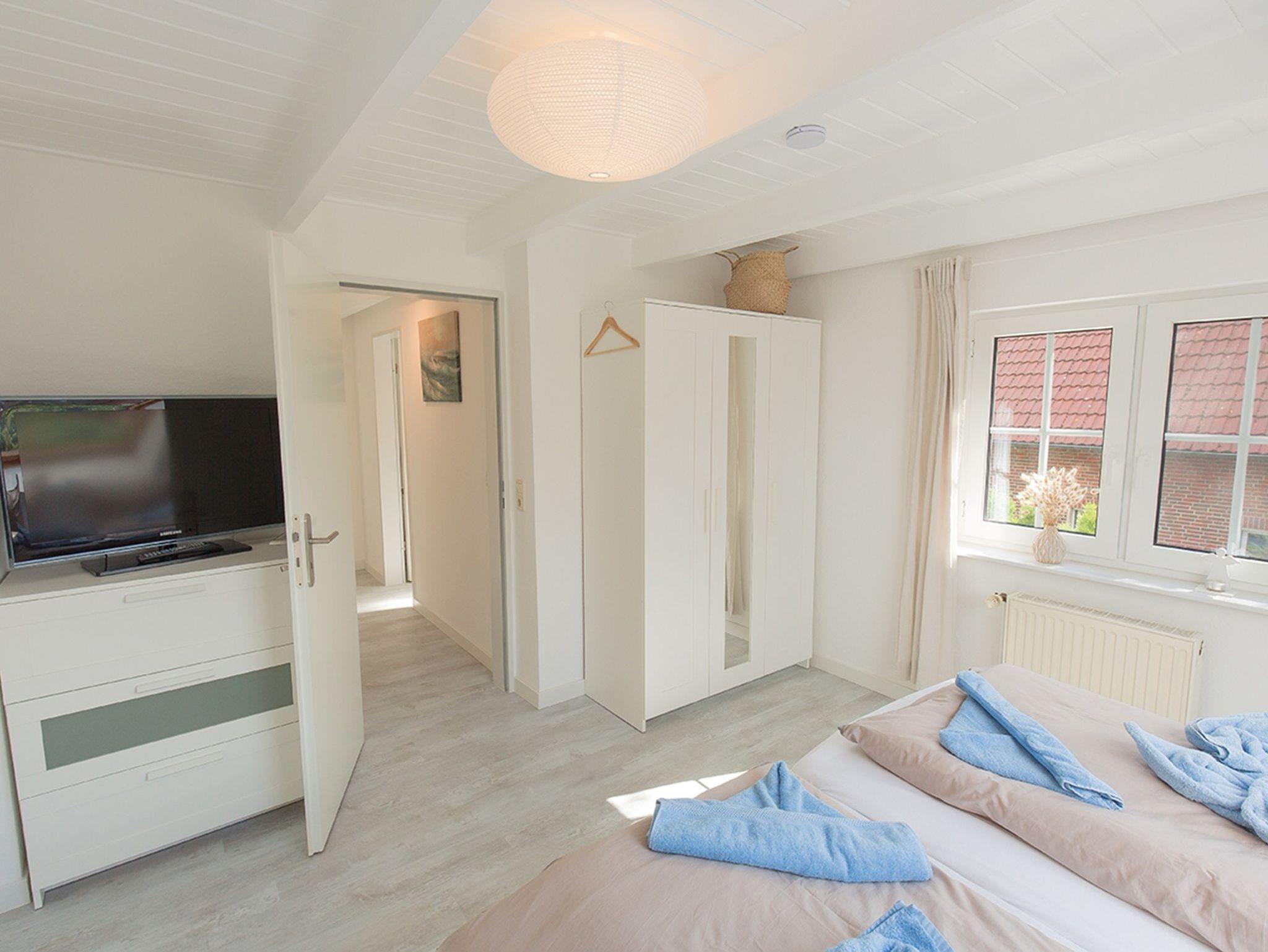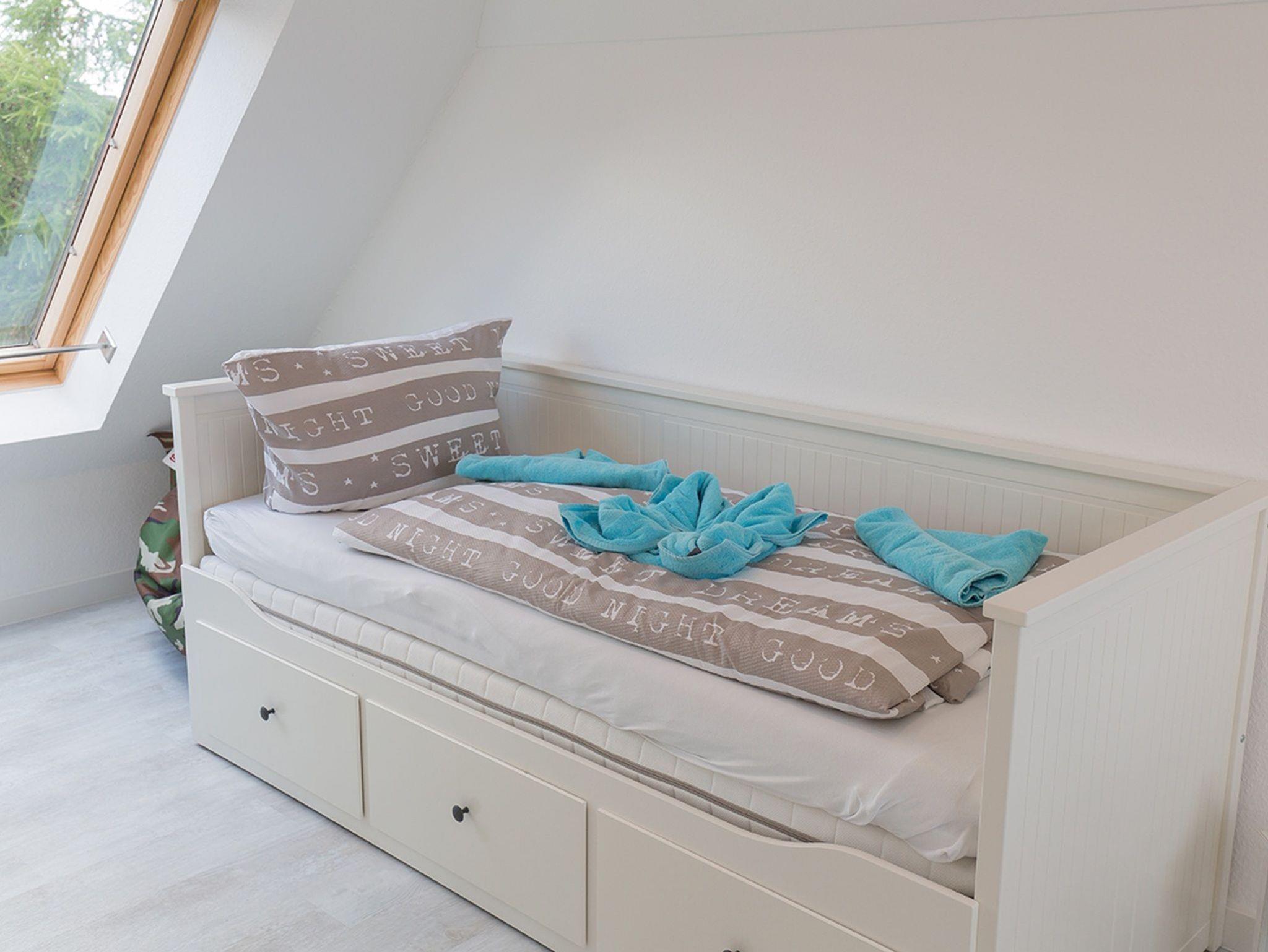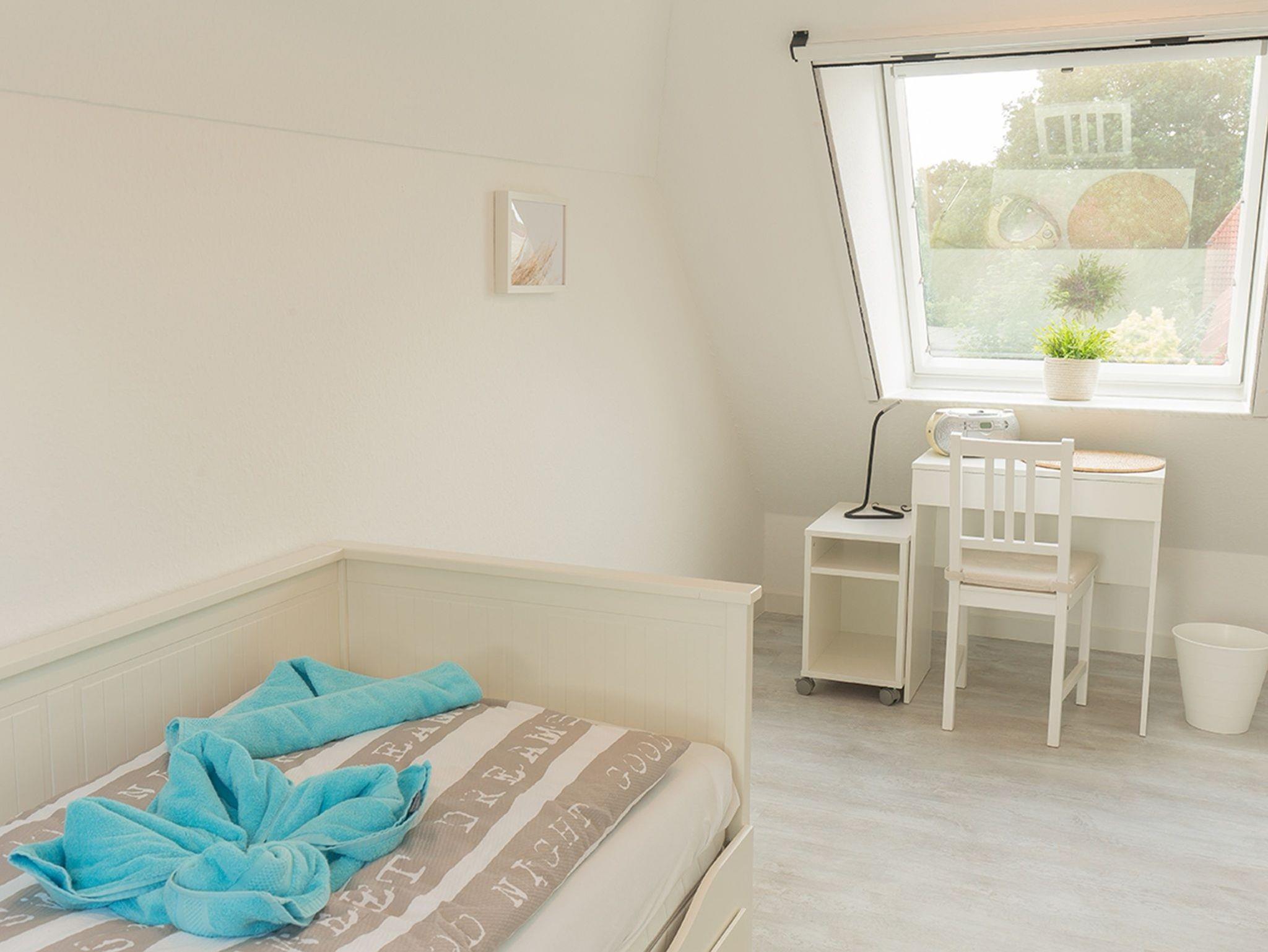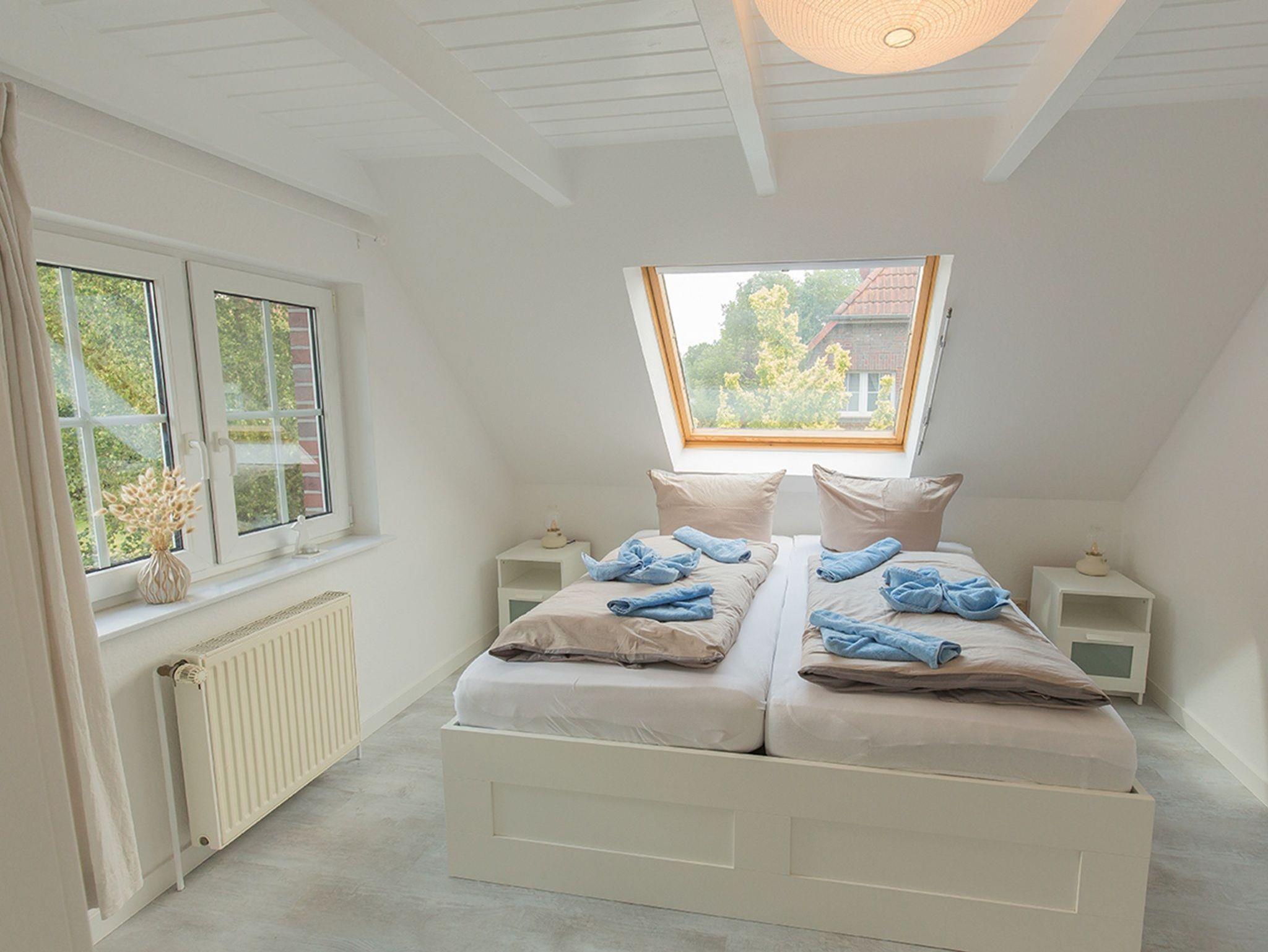 Ein weiteres geräumiges Schlafzimmer liegt im Dachgeschoss mit großen Fenstern und Aussicht über Dangast. Alle Fenster des Hauses verfügen über einen Mückenschutz.