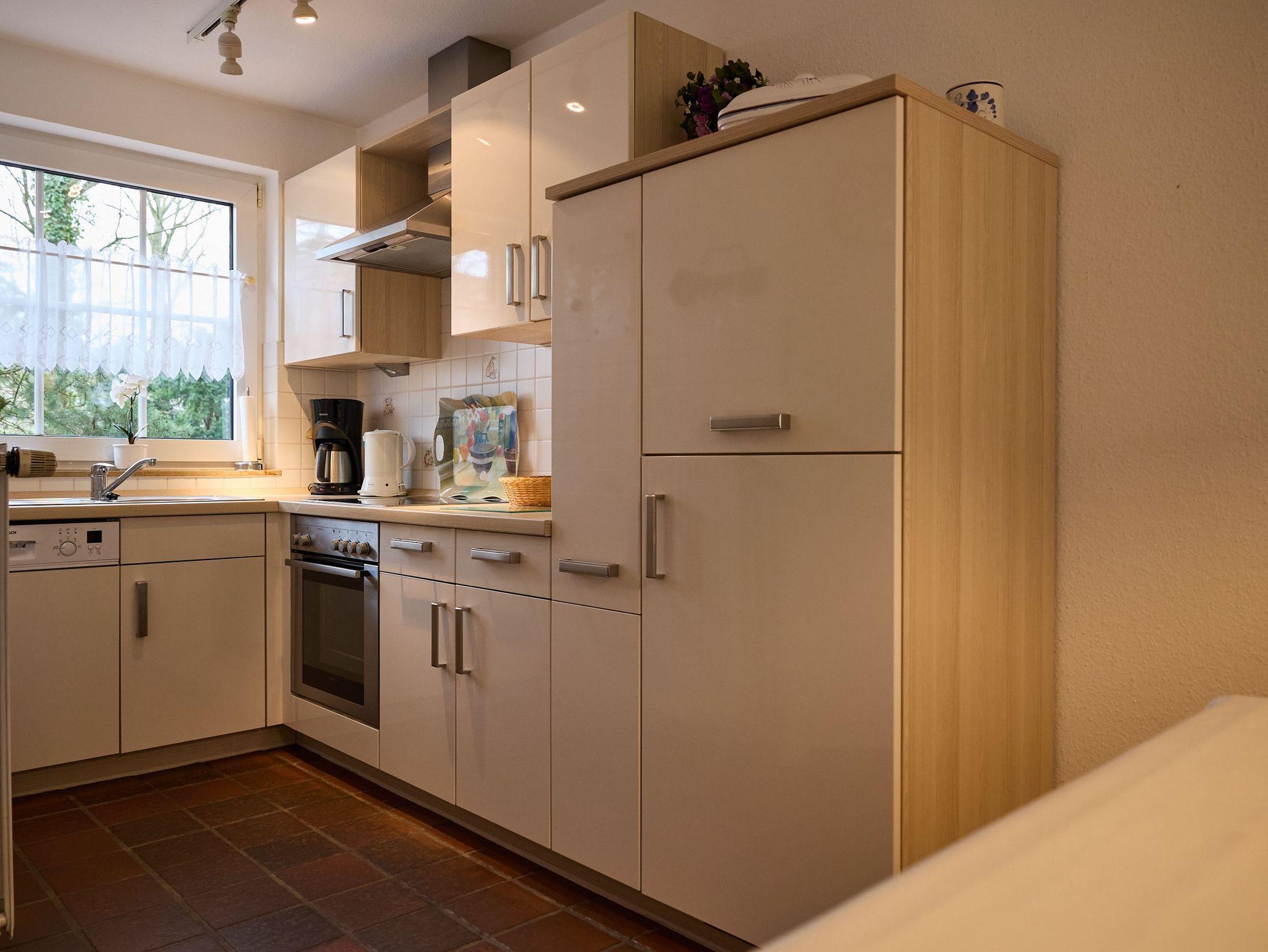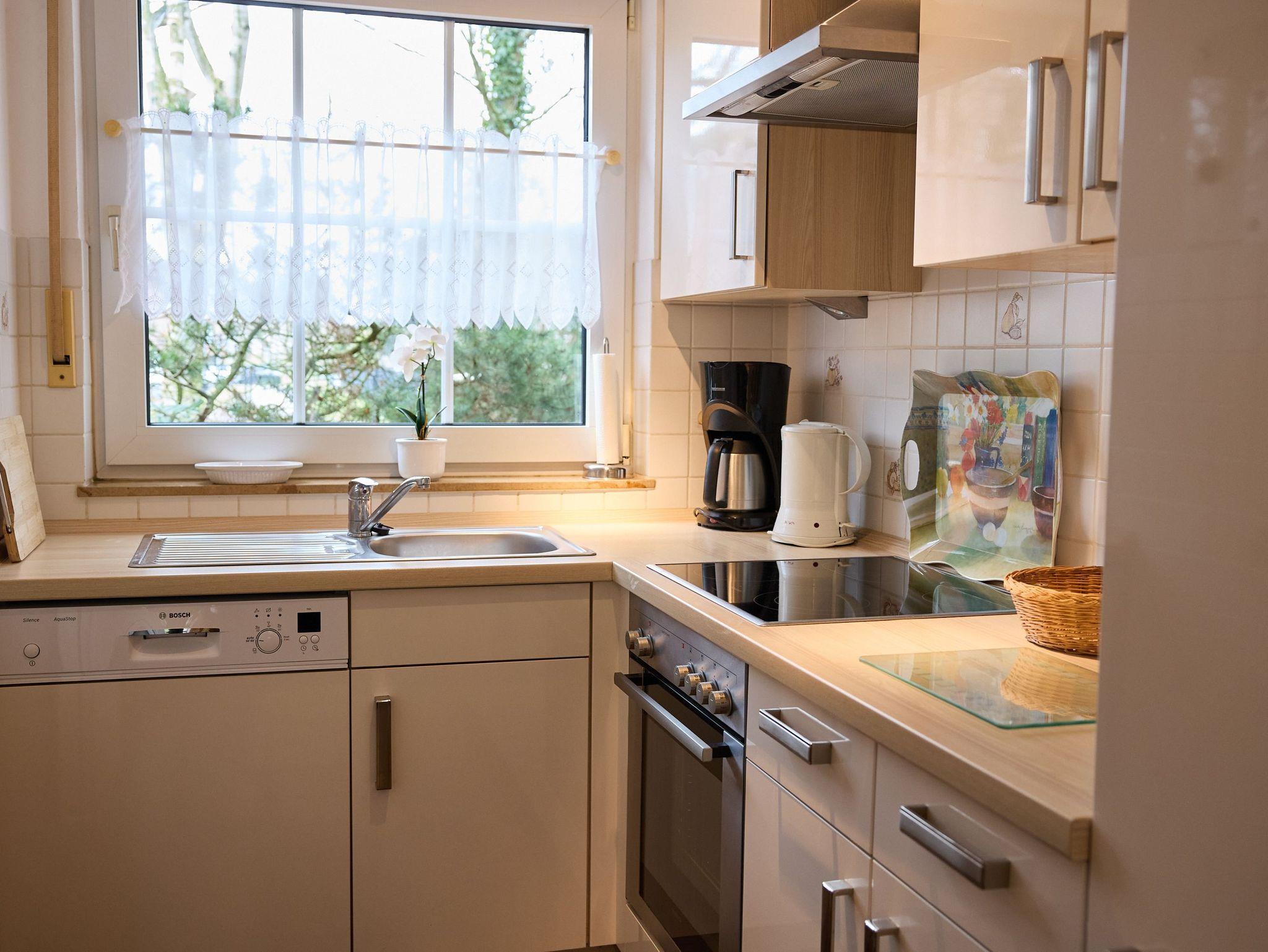 kombinierter Wohn- und Essbereich mit komplett ausgestatteter Einbauküche (u.a. Geschirrspülmaschine, Gefrierfach, Mikrowelle, Kaffeemaschine, Eierkocher, Toaster)