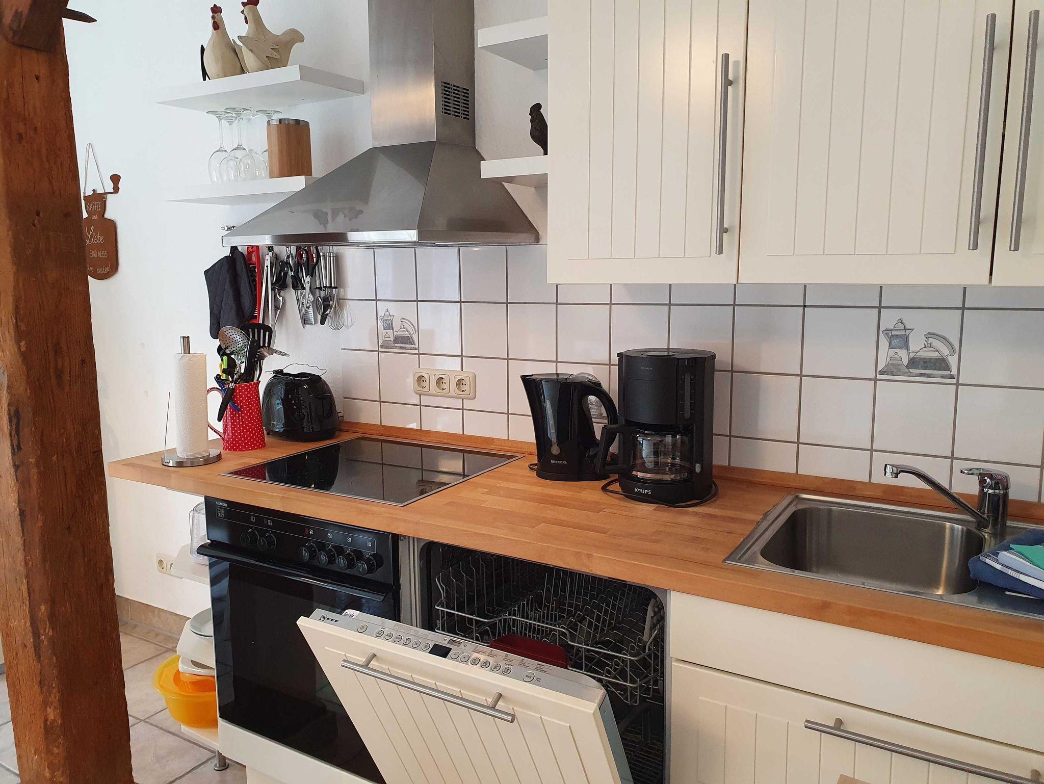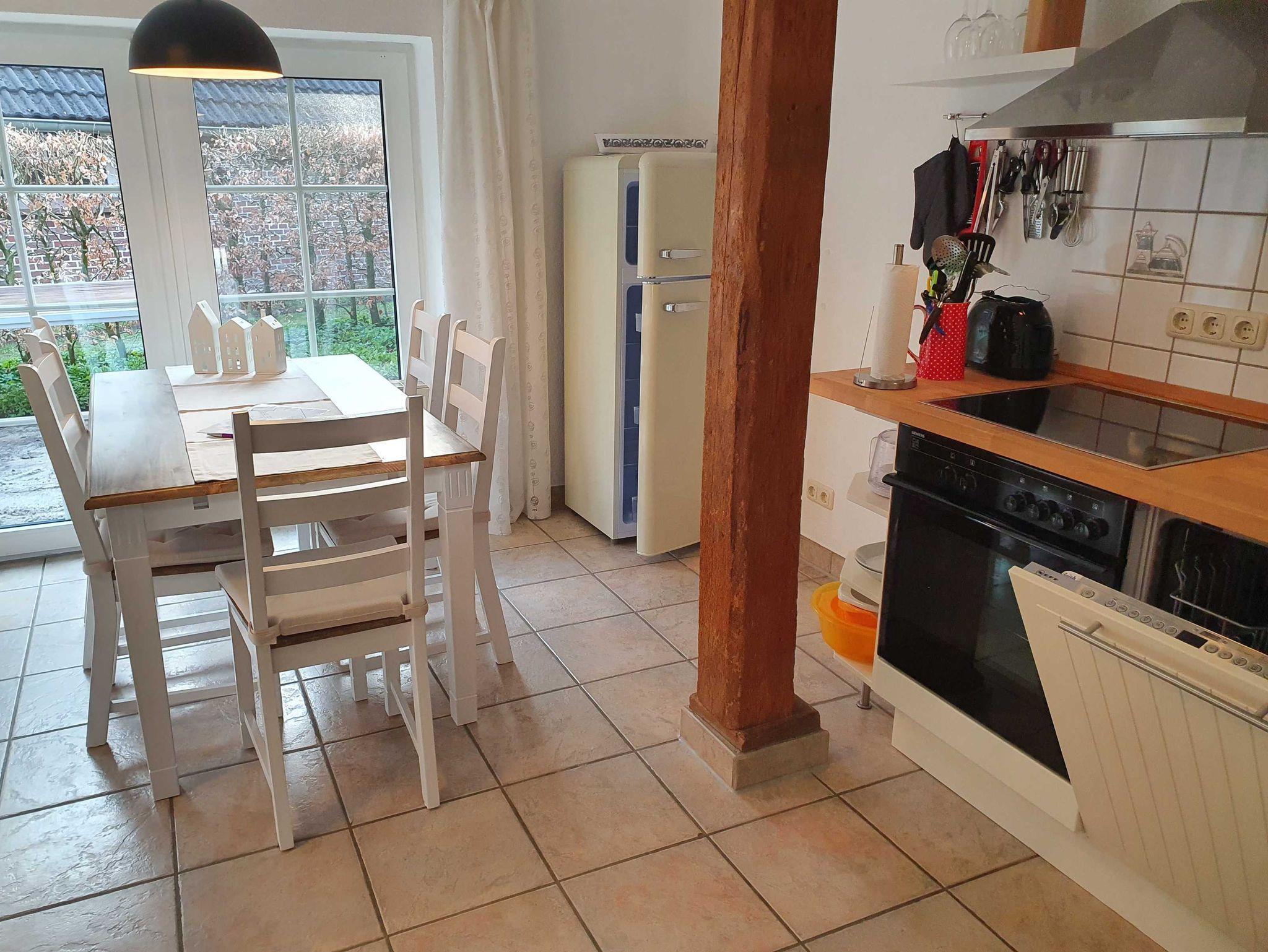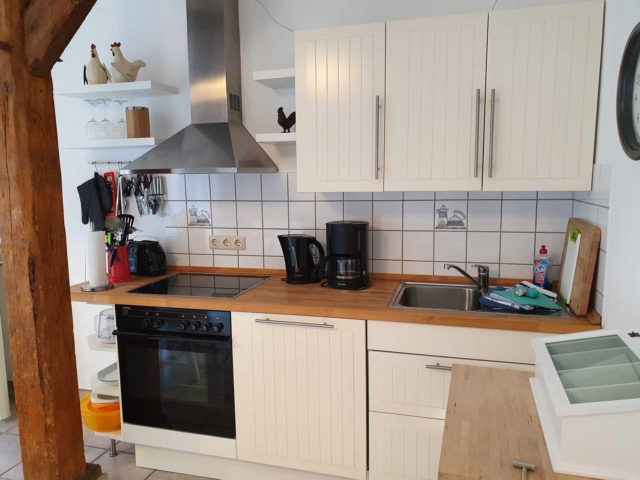 Schöne großzügige Ferienwohnung über zwei Etagen im ehemaligen Pferdestall unseres Hofes. Im Erdgeschoss gibt es ein Schlafzimmer mit einem großen Doppelbett, ein Duschbad (mit Fön) und die Wohnküche (mit Spülmaschine), von der Sie einen Zugang zur privaten Terrasse haben.