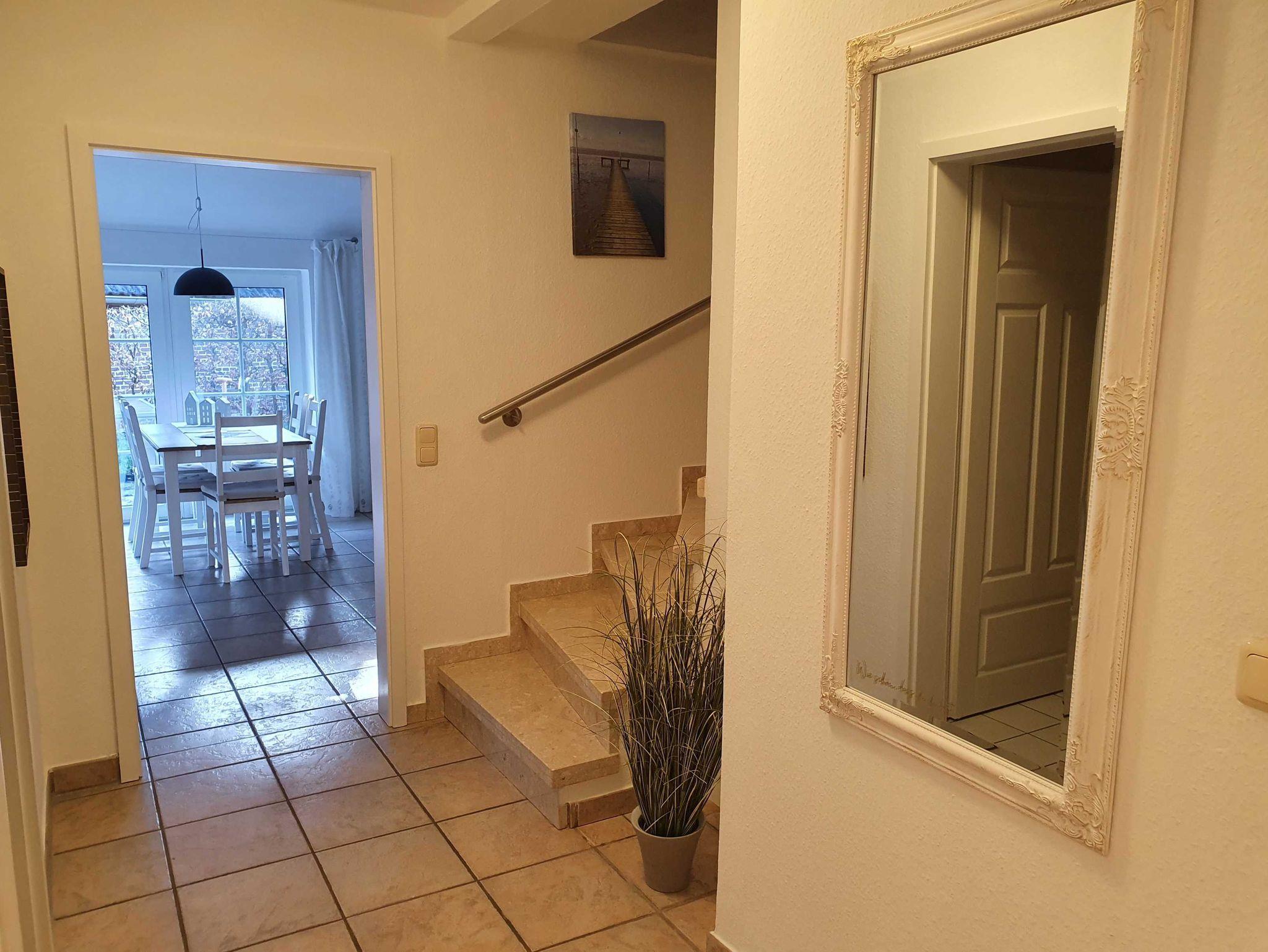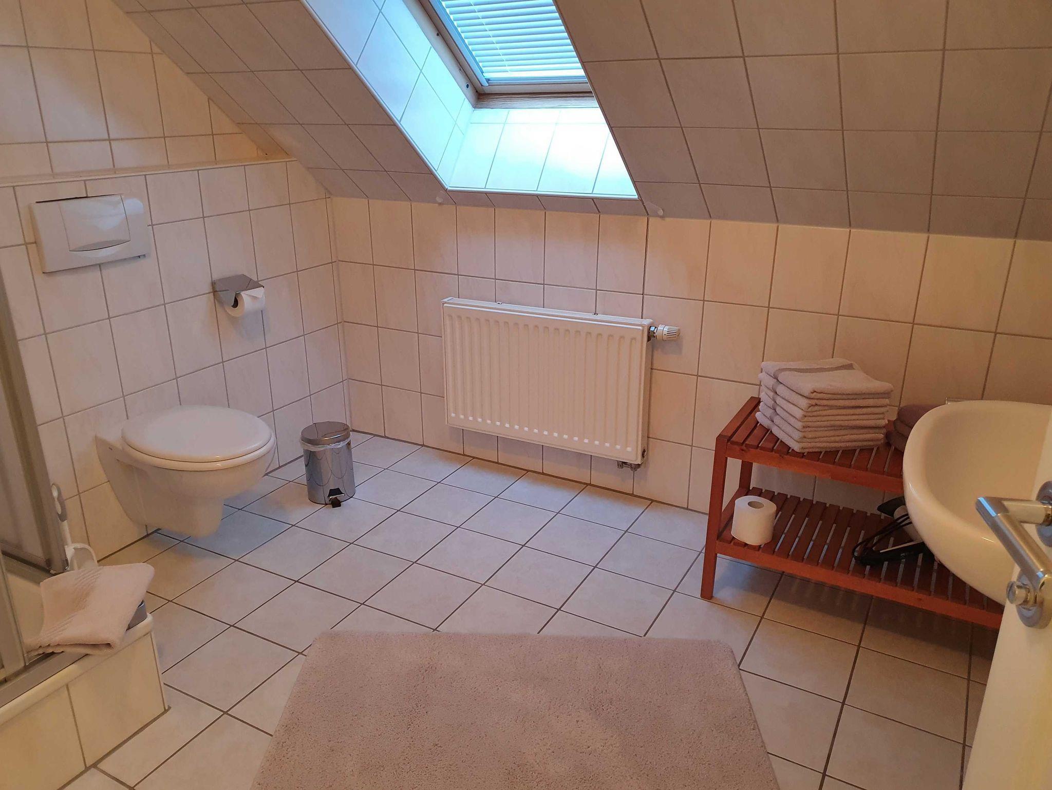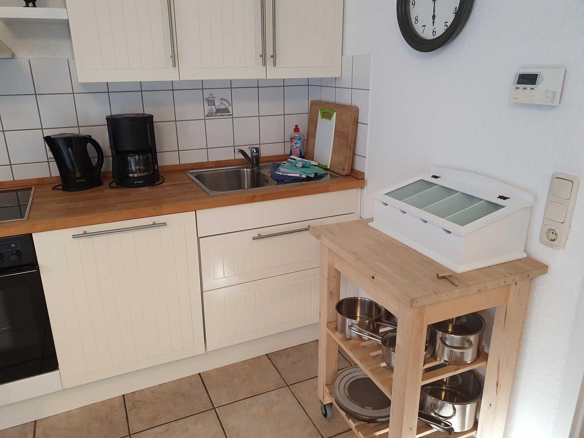Schöne großzügige Ferienwohnung über zwei Etagen im ehemaligen Pferdestall unseres Hofes. Im Erdgeschoss gibt es ein Schlafzimmer mit einem großen Doppelbett, ein Duschbad (mit Fön) und die Wohnküche (mit Spülmaschine), von der Sie einen Zugang zur privaten Terrasse haben.
