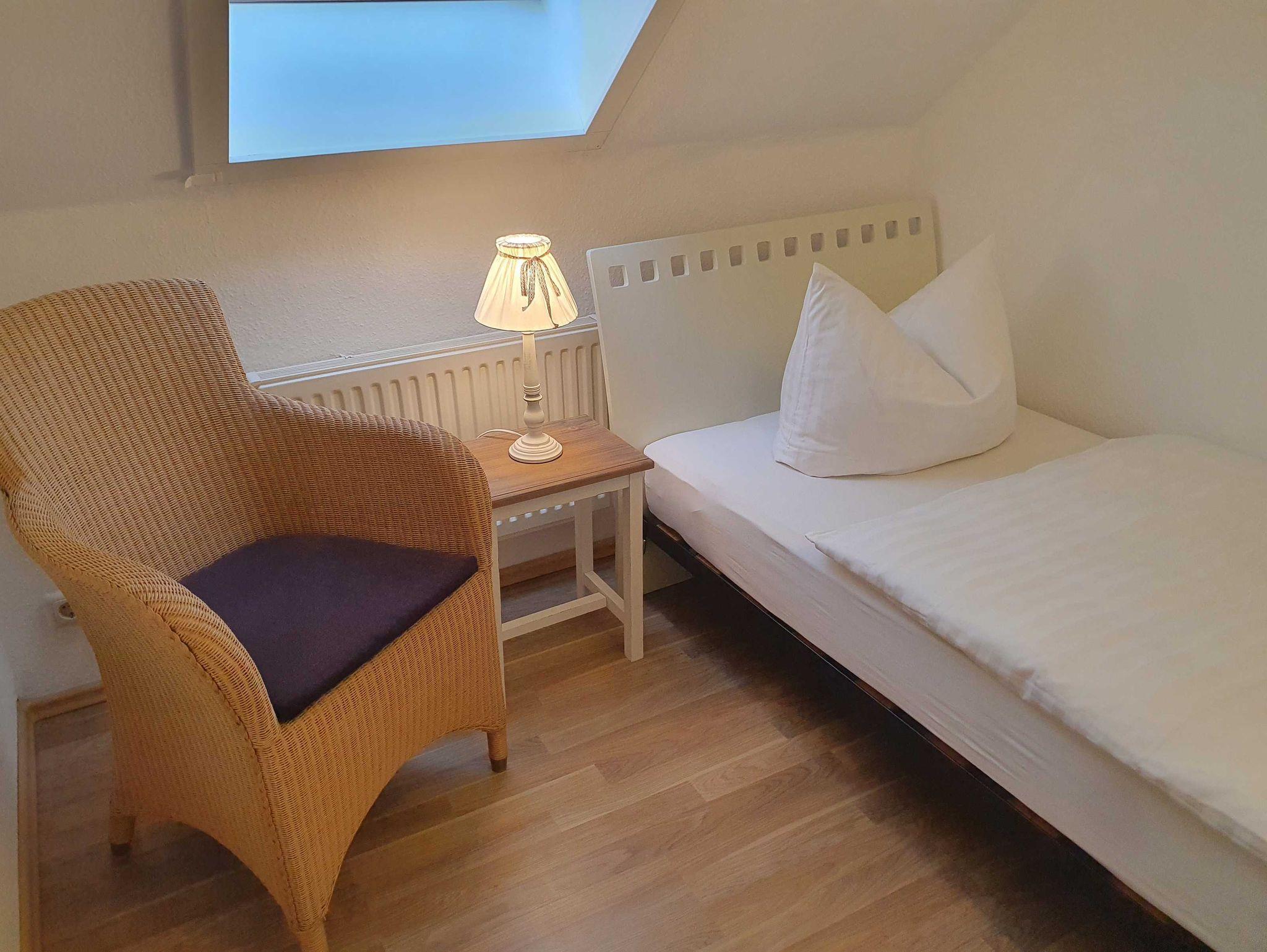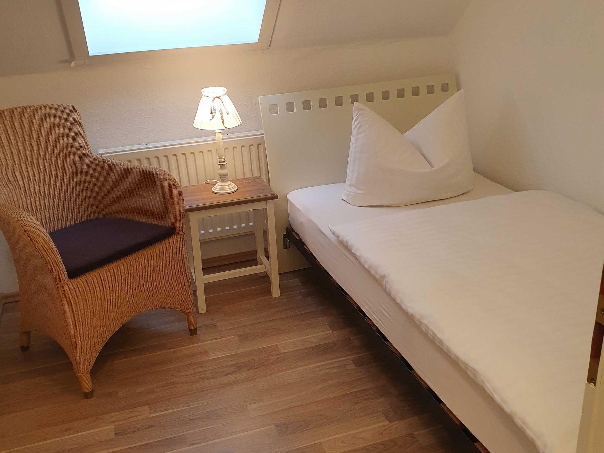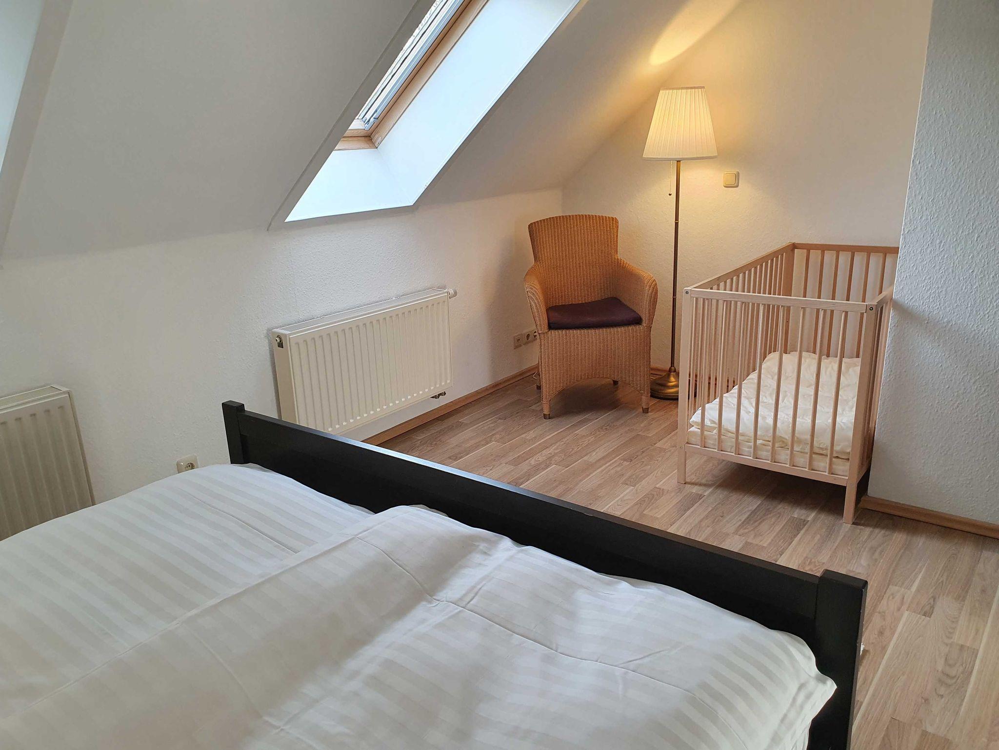 Im ersten Stock befindet sich ein weiteres Schlafzimmer mit einem Doppelbett (ein Babybett für Kleinkinder bis 2 Jahre steht zur Verfügung) sowie ein kleines Zimmer mit einem Einzelbett und ein weiteres Duschbad (mit Fön).