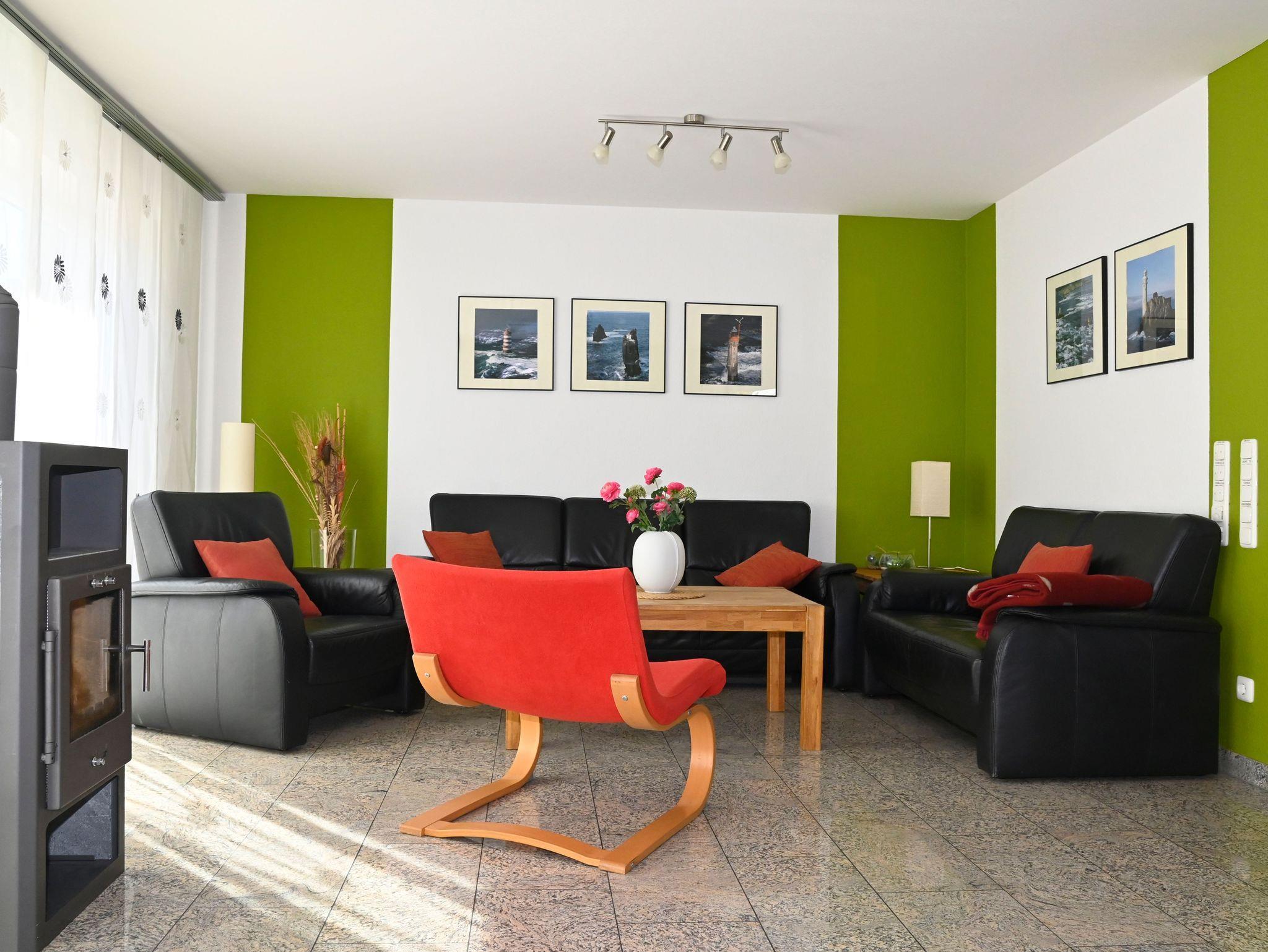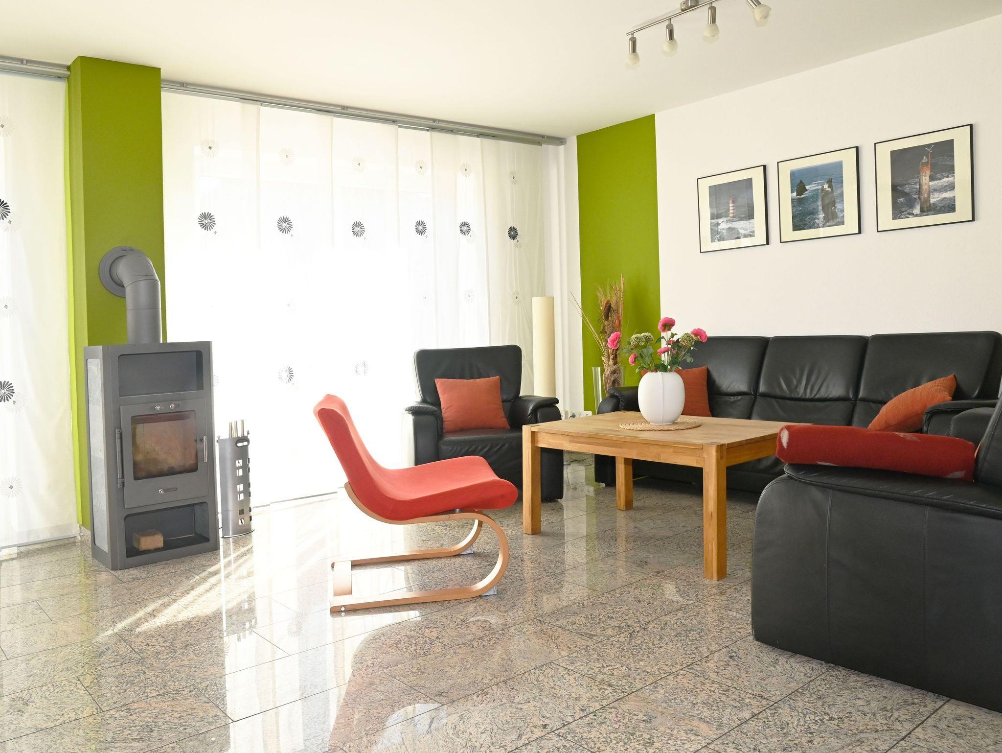 W-LAN, Ledergarnitur - 3-er Sofa, 2-er Sofa Sessel, Tisch, Kaminofen, CD-Player, Fernseher, HIFI-Anlage, SAT-Anlage, Spielesammlung