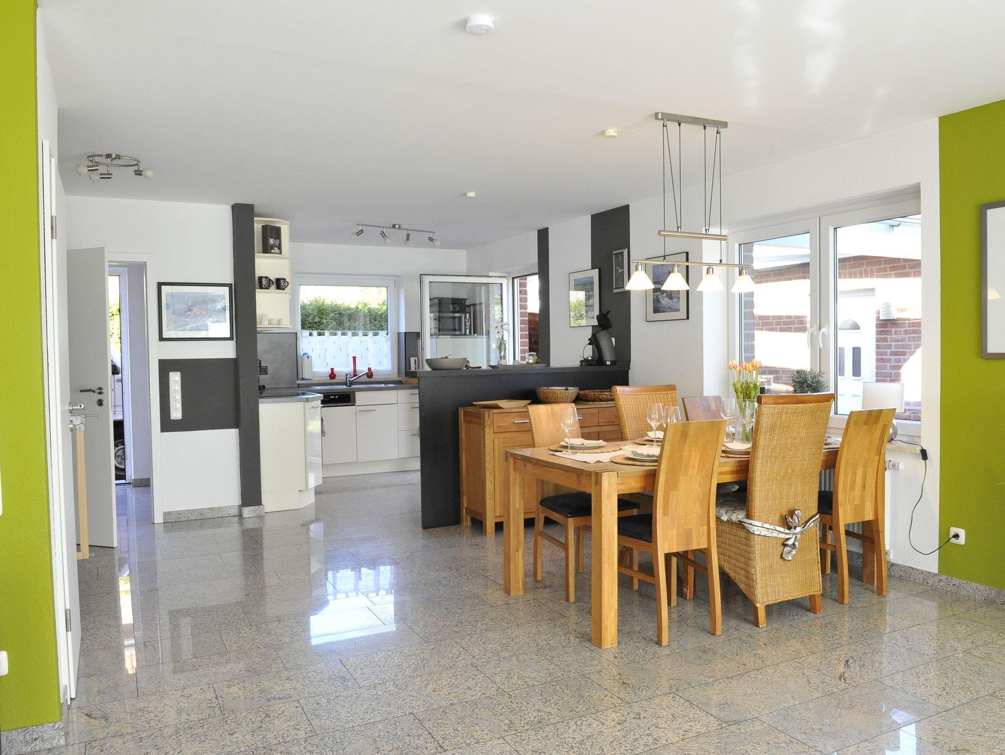 Dangast Ferienhaus Nautik Bordumerstraße 13. Ein außergewöhnliches, 2008 erbautes Einfamilienhaus, 128 qm, großzügiges, offenes Wohnkonzept, Küche mit Tresen, großes Wohnzimmer, Garten mit Südterrasse, Markise, Liegewiese, 3 Schlafz., 2 Bäder, Gäste-WC, Waschm., Trockner, Sauna. Granitfußböden im Erdgeschoss, im Schlafbereich Korkfußböden.