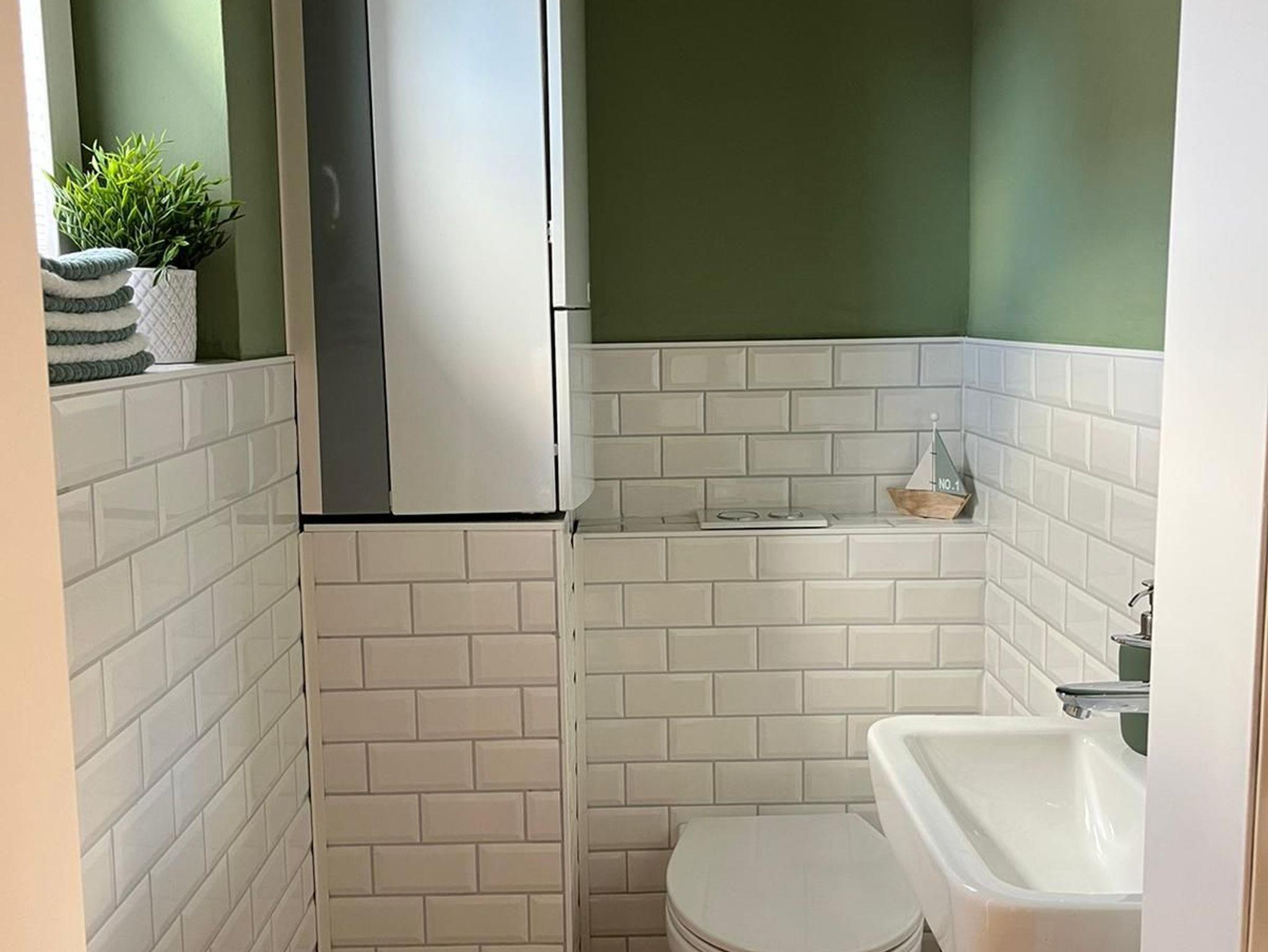Die neue Einbauküche mit direktem Zugang in den gemütlich eingerichteten Wohn-Essbereich, ist offen und modern gestaltet. Sie verfügt über eine gute Ausstattung: Ceranfeld, Backofen, Mikrowelle, Kühlschrank mit Gefrierfach, Kaffeemaschiene sowie Zubehör in gutem Zustand.