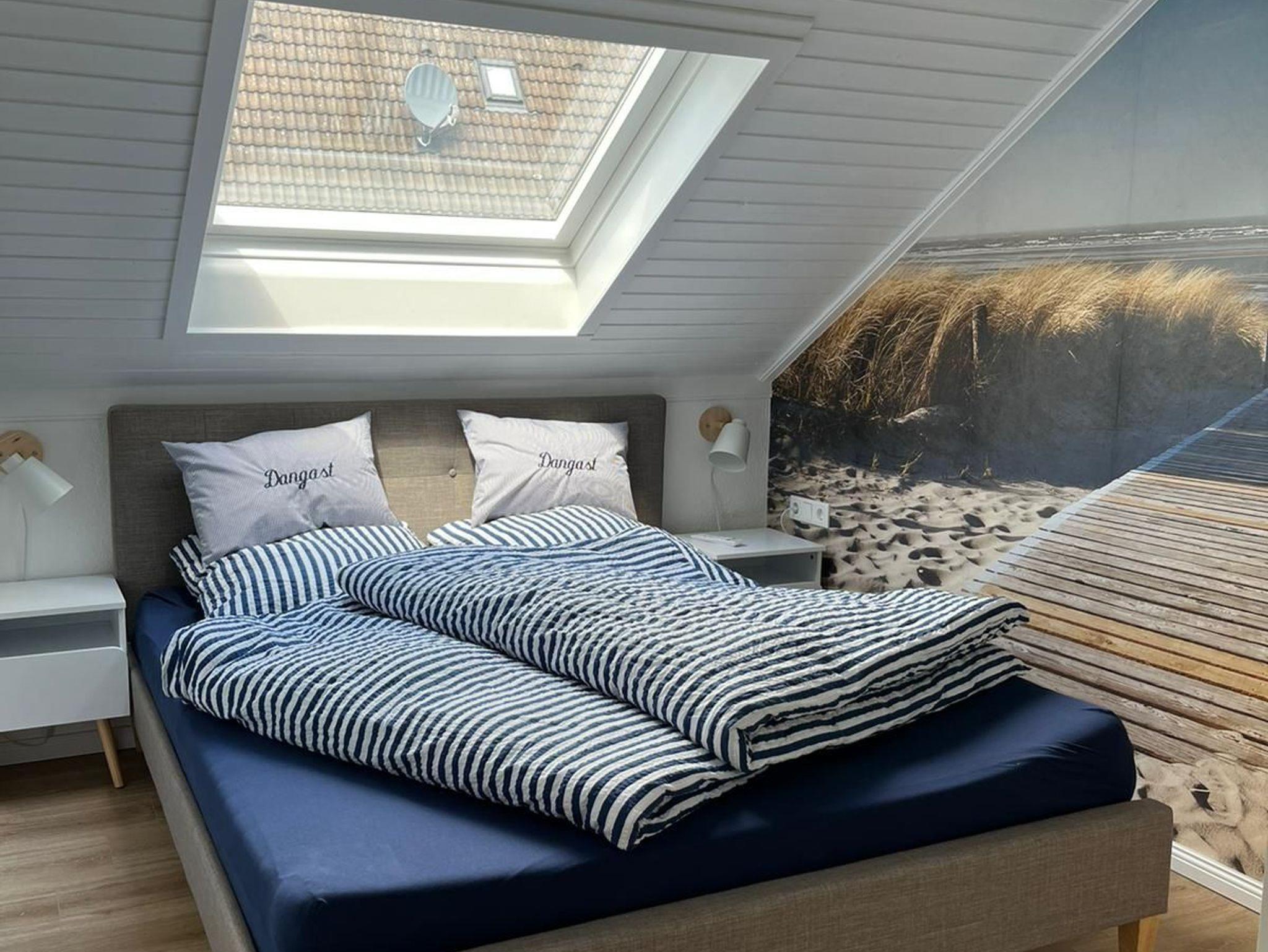 Ein Schlafzimmer verfügt über ein Doppelbett von 1,60 x 2,00 m und das andere Schlafzimmer über zwei Einzelbetten von 1,00 x 2,00 m. Beide Schlafräume sind mit Plisee Verdunkelung und Rolladen ausgestattet. Auf der gleichen Etage befinden sich eine Waschmaschine, die Benutzung ist inklusiv. Wäscheständer ist vorhanden.