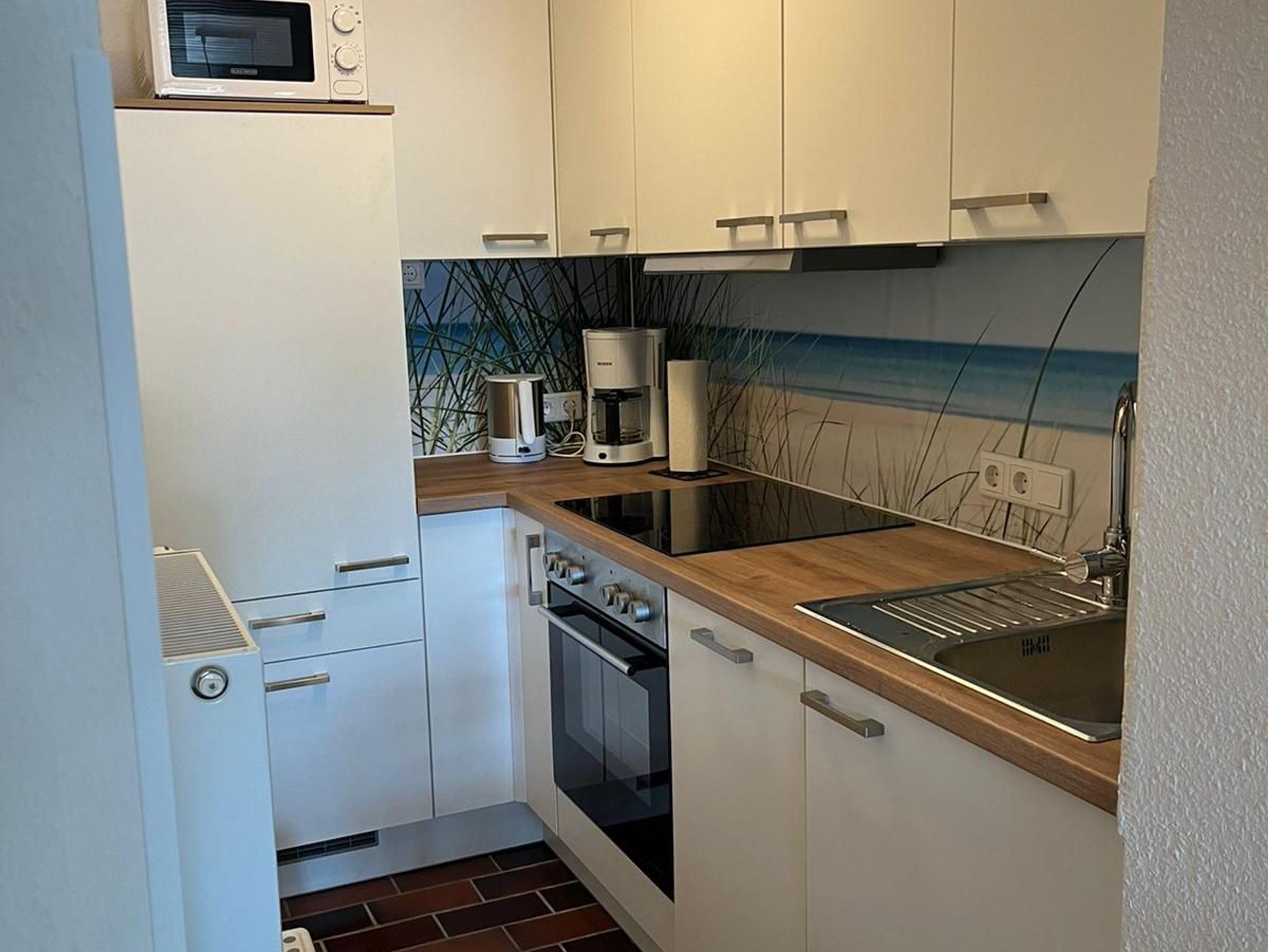 Die neue Einbauküche mit direktem Zugang in den gemütlich eingerichteten Wohn-Essbereich ist offen und modern gestaltet. Sie verfügt über eine gute Ausstattung: Ceranfeld, Backofen, Mikrowelle, Kühlschrank mit Gefrierschrank, Kaffeemaschiene sowie Zubehör in gutem Zustand.