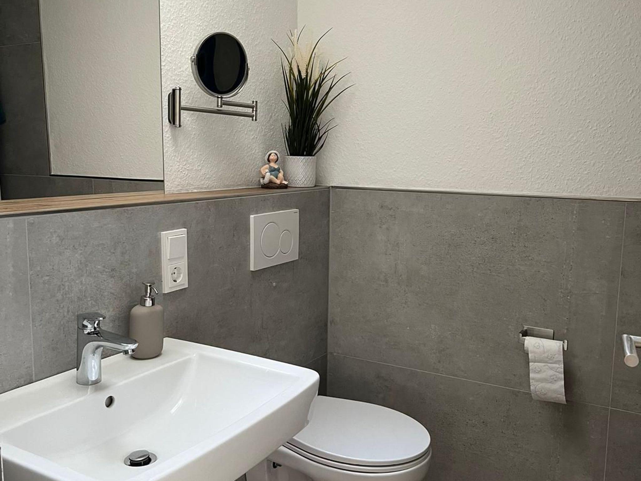 Im Obergeschoss befinden sich zwei Schlafräume, jeweils mit einem Fernseher ausgestattet und ein Bad mit Dusche und Fenster.