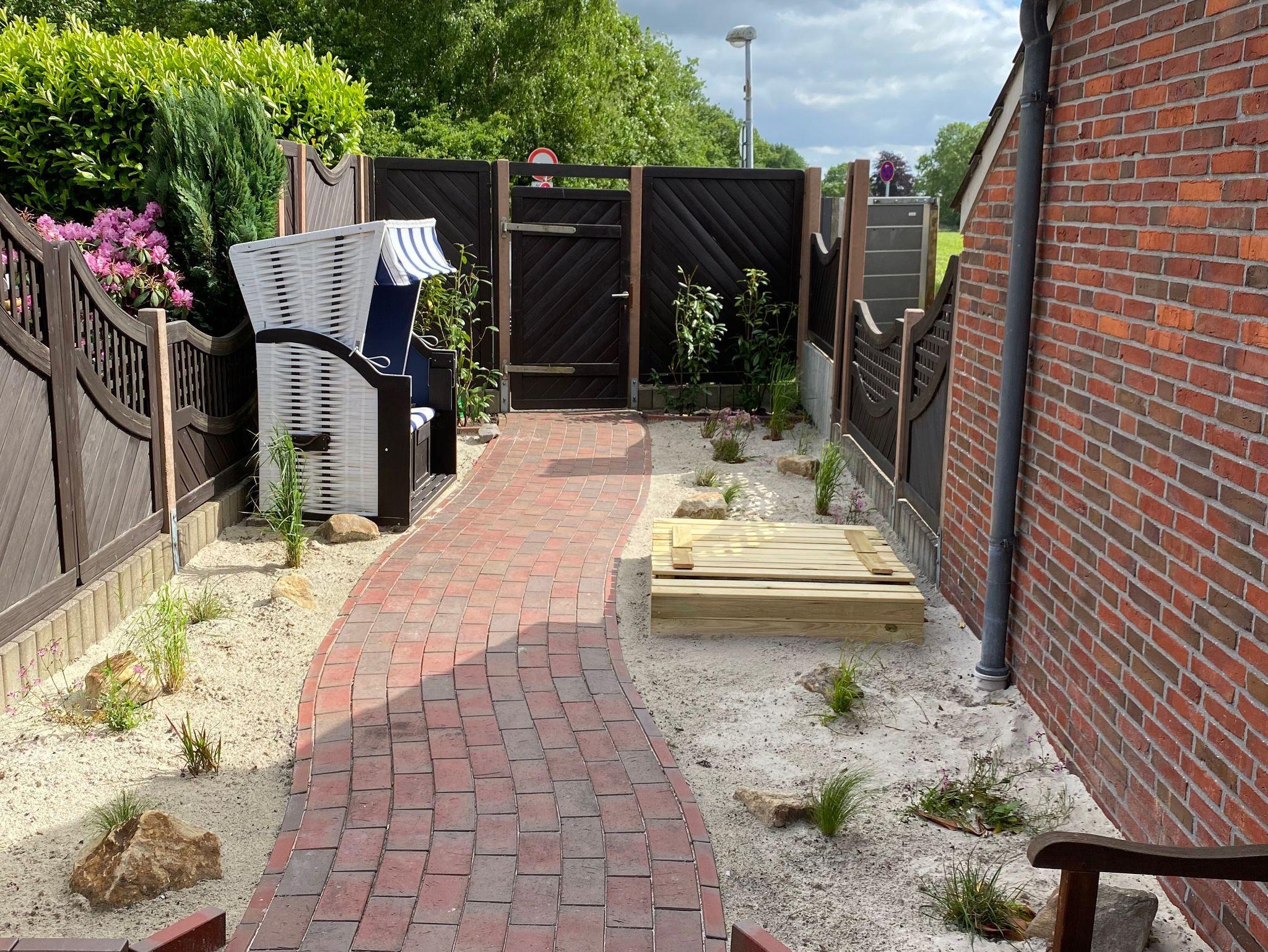 Durch den Wohnbereich gelangt man über den Wintergarten in den Gartenteil mit Strandkorb. Dieser Bereich ist eingefriedet, so dass auch die kleinen Kinder ohne bedenken in der vorhandenen Sandkiste spielen können. Die Terassentür ist mit einem Fliegengitter versehen.