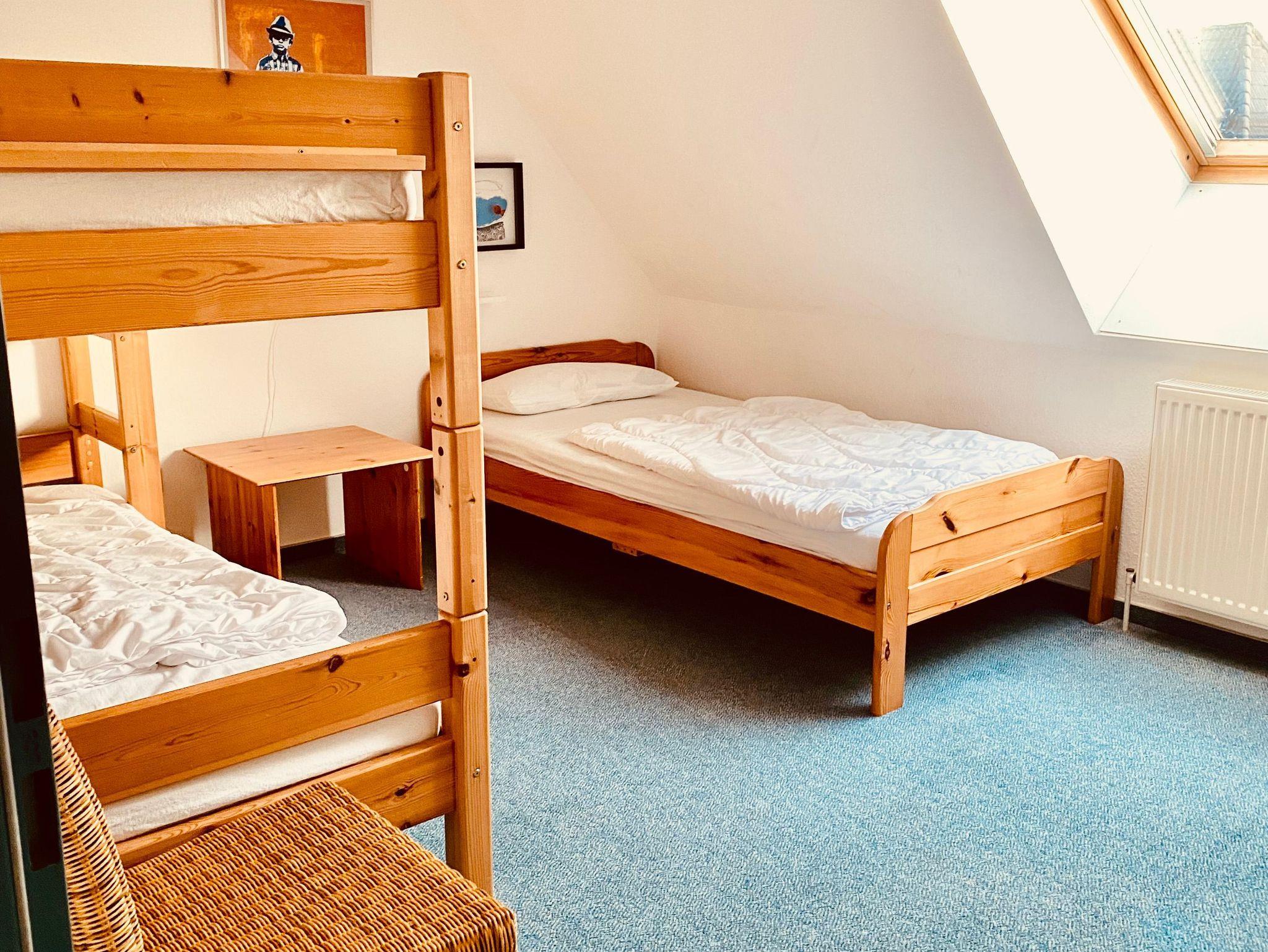 Unsere Ferienwohnung ist im Obergeschoss. Sie ist nach Süden ausgerichtet und immer hell. Es gibt einen großen Wohnraum mit gemütlicher Sitzecke, Essecke und Küchenzeile. Der Wohnraum führt auf den schönen, großen Sonnenbalkon. Auf gleicher Ebene finden Sie ein Schlafzimmer (2 Betten), Toilette und Eingangsflur. Eine Treppe höher finden Sie ein weiteres Schlafzimmer (Kinderzimmer) mit einem Etagenbett und einem Kinderbett. Gleich daneben ist die Dusche mit WC.