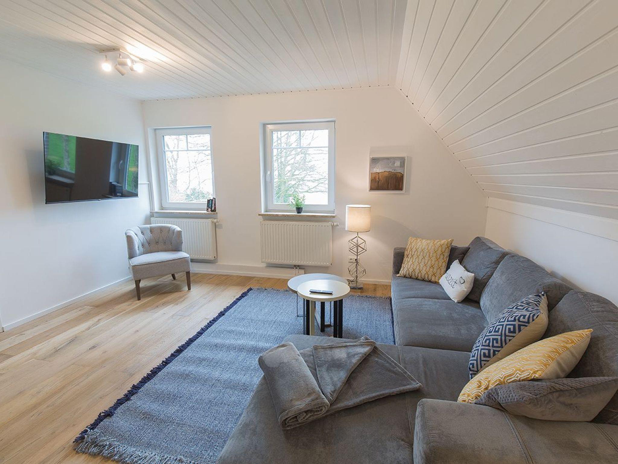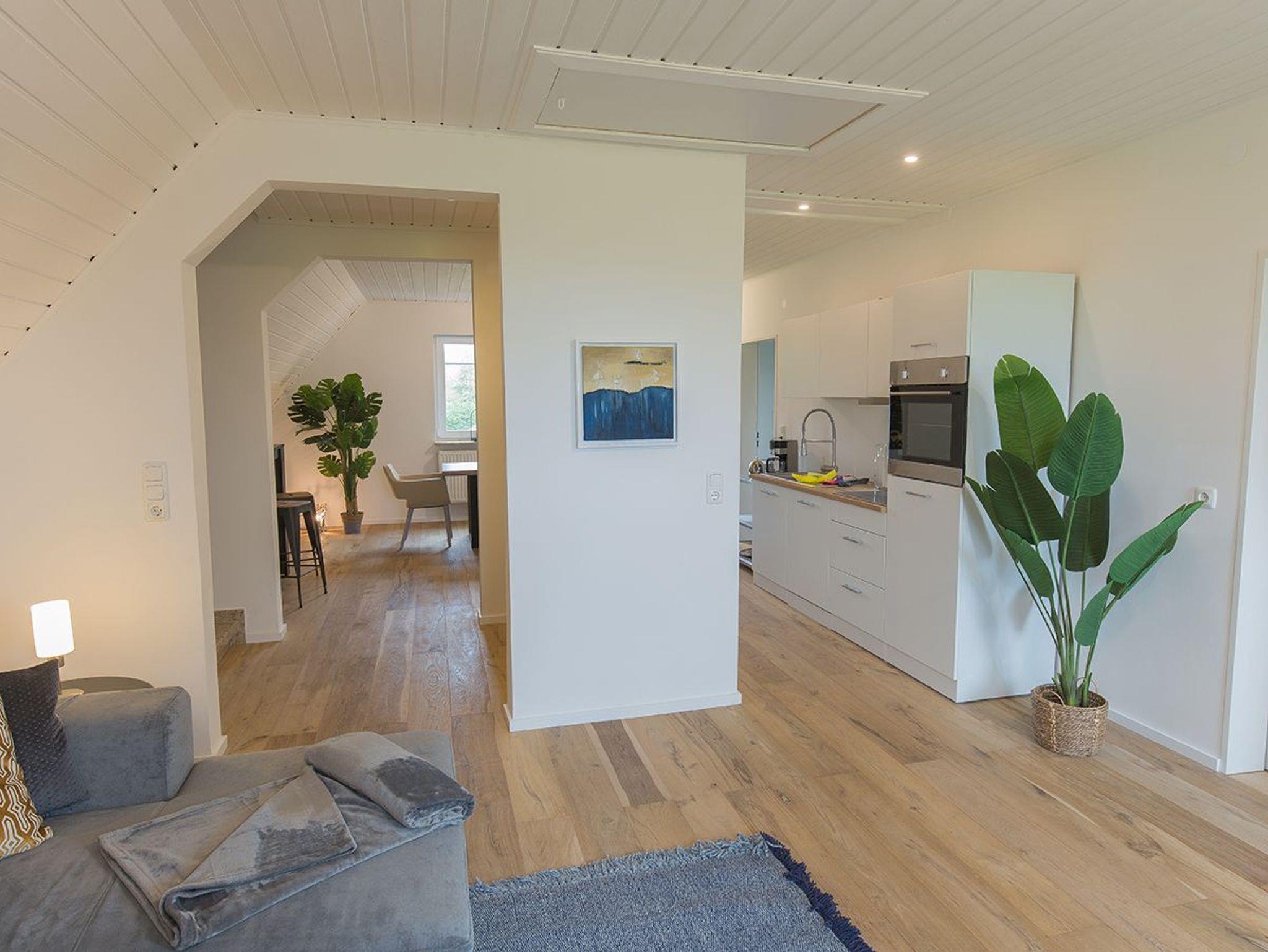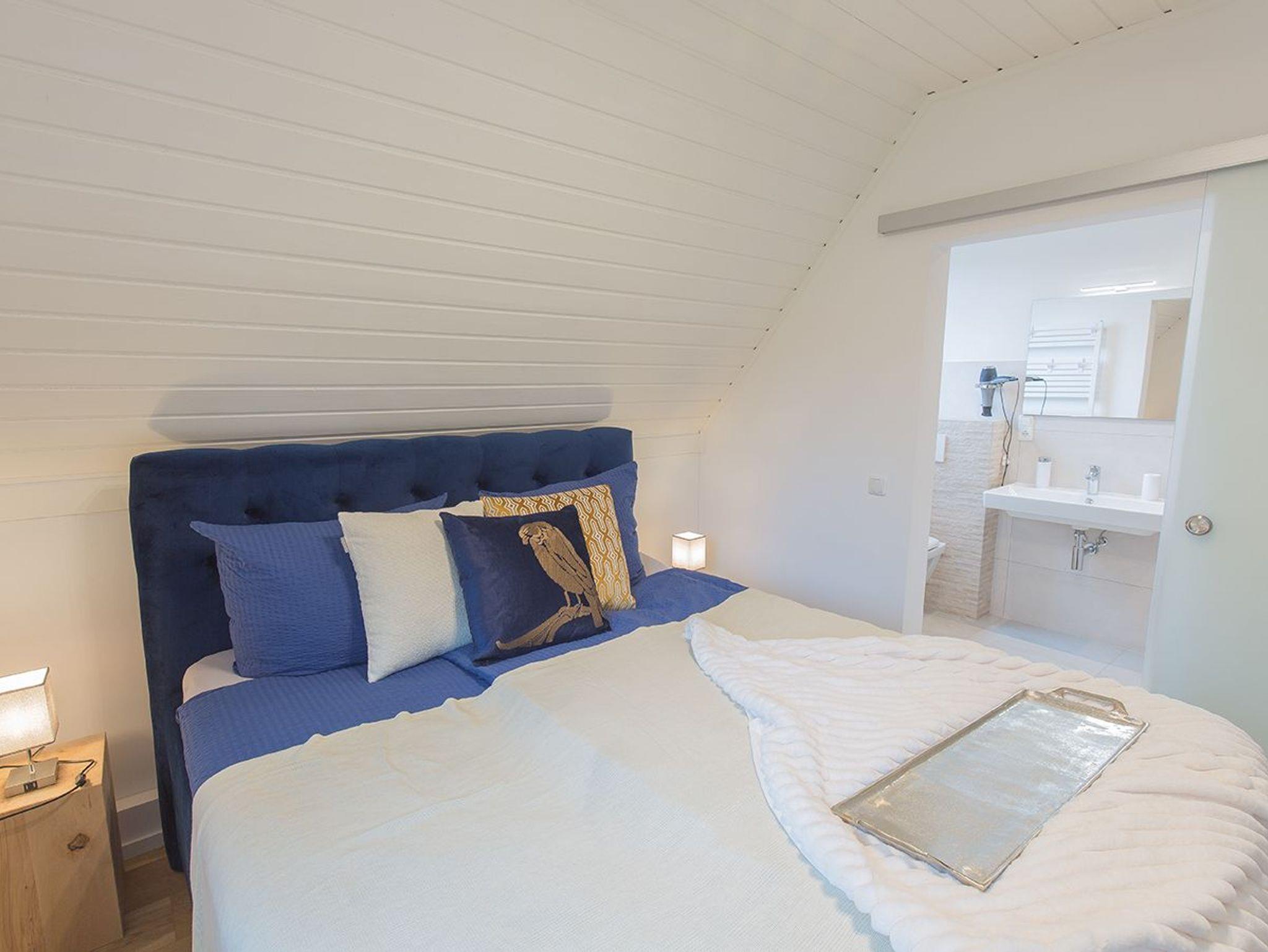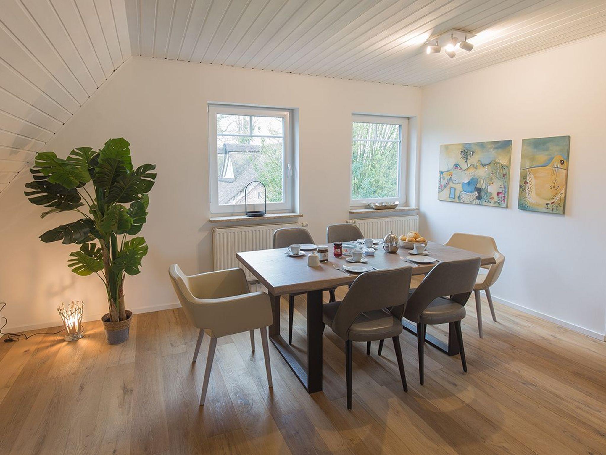 Moin und herzlich Willkommen in unserer Ferienwohnung Fresenhuus 3 im ersten OG rechts. Ihr PKW-Stellplatz liegt unmittelbar vor der Anlage. Im gesamten Objekt wurde Echtholz-Eichenparkett verlegt. Drei Stufen führen Sie zunächst in die Diele mit Garderobe und Ablagefläche und dann in den offenen Wohn/-Essbereich. Nach links gelangen Sie zum großen Esstisch mit angrenzender offener Küchenzeile. Der Blick nach draußen ist unverbaubar auf Felder und Wiesen. Rechts befindet sich das große Sofa mit Recamiere und Schlaffunktion, ein Sessel und ein wandhängender Flachbild-TV. Vom Wohnzimmer und dem Esszimmer führt Sie eine Tür zu den beiden Schlafräumen; komfortabel ausgestattet mit zwei großen Doppel-Boxspringbetten und Platz für Kleidung. Von jedem Schlafzimmer aus gelangen Sie in ein eigenes modernes Duschbad mit Fußbodenheizung und ebenerdiger Walk-In-Regendusche. Genießen Sie den tollen Garten, die unverbaute Aussicht auf Felder und Wiesen Richtung Deich sowie die finnische Panoramasauna.