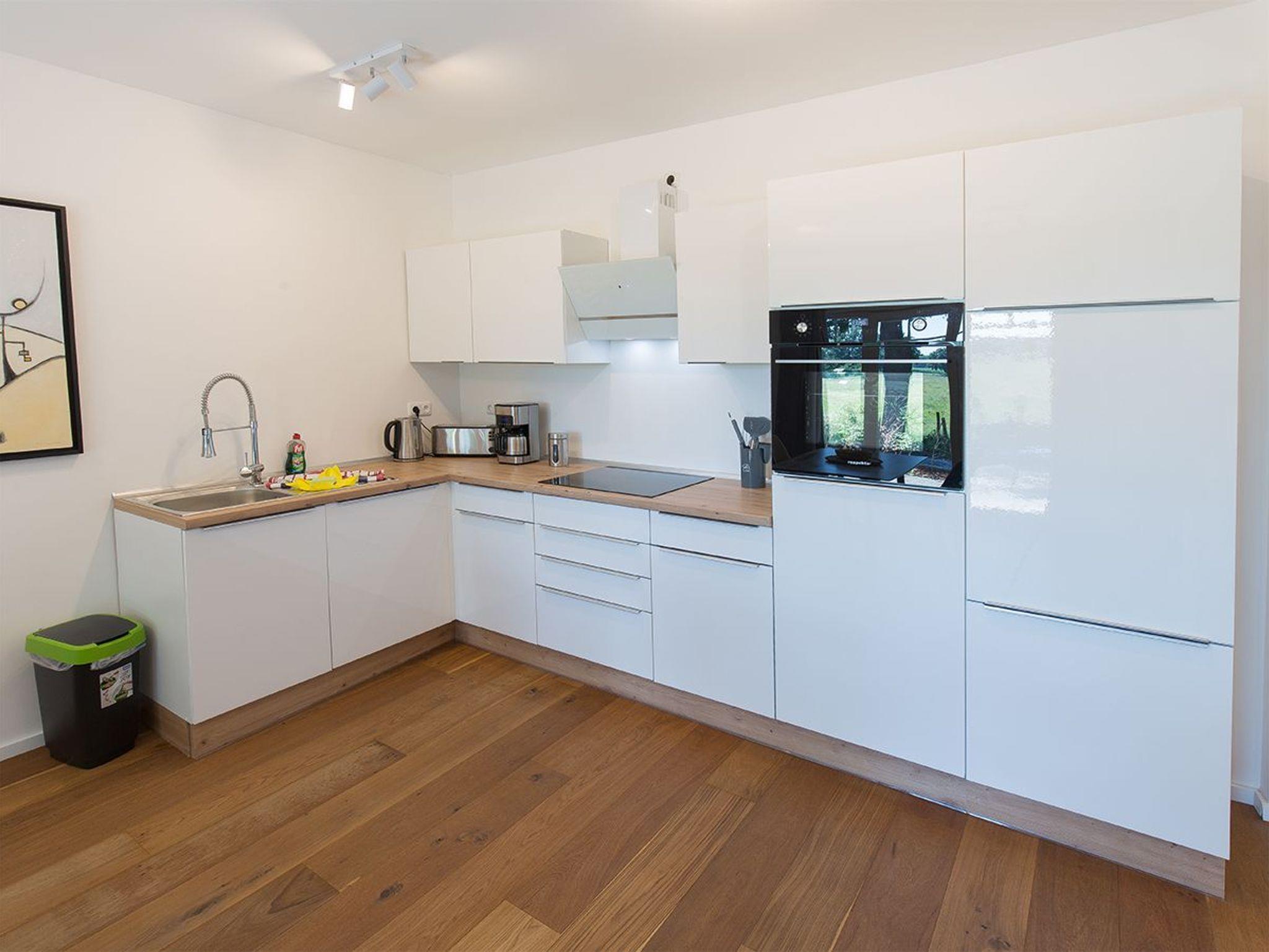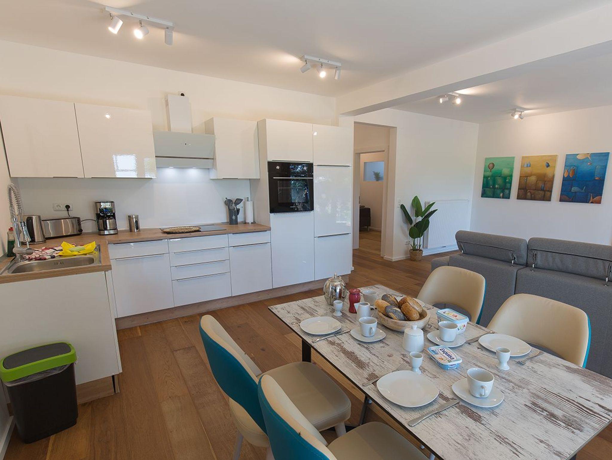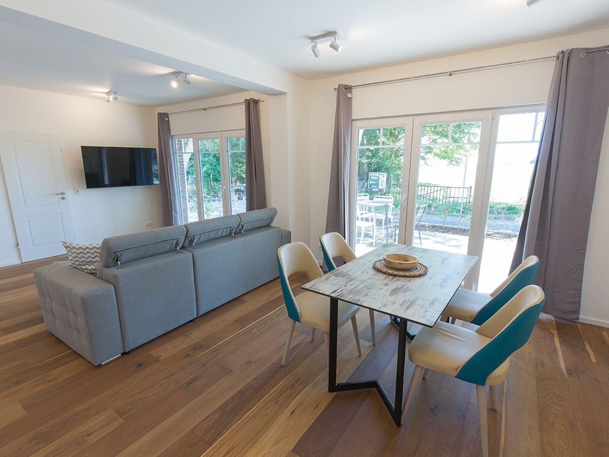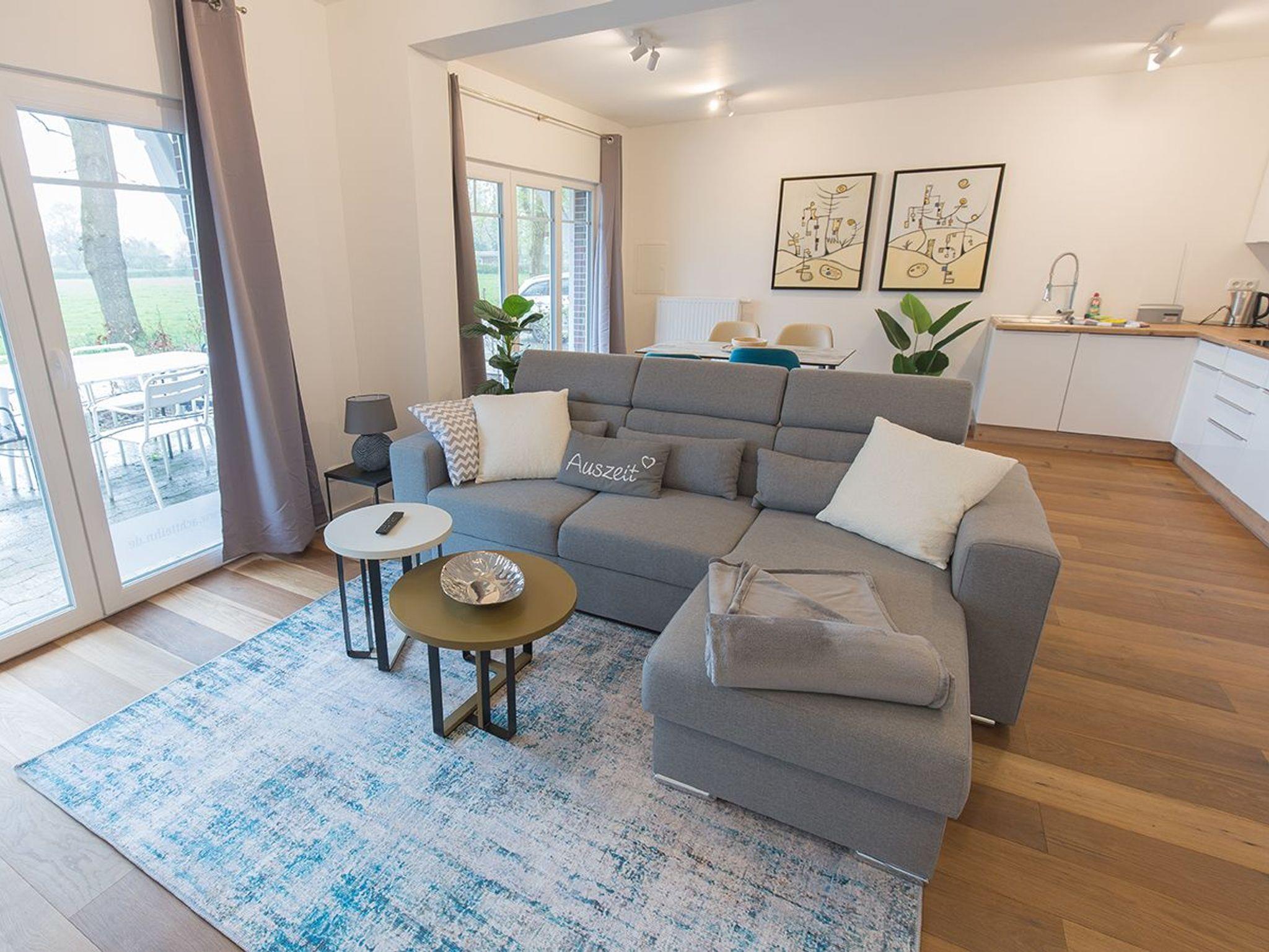 Unsere Wohnung Fresenhuus 4 ist Teil der Ferienwohnanlage achtteihn in der Oldeoogstraße. Ihr PKW-Stellplatz liegt unmittelbar vor der Anlage. Sie betreten ihre Ferienwohnung auf der Rückseite von der großen Südterrasse aus. Im gesamten Objekt wurde Echtholz-Eichenparkett verlegt. Es empfängt Sie ein langer heller Flur mit Garderobe. Vom Flur aus erreichen Sie auf jeder Seite die beiden Schlafräume - ausgestattet mit Doppel-Boxspringbetten in 160x200 und 180x200. Ein Schlafraum hat eine separate Ankleide, der andere ein direkt zugängliches Bad mit Fußbodenheizung und ebenerdiger Walk-In-Regendusche. Weiter geradeaus erwartet Sie der großzügige Wohn-/Essbereich mit einem gemütlichen Sofa mit Récamiere und Schlaffunktion sowie die offene Küche mit vorgelagertem Essplatz. Gegenüber des Sitzbereiches finden Sie den Eingang zum ebenfalls komfortabel ausgestatteten Duschbad. Auf der zweiten Terrasse zur Oldeoogstraße hin freuen Sie sich auf die Morgensonne und den Blick auf Felder und Wiesen Richtung Deich. Genießen Sie Ihre beiden Terrassen, den tollen Garten, die unverbaute Aussicht sowie die finnische Panoramasauna.