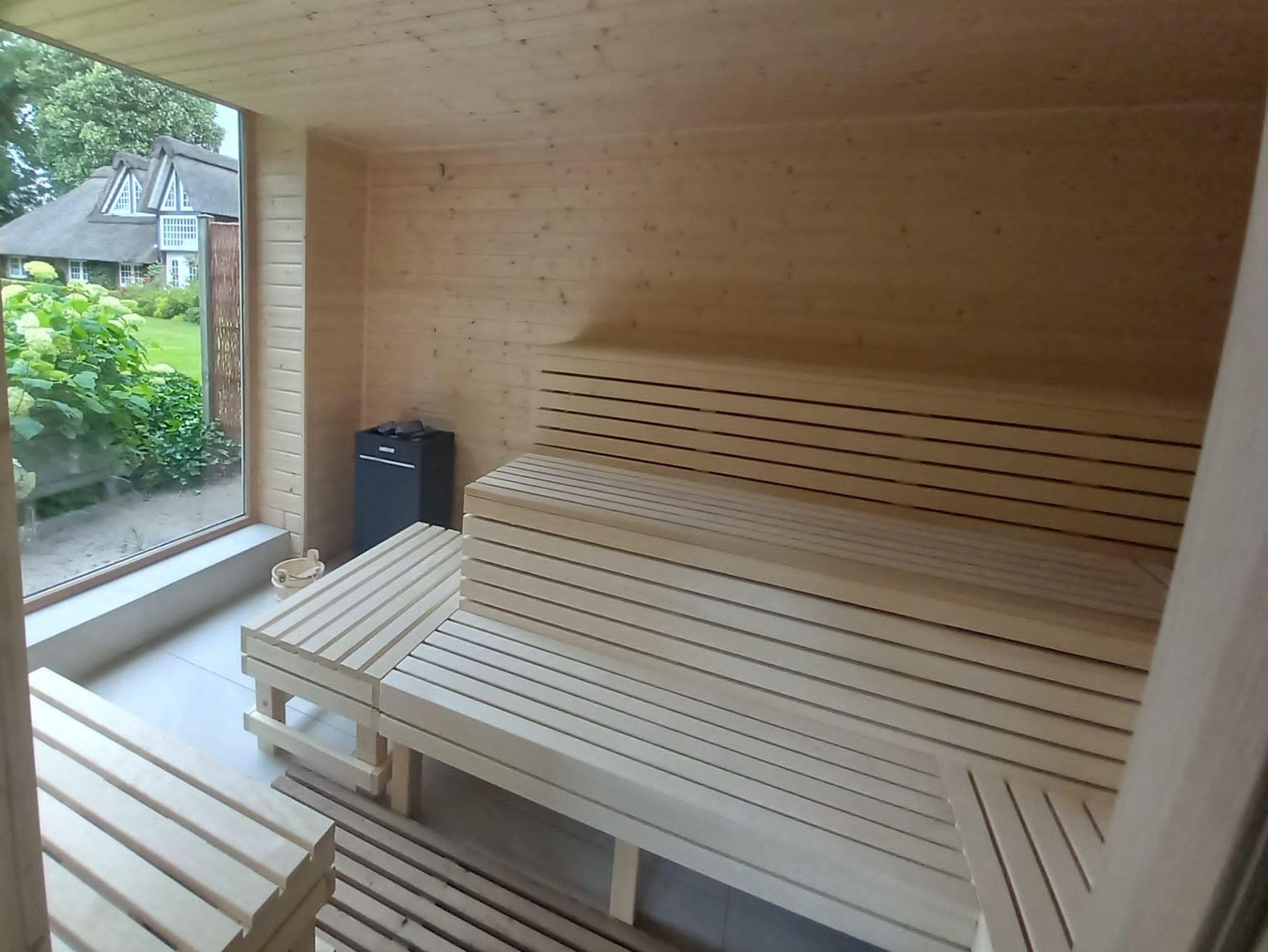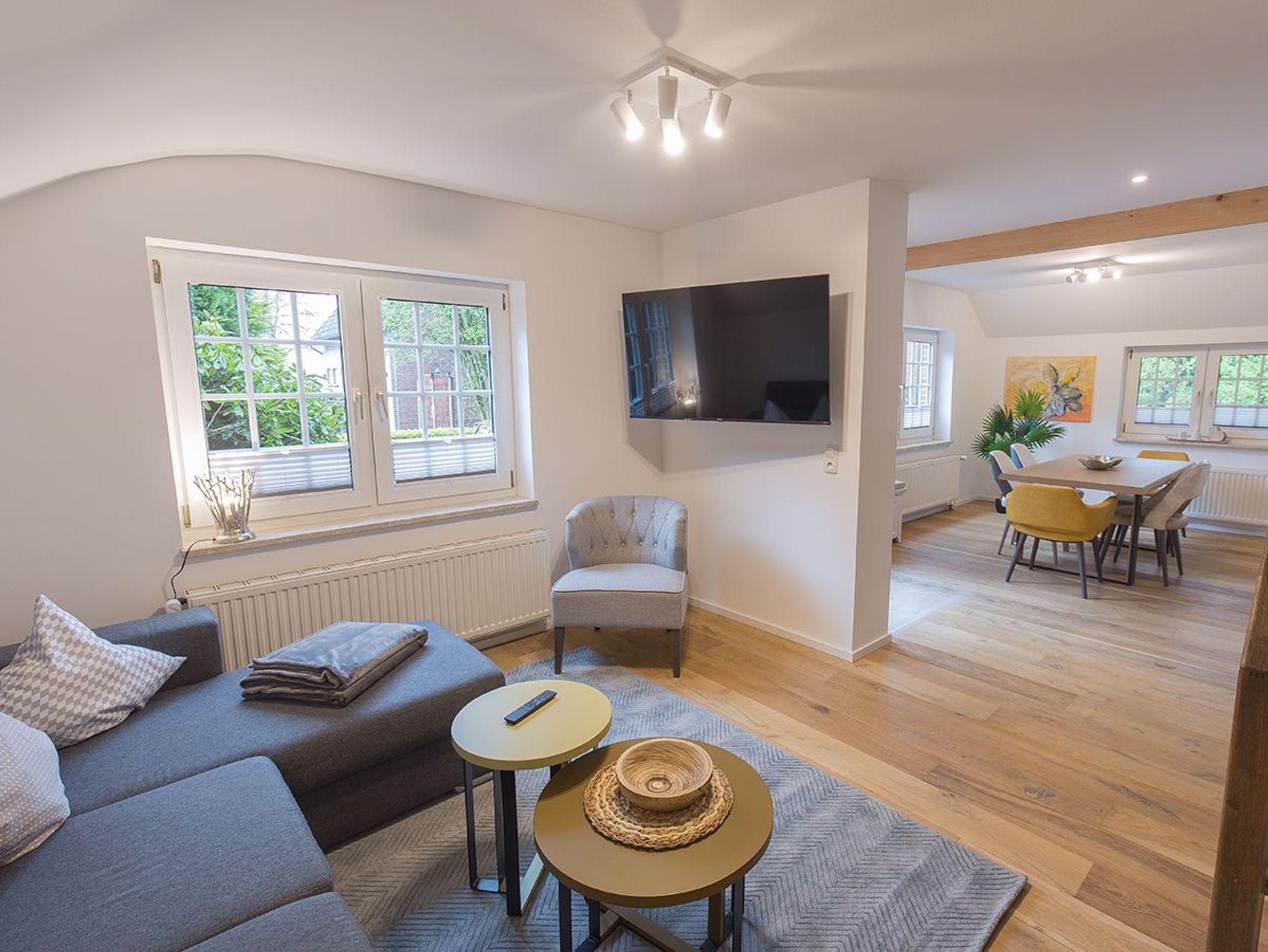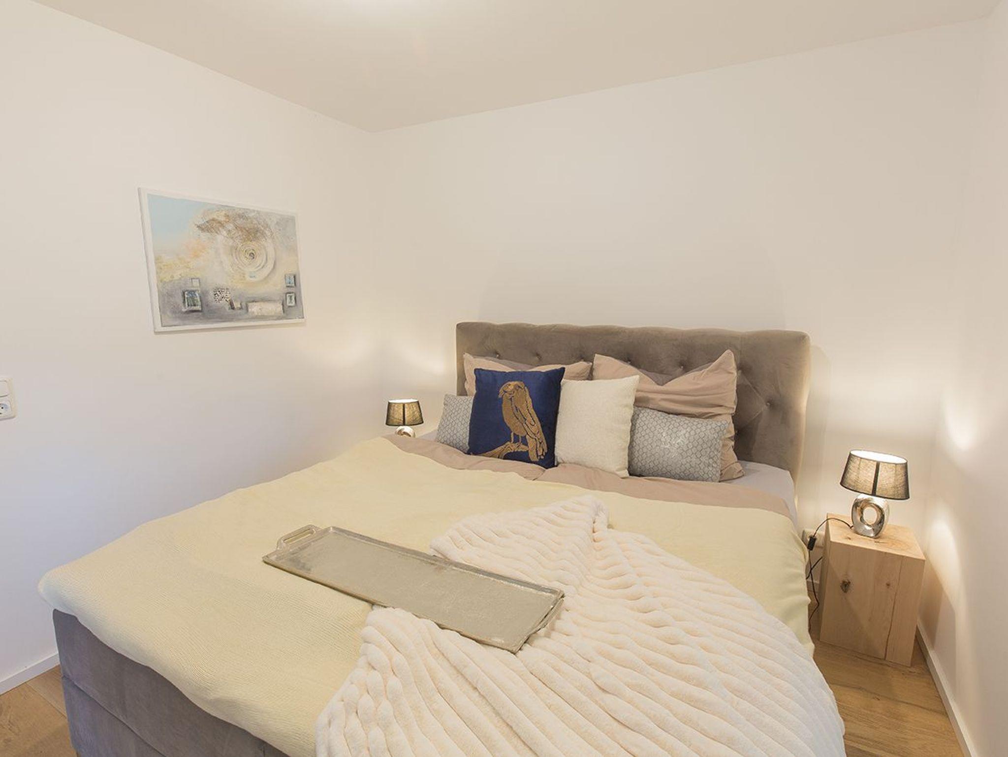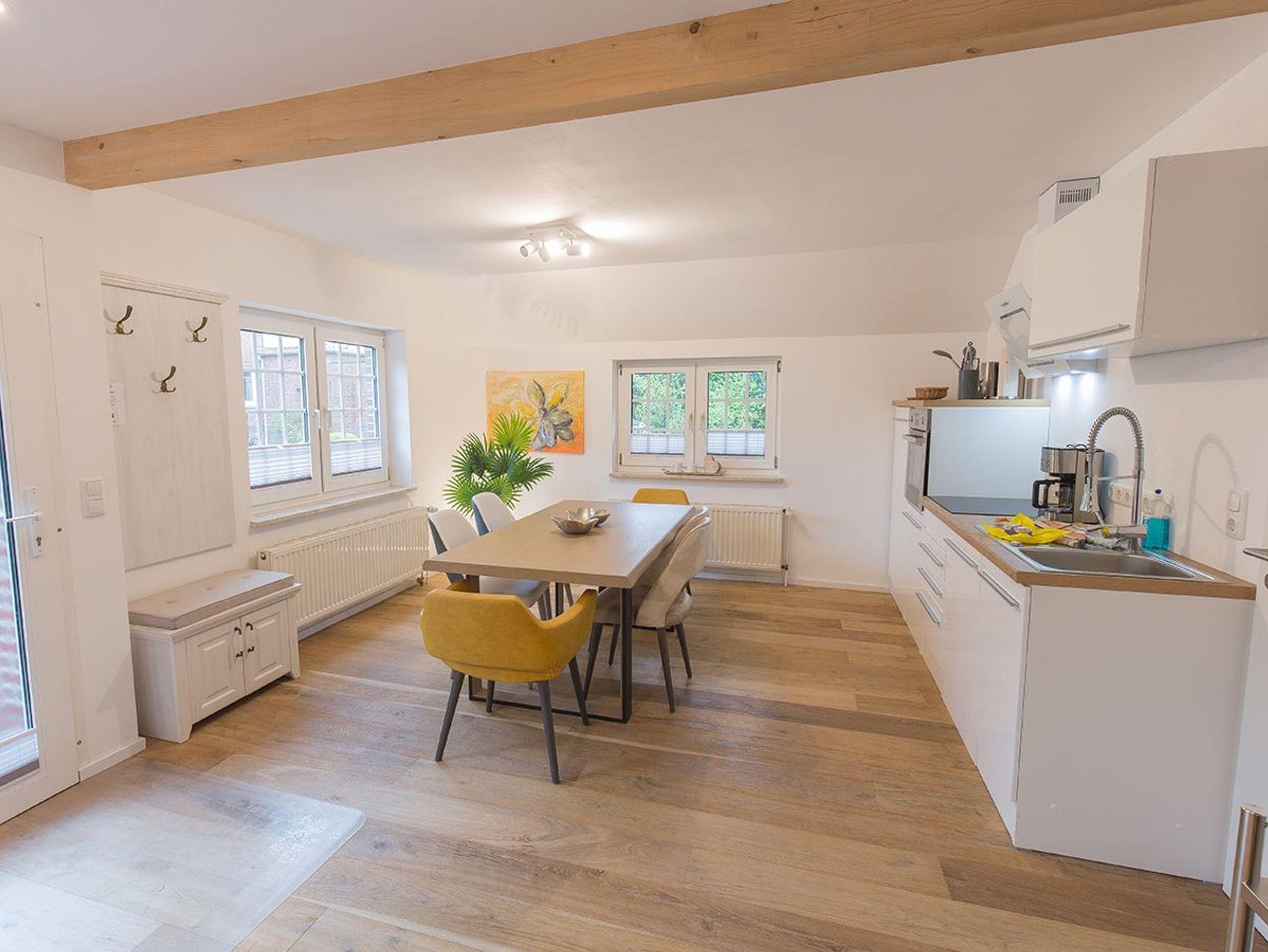 Unsere schicke Wohnung Reethus 5 liegt inmitten grüner Natur in der Oldeoogstraße und ist Teil der Ferienwohnanlage achtteihn. Ihr PKW-Stellplatz liegt unmittelbar vor der Anlage; im gesamten Objekt wurde Echtholz-Eichenparkett verlegt. Sie wohnen hier mit bis zu sechs Personen und Kleinkind sehr ruhig und können die 30 qm große Sonnenterrasse, den Garten, die Sauna und einen schönen Weitblick genießen. Sie gelangen ab Eingang in den großen Wohn-/Essbereich mit Küchenzeile und dem gemütlichen Sofa mit Recamiere und Schlaffunktion. Hier führen 2 Türen zu den unteren beiden Schlafräumen mit je einem Boxspringbett. Von den Schlafräumen gelangen Sie in ihr eigenes Duschbad mit Fußbodenheizung und ebenerdiger Walk-In-Regendusche. Eine Treppe führt Sie in den Maisonette-Bereich mit einem weiteren großen Boxspringbett sowie einem zu schließenden Bereich mit WC und Waschplatz. Genießen Sie ihre Terrasse und den Gartenblick.