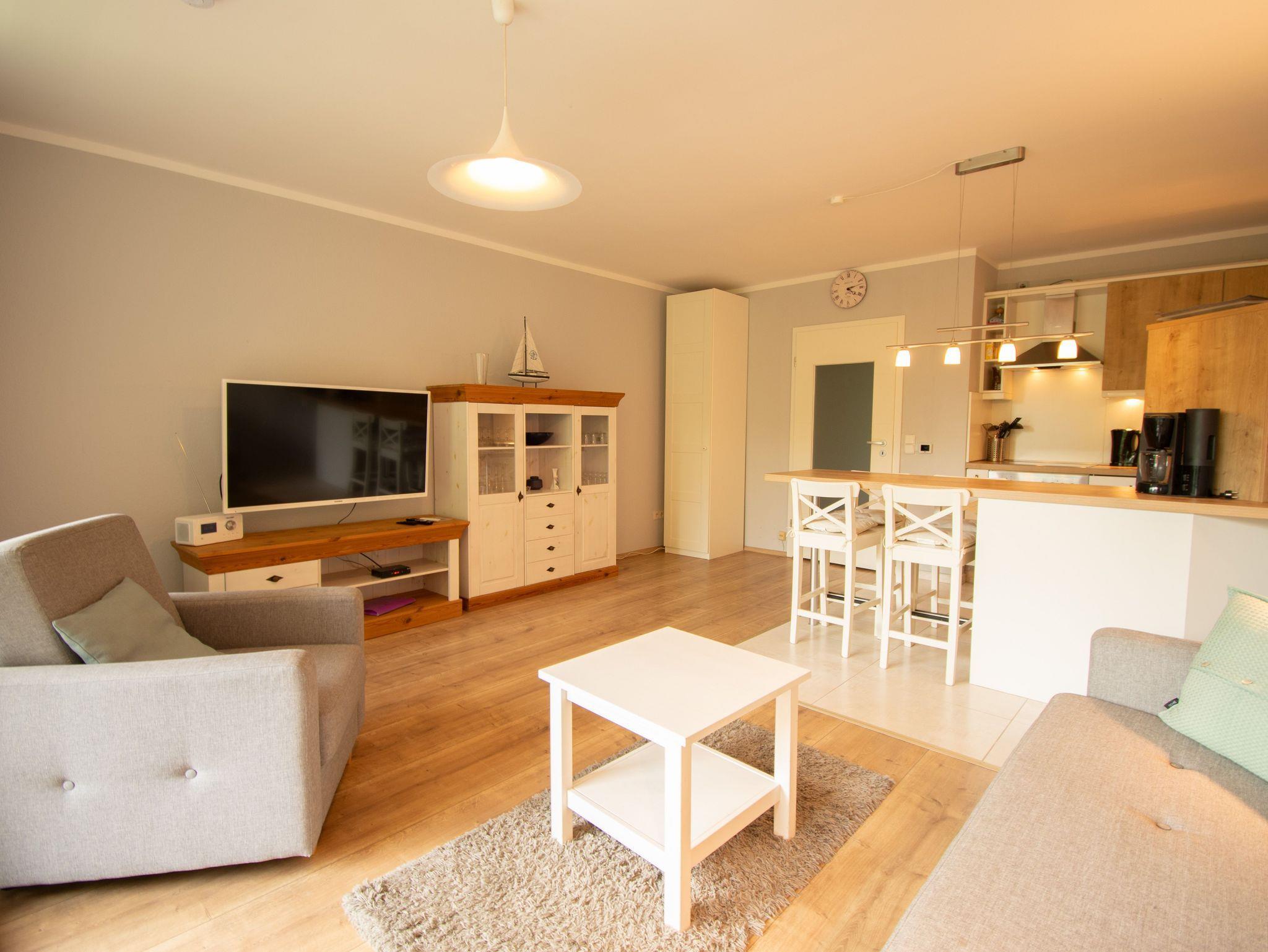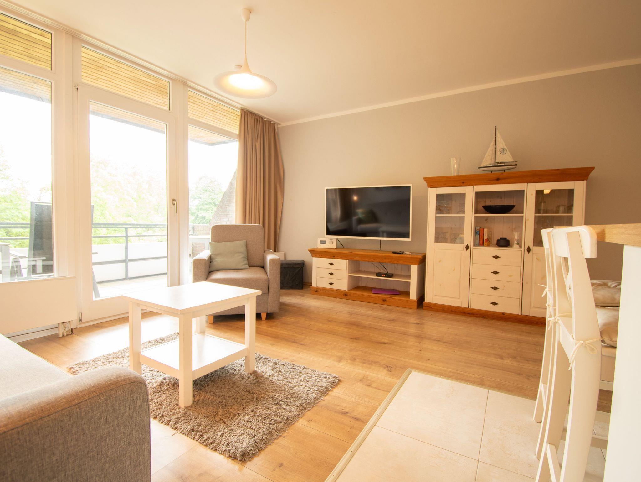 Moin Moin in unserer schicken Wohnung Watt´n Blick auf der zweiten Etage in einem Mehrparteienhaus im Herzen von Dangast. Hier verbringen Sie ihren Urlaub sehr ruhig in einer reinen Wohnstraße und doch strandnah. Durch den großzügigen Flurbereich gelangen Sie ins Wohn/Esszimmer mit Küchenzeile und gegenüber einem Theken-Essplatz. Hier befindet sich auch der schicke Wohnbereich mit Ausgang zum sichtgeschützten großen Balkon mit Mobiliar und Blick ins Grüne. Genießen Sie die frische friesische Luft. Die Wohnung hat zwei Schlafräume - der erste ist ausgestattet mit Boxspringdoppelbett und Kleiderschrank, der zweite bietet ein Tandembett - unten ausziehbar . Das schicke Duschbad hat einen geräumigen Waschplatz mit - einer kleinen - Duschkabine aber einem flachem Einstieg.