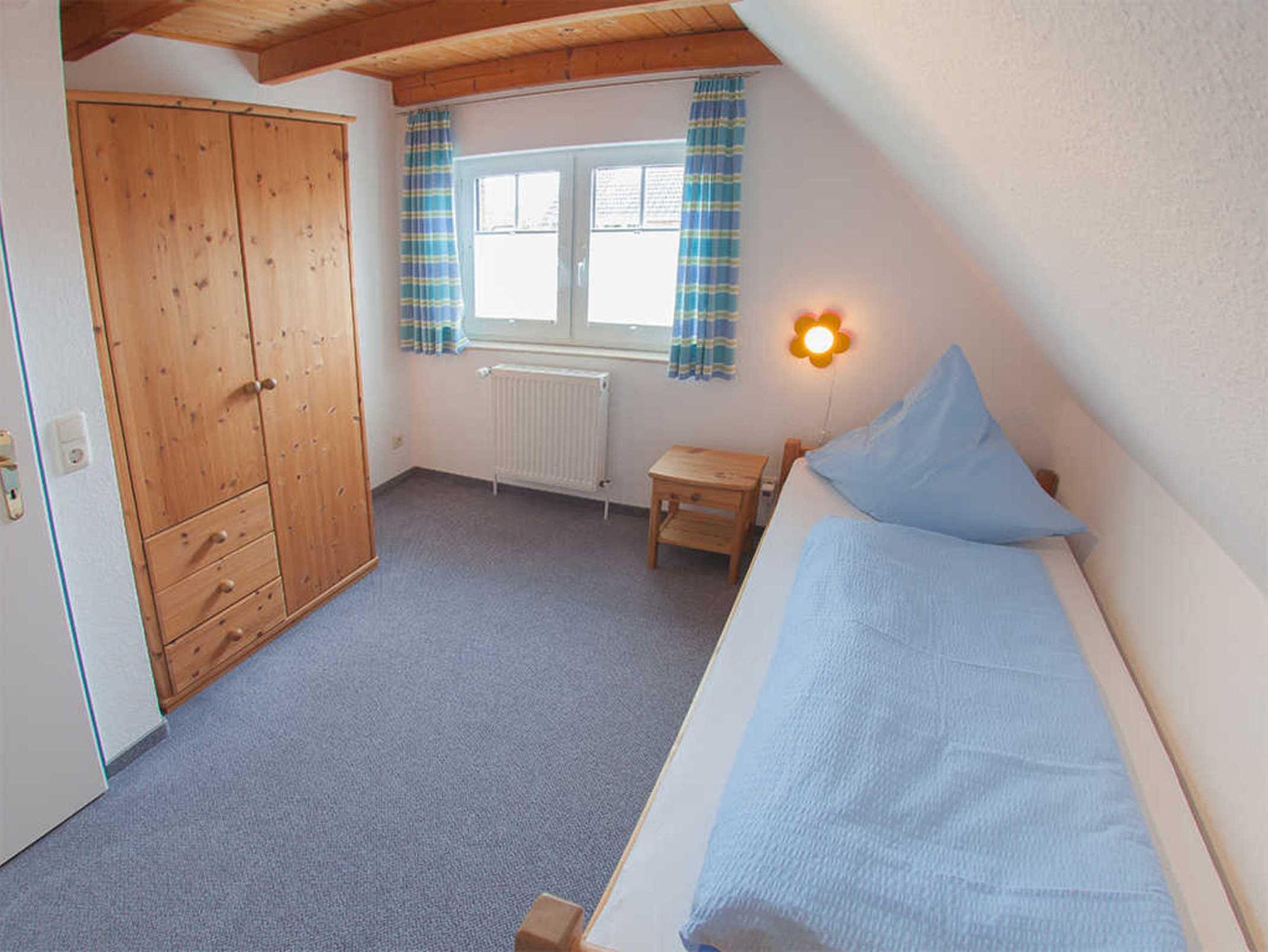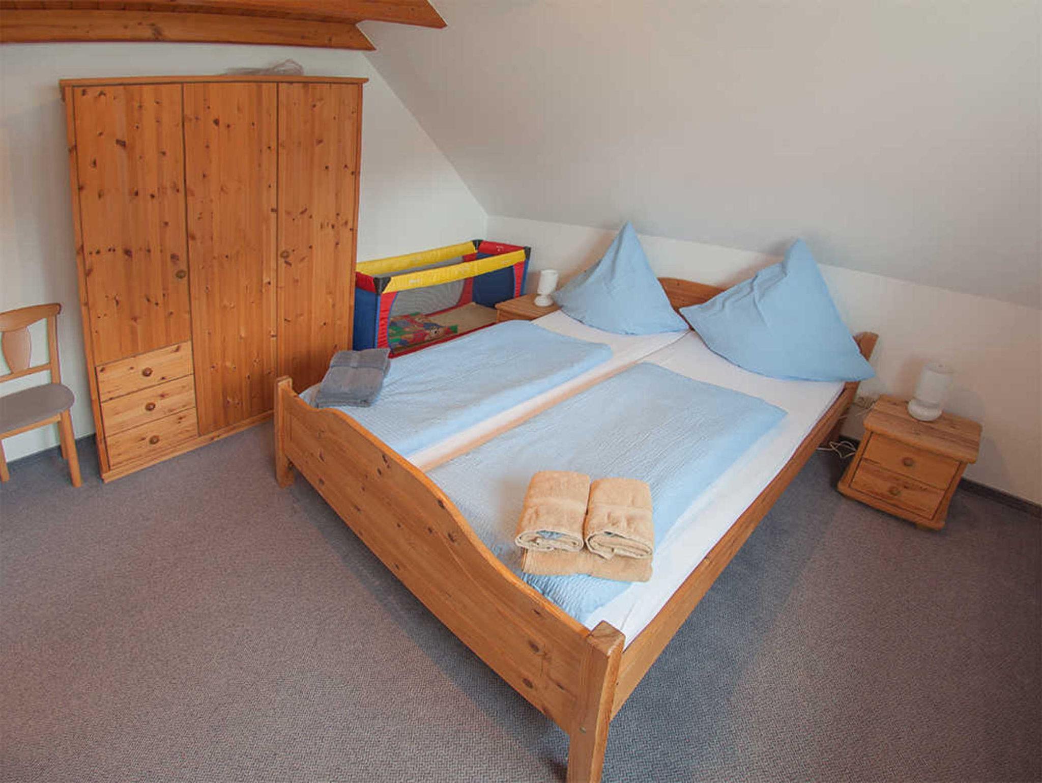 Im Obergeschoss gibt es ein helles Fenster-Duschbad mit Waschmaschine und die beiden Schlafräume: je ein Schlafzimmer mit Doppelbett und ein Schlafraum mit zwei Einzelbetten. Ein Treppenschutzgitter ist vorhanden.