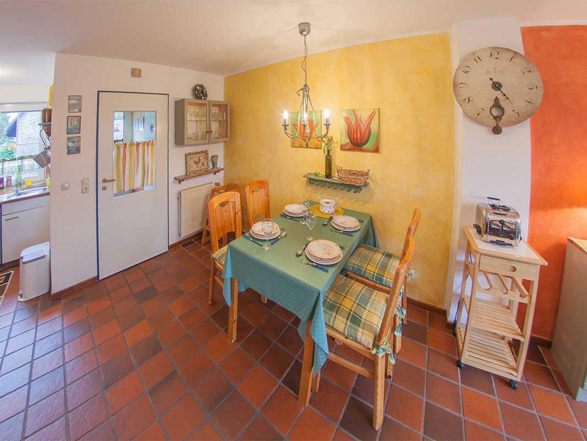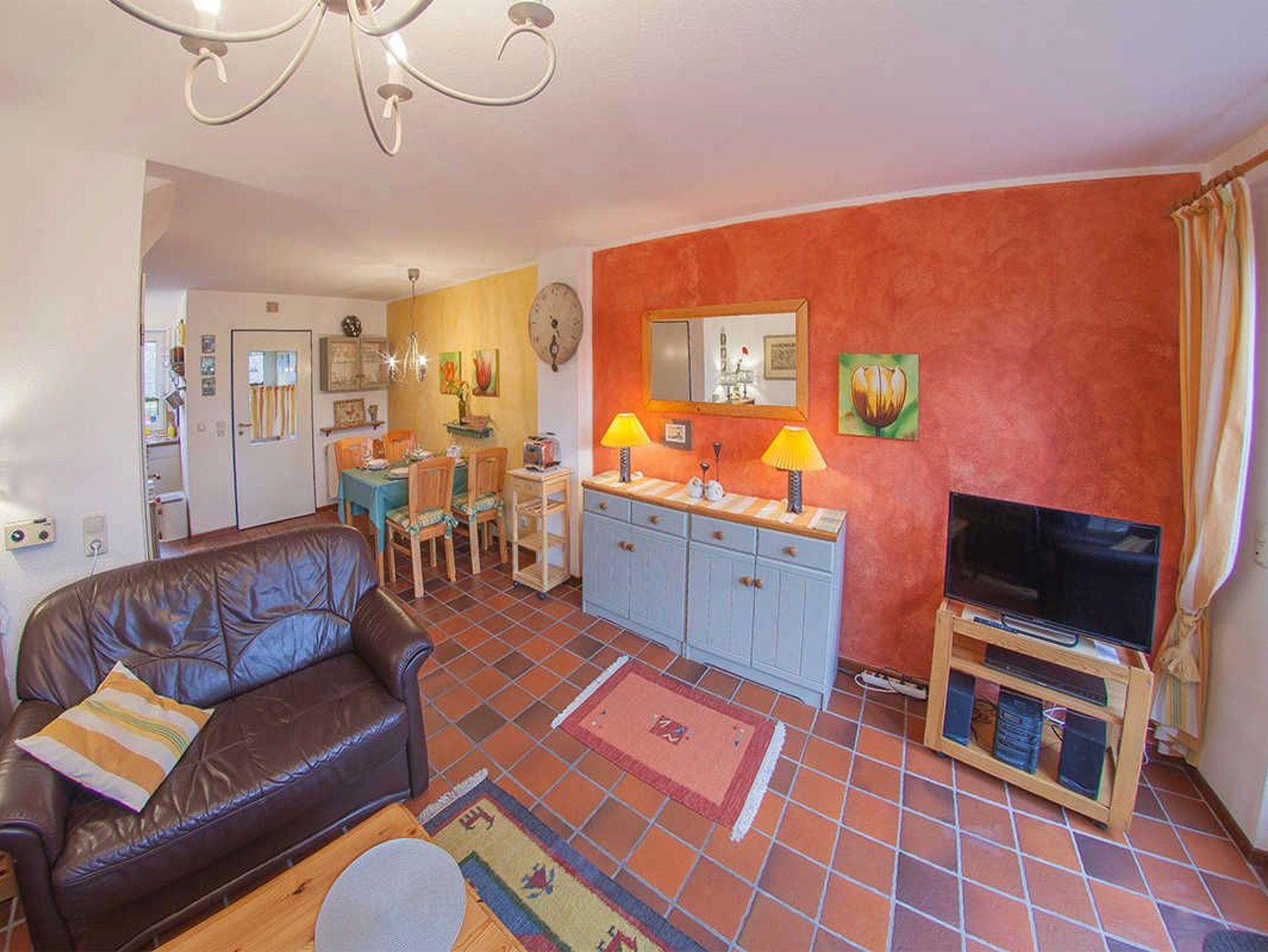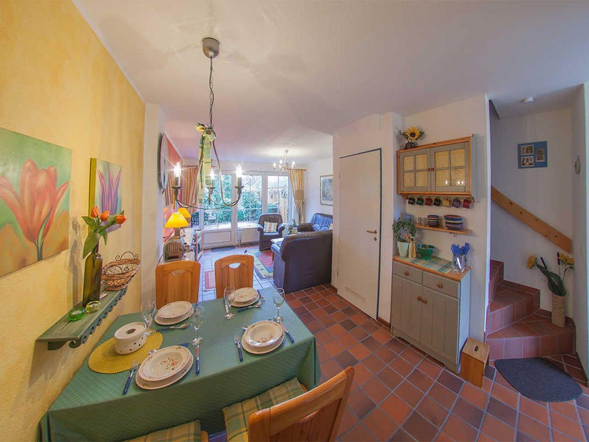 In der Ortsmitte im Grünen erwartet Sie ein gemütliches mit Naturholzmöbeln eingerichtetes Ferienhaus. Ihr Stellplatz liegt direkt rechts am Haus. Im Eingangsbereich mit Garderobe gibt es das separate Gäste-WC. Der Wohnbereich - hier integriert eine komplett eingerichtete Küchenzeile - hat den Ausgang zur eingezäunten Terrasse. Im Obergeschoss befinden sich das helle Duschbad und die beiden Schlafräume; einer mit Doppelbett und Kinderbett, der weitere mit zwei Einzelbetten. Alle Lattenroste sind höhenverstellbar. Die Bodenbeläge sind aus Keramik und Laminat. Lassen Sie den Tag ausklingen auf der sichtgeschützten Terrasse.