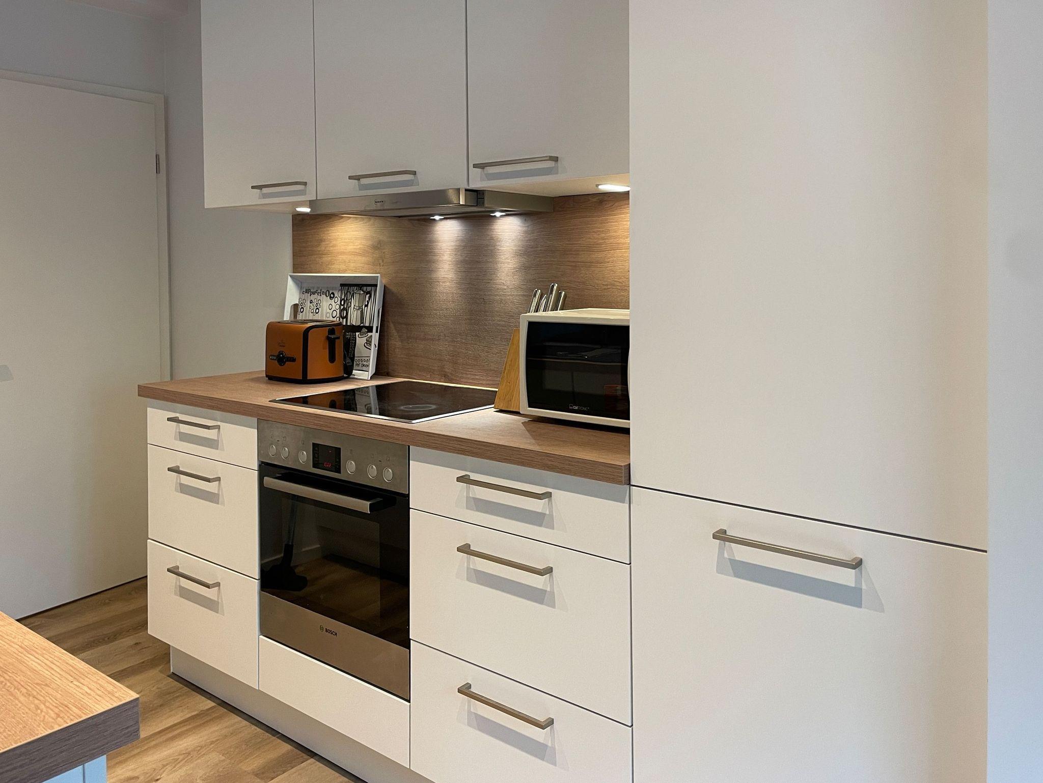 Küche mit Kühlschrank,Spülmaschine, Backofen mit Ceran-Kochfeld, Thermomix, Toaster, Kaffeemaschine, Wasserkocher und Mikrowelle