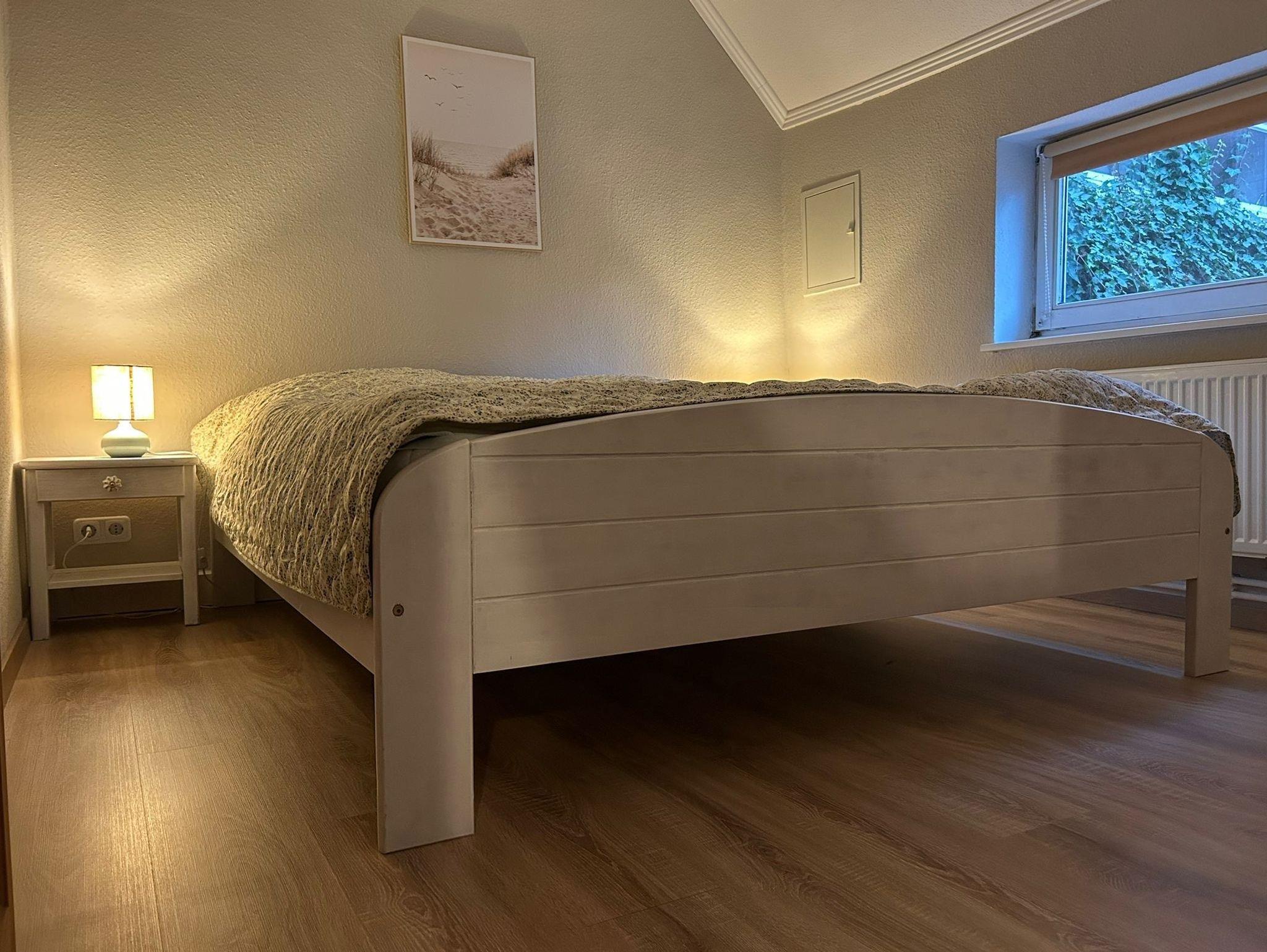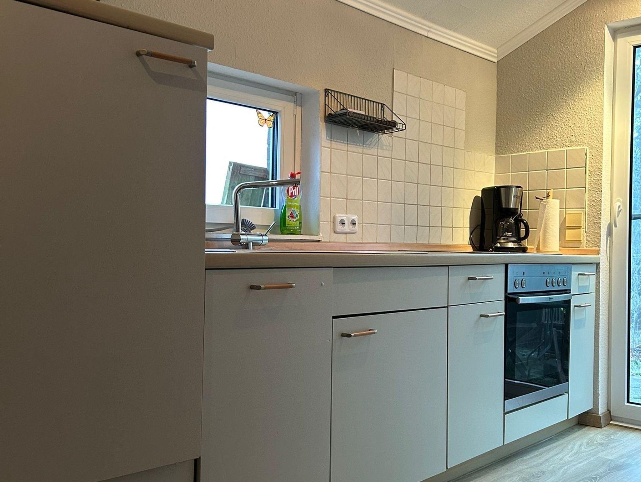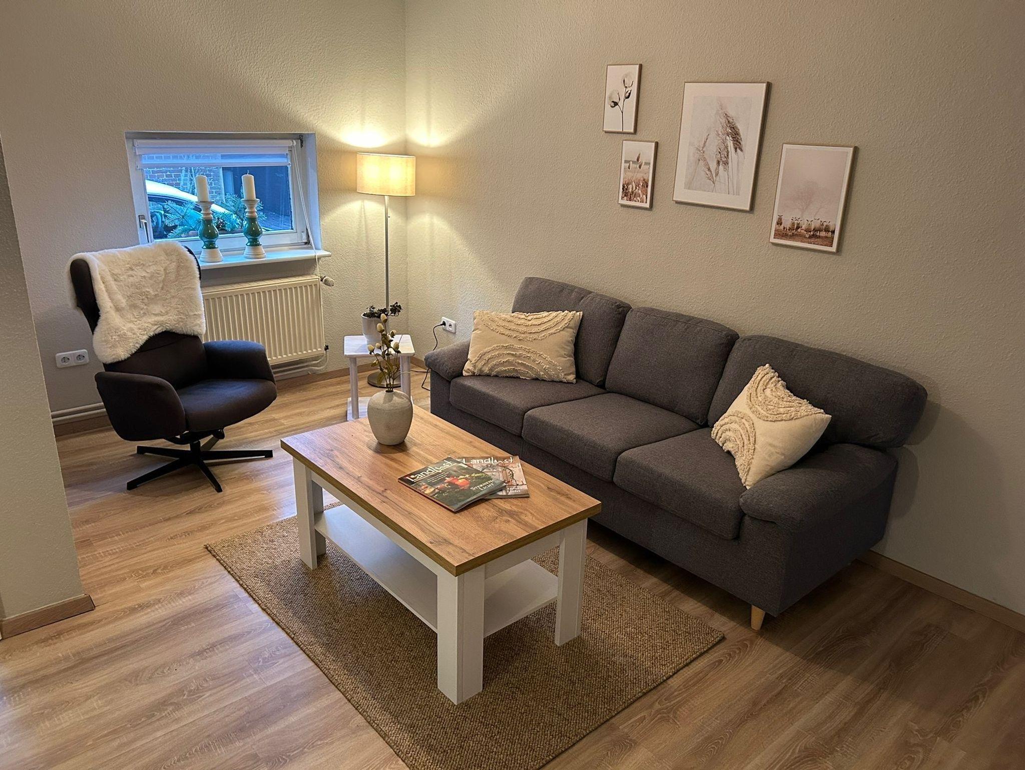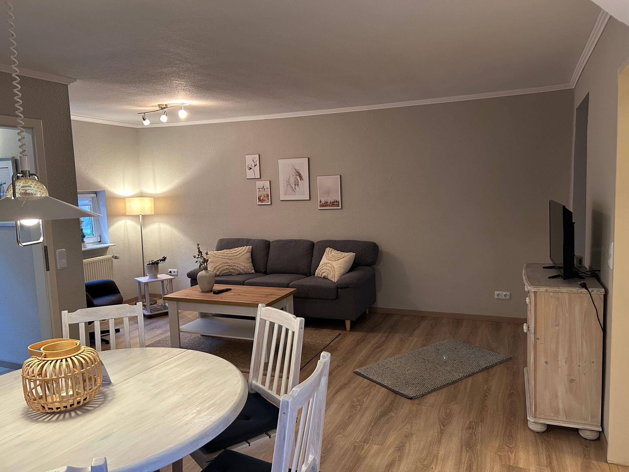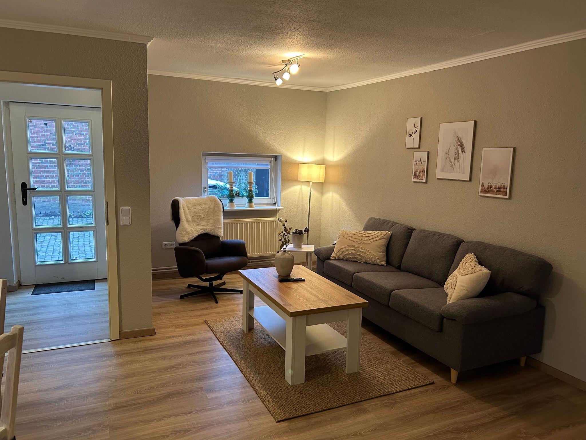 Gemütliche, moderne und ebenerdige Ferienwohnung für vier Personen mit Blick in die Weiden. Separater Küchenbereich mit kleinem Sitzplatz für 2 - 3 Personen und mit Zugang zum gemeinschaftlichen Garten. Ess- und Wohnbereich gehen in einander über; ausziehbarer Esstisch für 4 - 6 Personen.