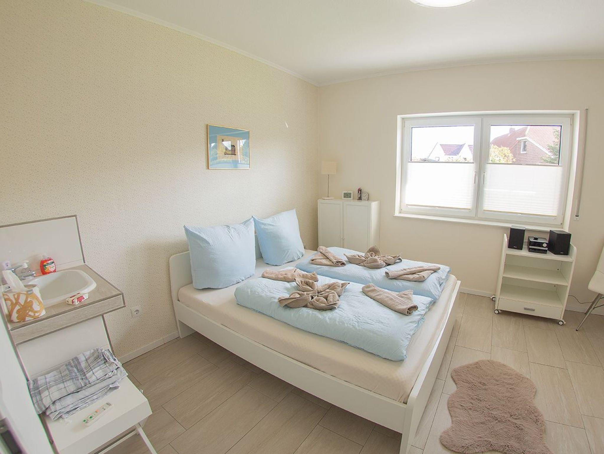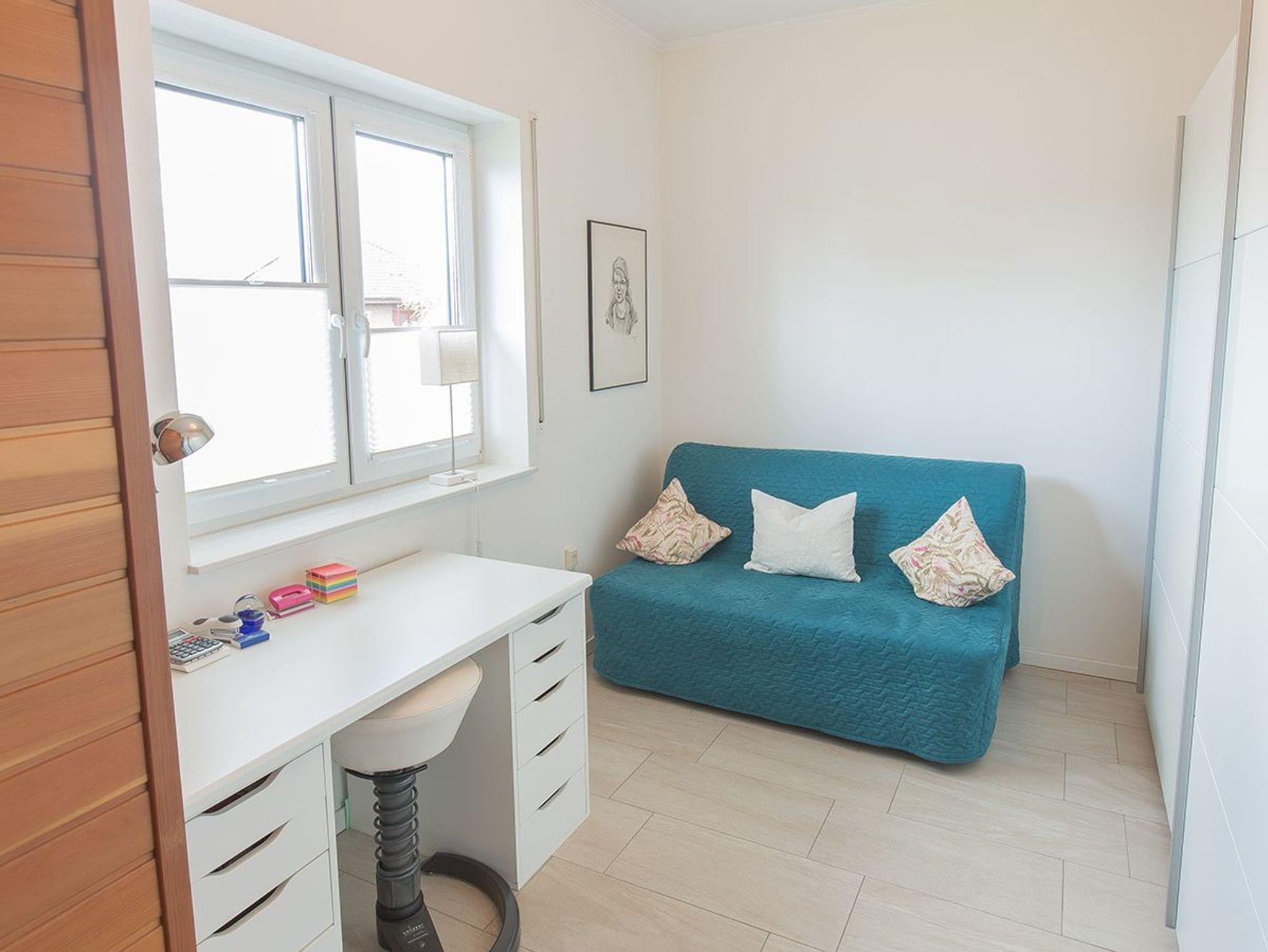 Das Haus verfügt über drei Schlafräume mit je einem Doppelbett und mit einem ausziehbaren Schlafsofa 140x200 cm. Das Schlafsofa befindet sich im Kinderzimmer und dort können Sie in der Infrarotsauna Wärme tanken. Oder nutzen Sie den Schreibtisch im Rahmen ihrer Workation.