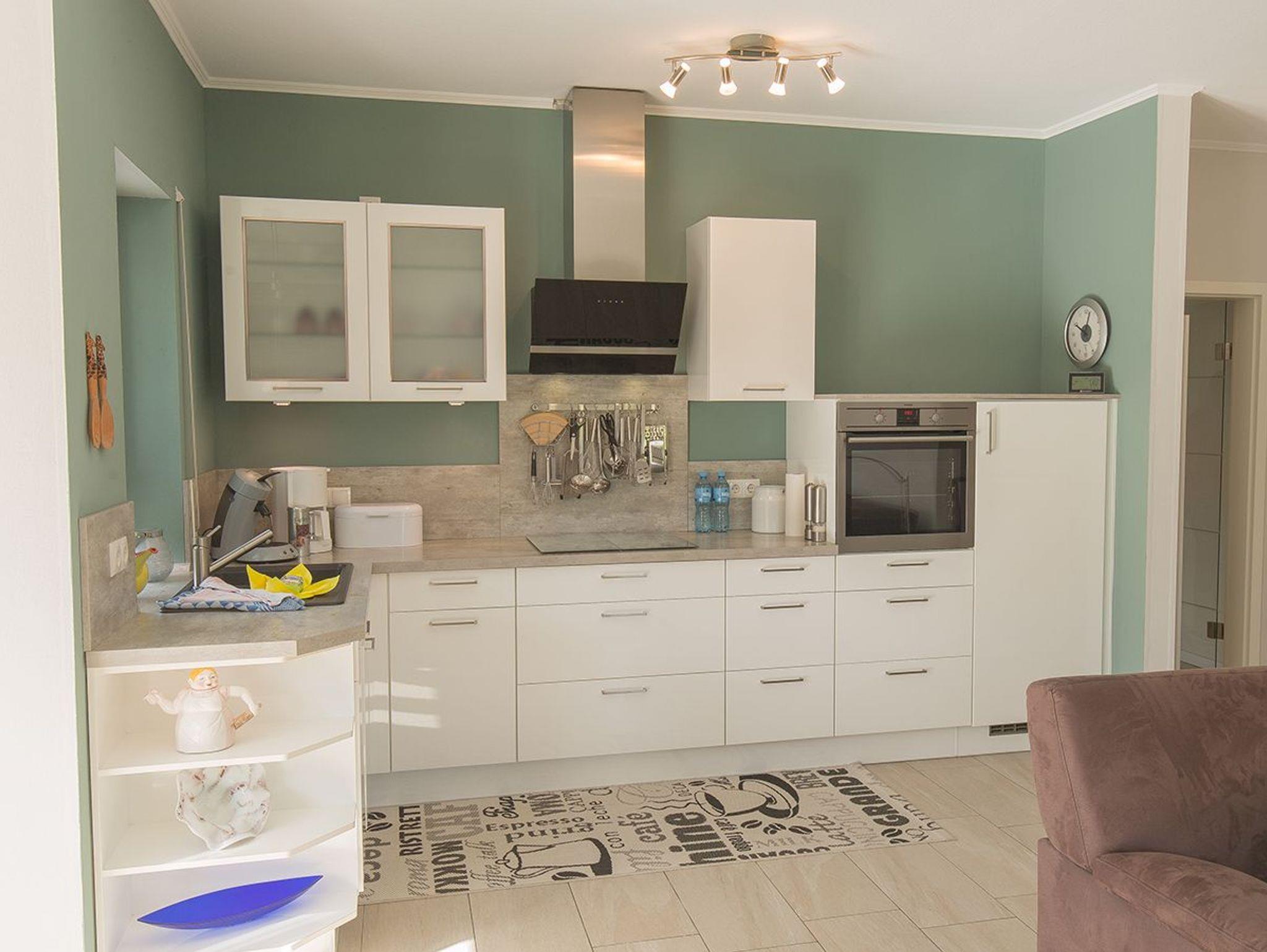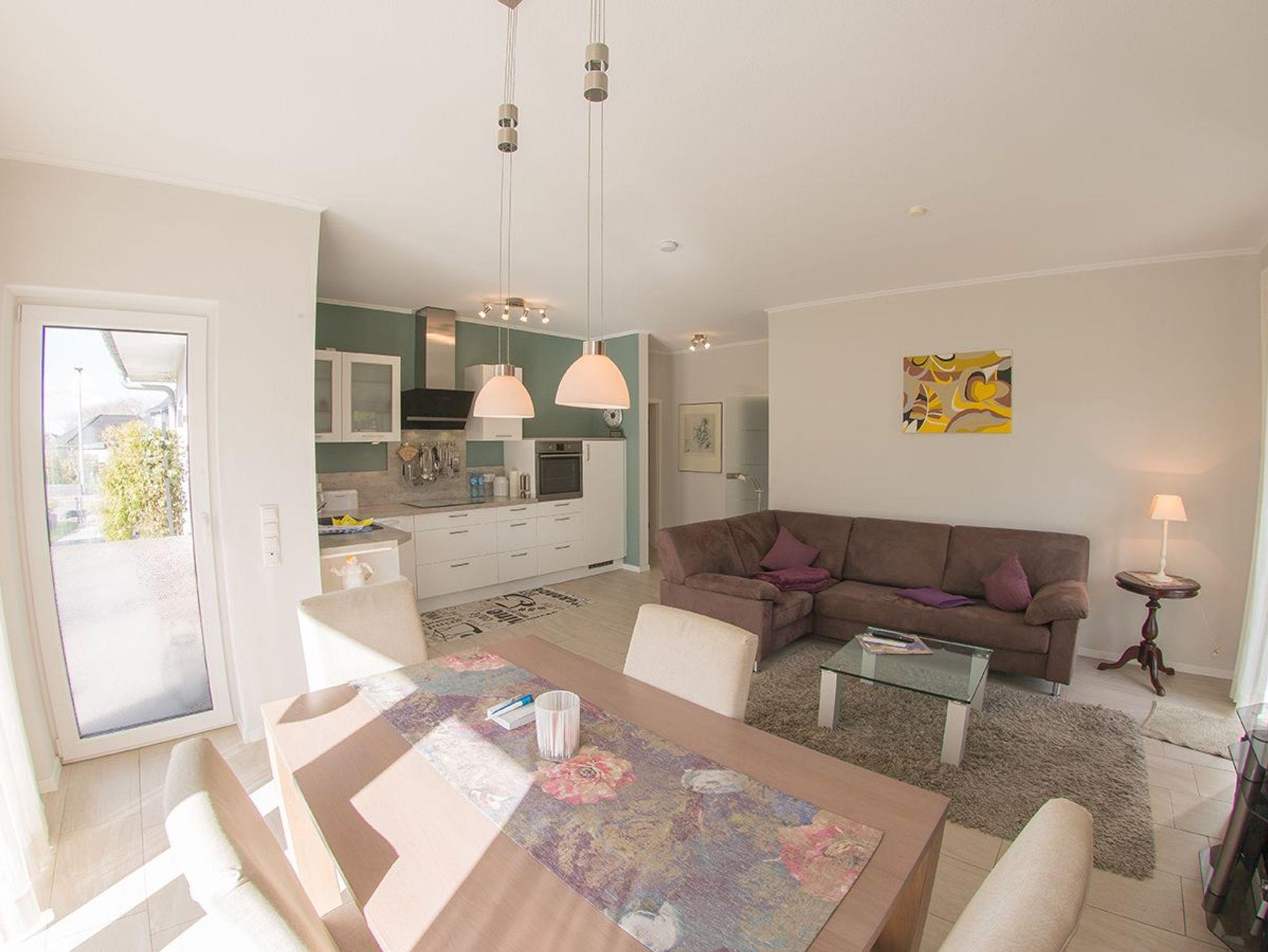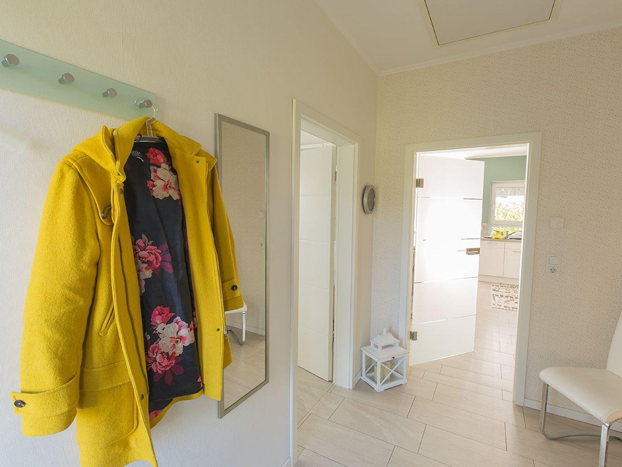 Sie parken direkt vor dem Haus - eine Garage ist vorhanden. Durch den hellen Dielenbereich gelangen Sie in das lichtdurchflutete Wohnzimmer mit integrierter L-Küchenzeile und dem Essplatz mit Ausgang zu den beiden Terrassen und der großen Liegewiese mit Strandkorb.