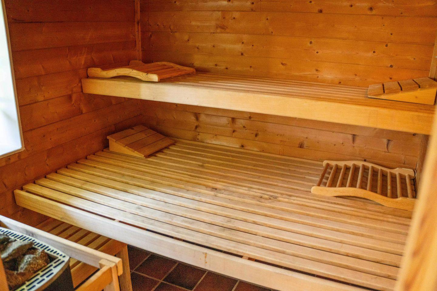 Im Saunabereich mit Ausgang zum Park finden Sie die nötige Entspannung. Das Grundstück hat große bepflanzte Gräben ringsherum.