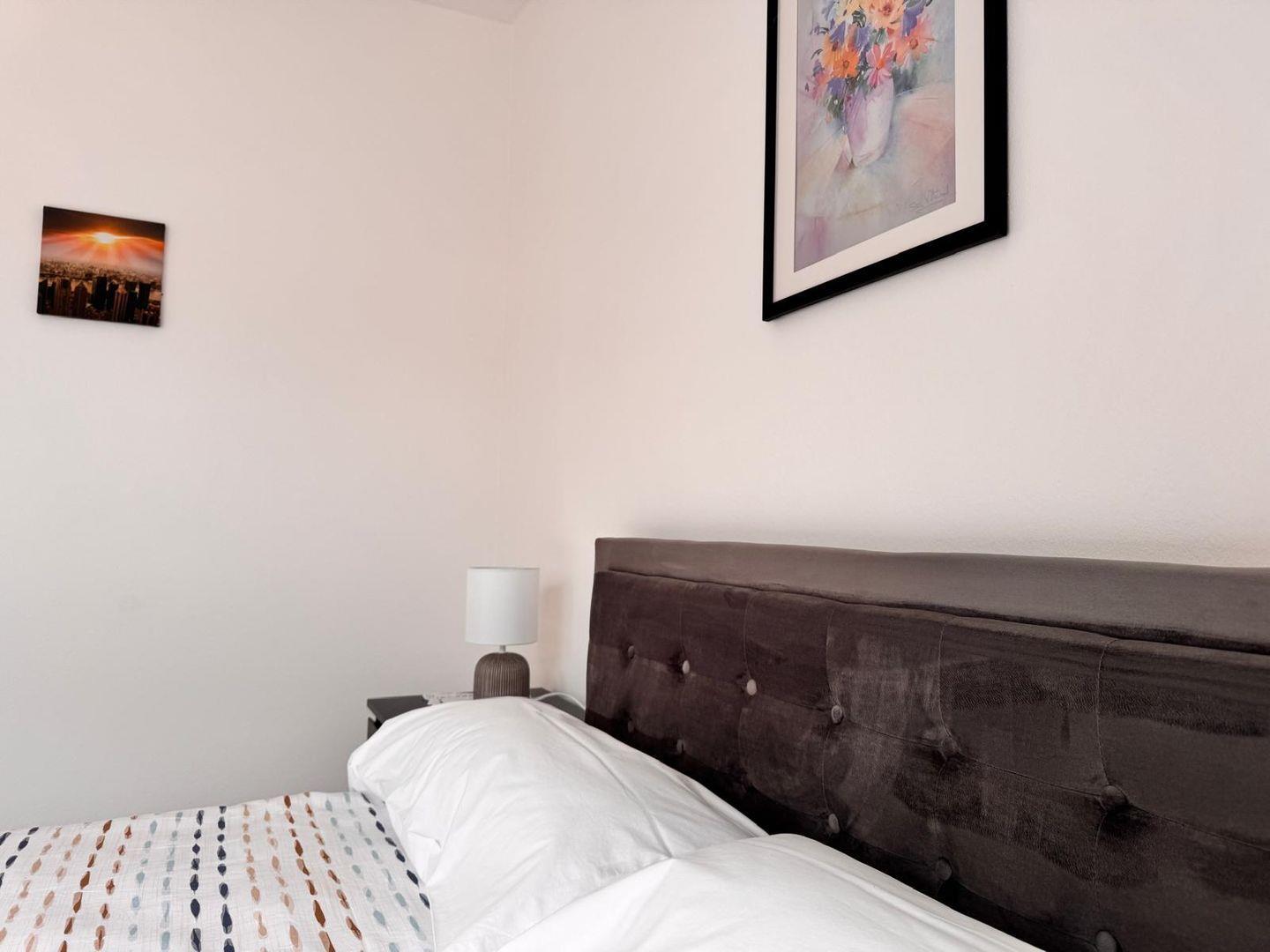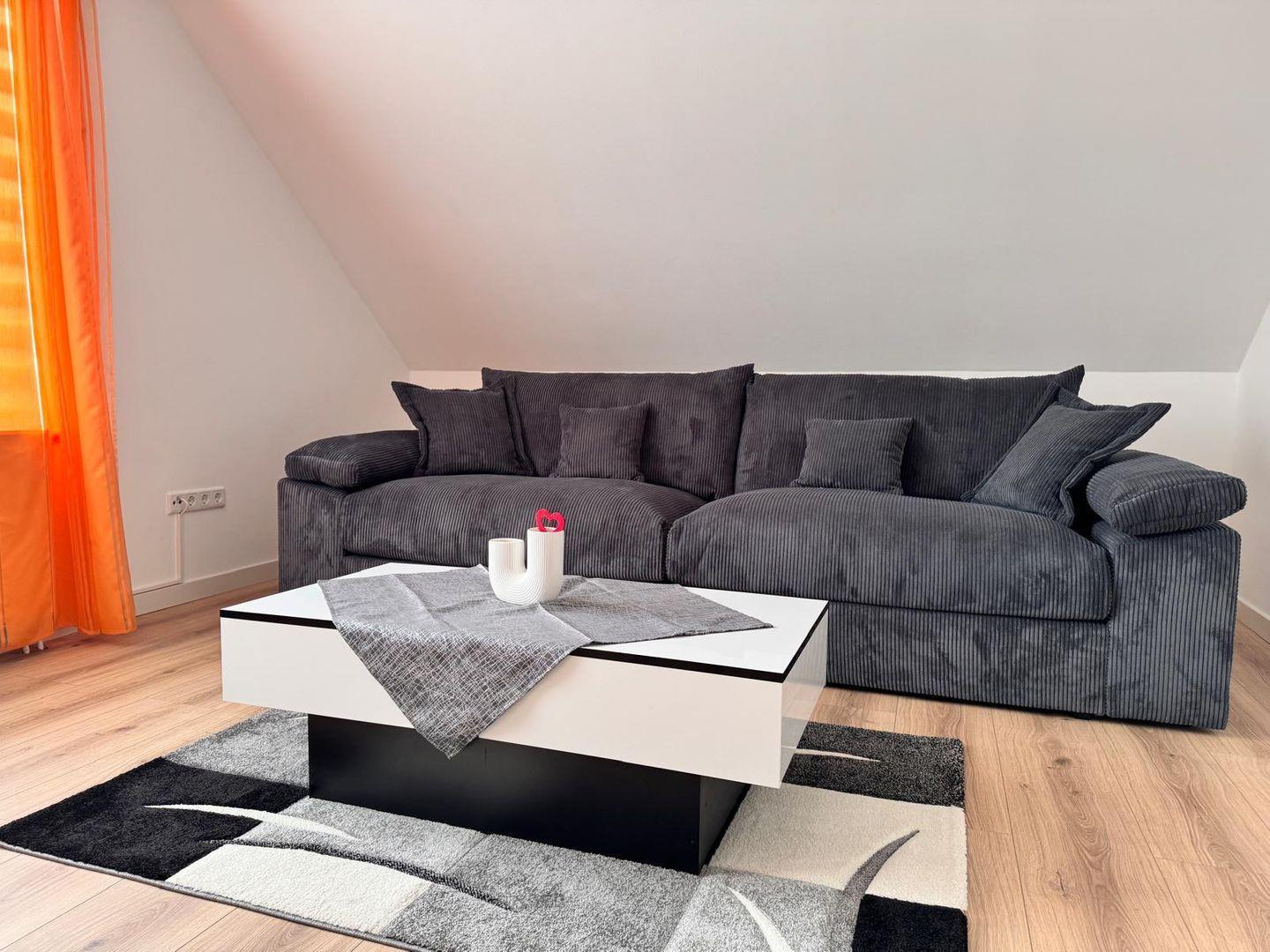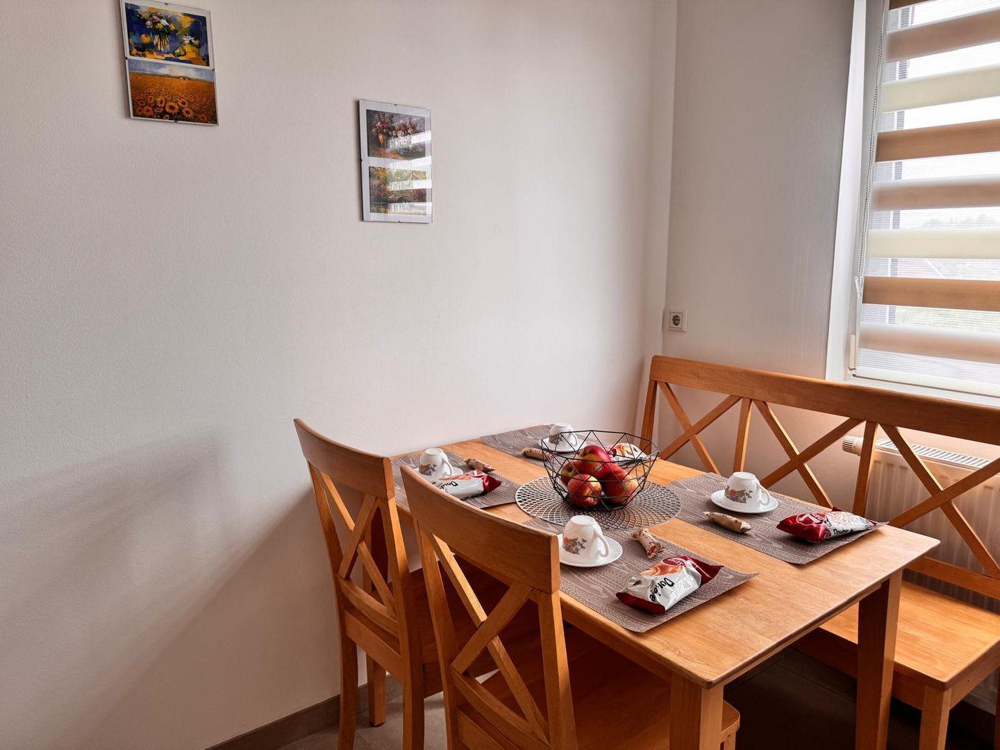 Zu den Annehmlichkeiten gehören ein helles Wohnzimmer mit Laminatboden, Sofaecke, Esstisch und einem modernen Fernseher, der für entspannte Abende einlädt. Zudem bietet das WLAN freien Zugang, um Ihre digitalen Bedürfnisse während Ihres Urlaubs zu erfüllen.