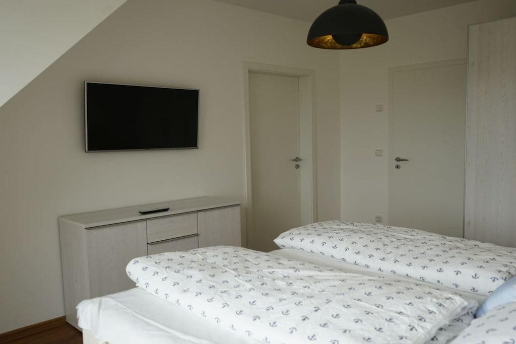 Die Doppelhaushälfte bietet auf drei Etagen einen hohen Ausstattungsstandard. Die Haushälfte ist für die Nutzung durch max. 4 Erwachsene und 1 Kind bis 5 Jahre konzipiert. Es ist eines unser Anliegen , einen Sitz- und Schlafkomfort von hohem Standard und wellnessbezogene Entspannung zu bieten. Eines der Bäder ist mit einem Whirlpool ausgestattet. Im Dachgeschoss befinden sich eine Sauna für 4 Personen und Ruheliegen. Im Wohnzimmer erhalten Sie per Knofpdruck Wärme und Gemütlichkeit durch einen Gaskamin. Der Ausstattungsgrad der offenen Küche ist hoch. Selbige ist großzügig konzipiert, sodass selbst Zubereitung und Präsentation der Speisen ein Urlaubshöhepunkt darstellen könnte.