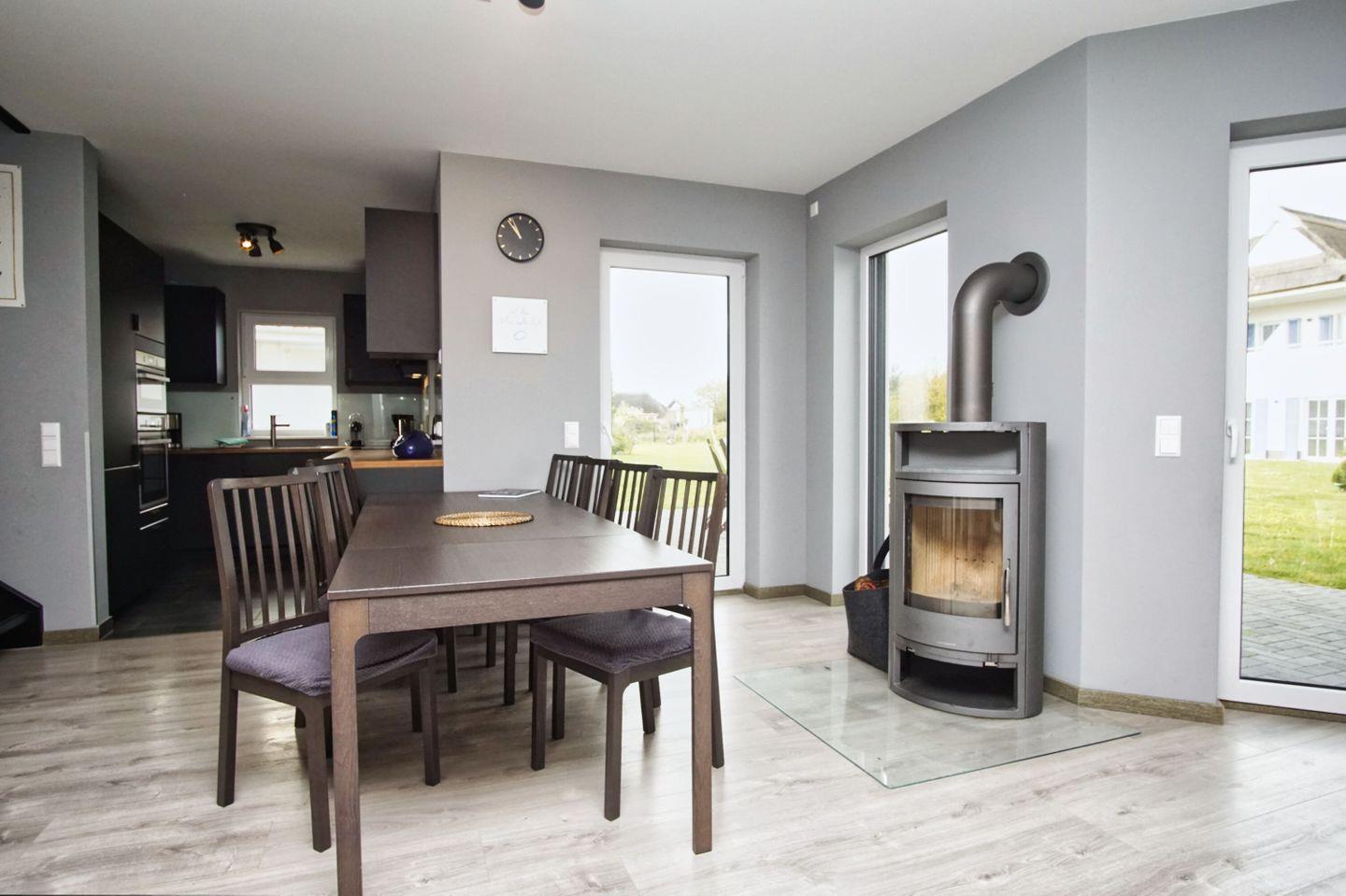 WOHNEN // Wohnraum im EG mit Essbereich, mit bequemer Couch, Kaminofen, Flachbild-TV, Essbereich, Schreibtisch,