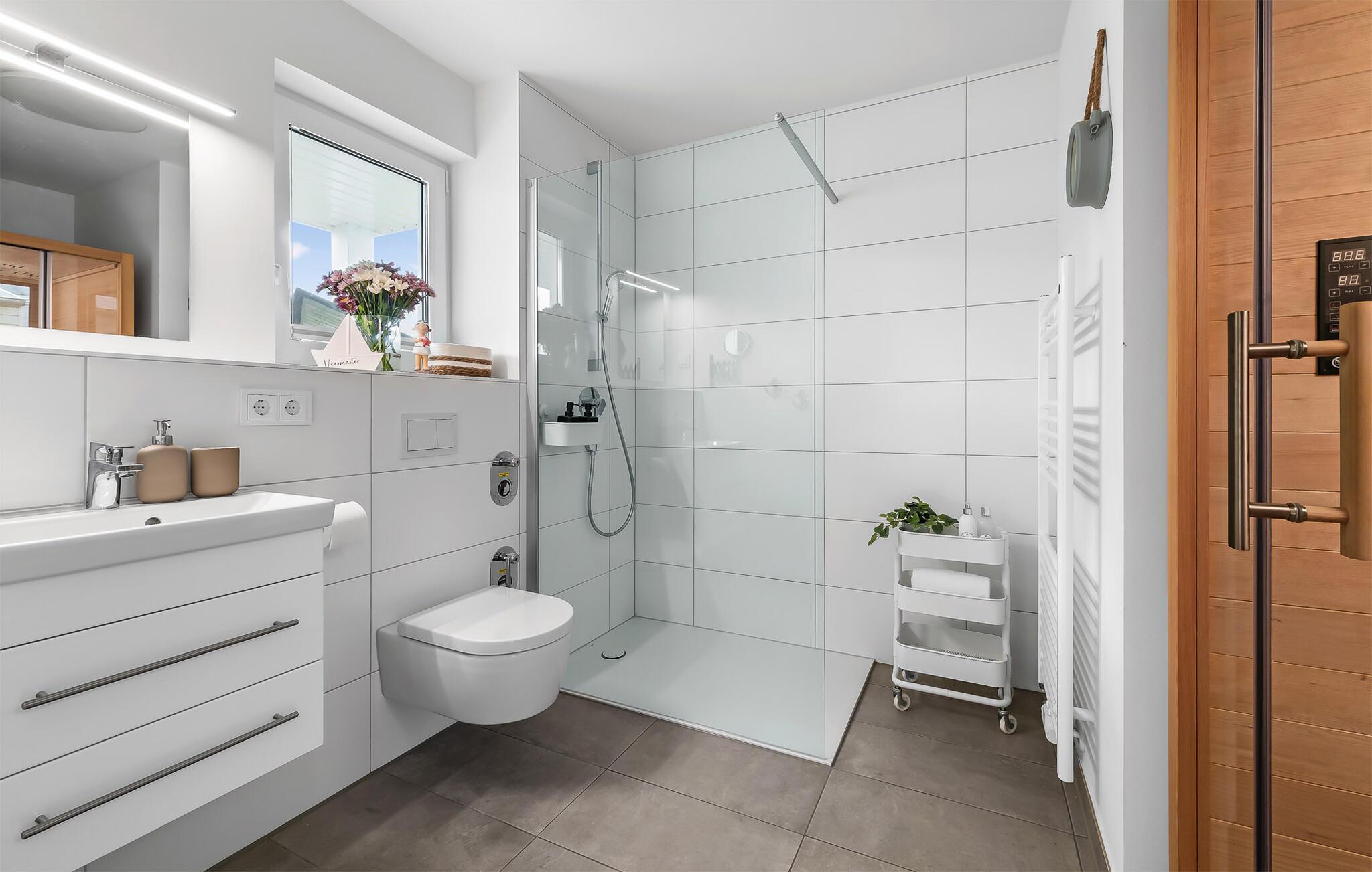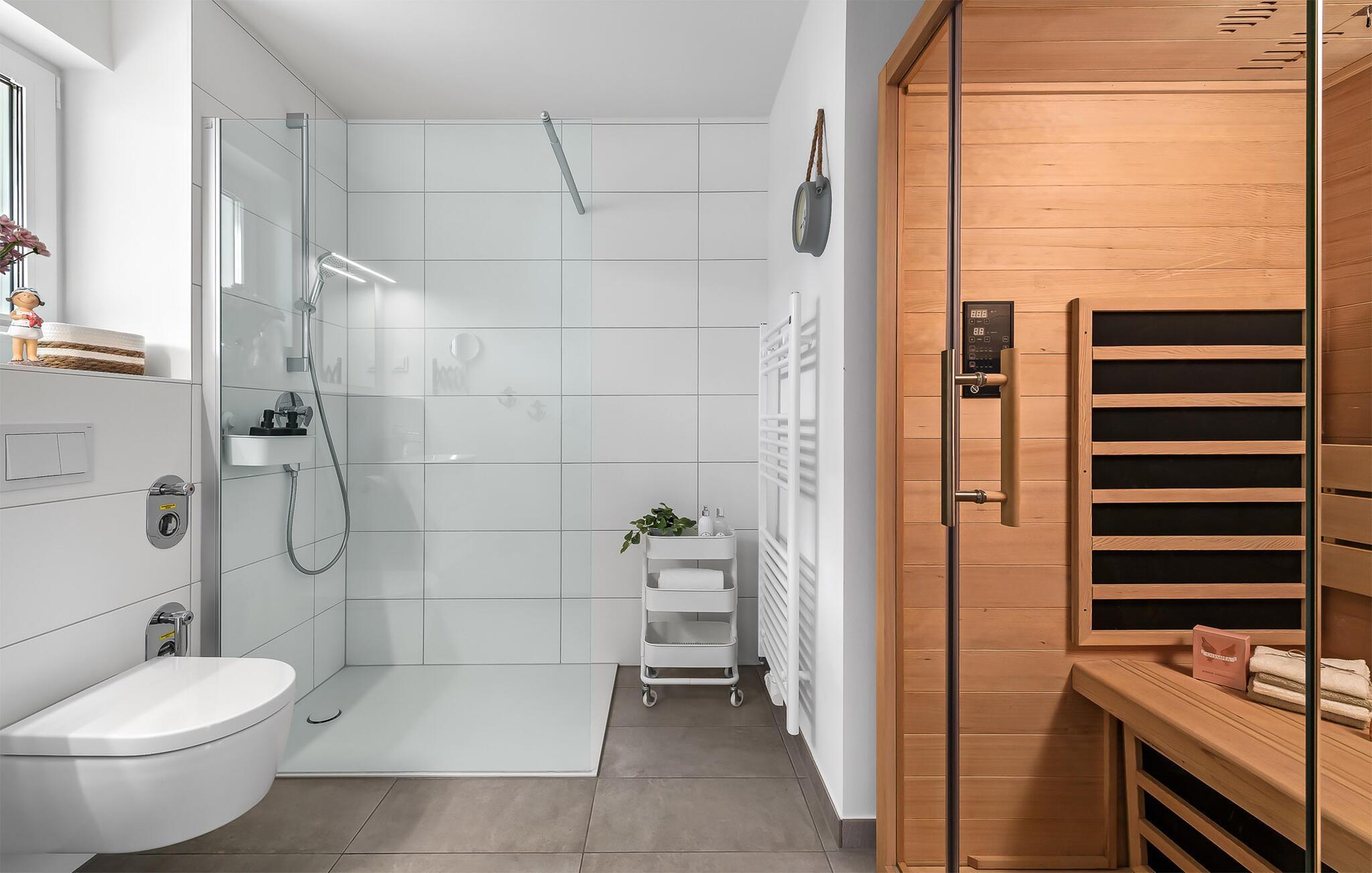 Für solche Momente bietet das großzügige Bad noch weitere Entspannungneben der bodengleichen Dusche mit Fußbodenheizung findet man hier eine Infrarotsauna, die das Wellnessfeeling abrundet.