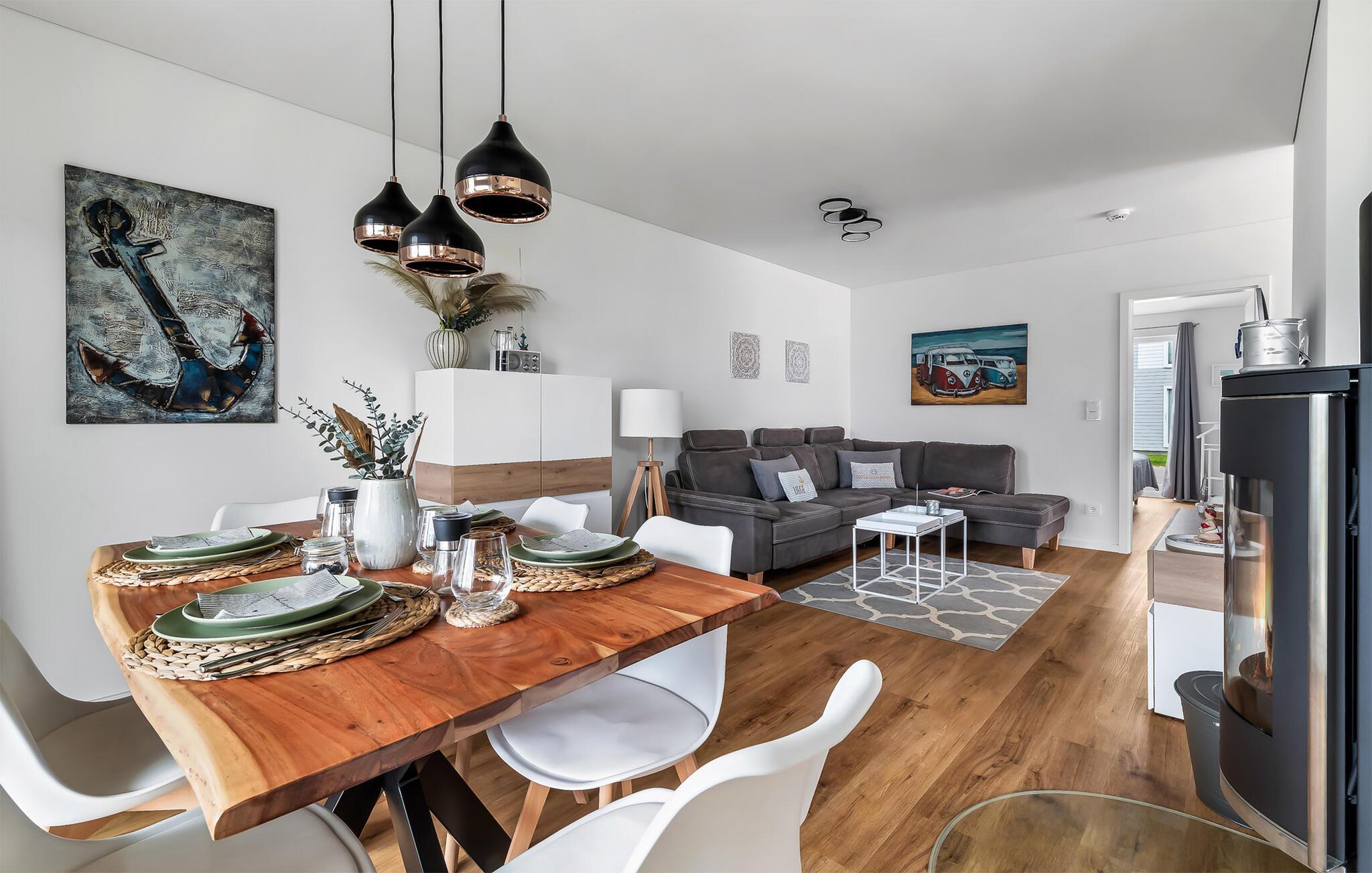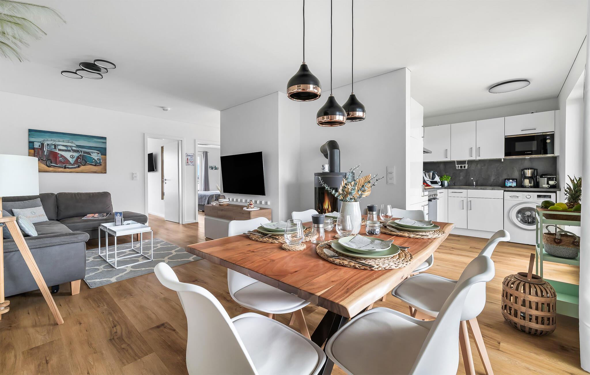 Angekommen im Wohnbereich, dem Herzstück der Wohnung, lässt es sich auf verschiedenste Weise gut gehen. Wie wäre es mit einem Spieleabend mit der ganzen Familie oder einem gemeinsamen Grillabend auf der angrenzenden Terrasse? Die gemütliche Wohnlandschaft mit Kaminofen und Fernseher mit Home Entertainment fühlen sich bei Schietwedder an wie eine dampfende Tasse Tee zum Aufwärmen. Nach einem warmen Strandtag bietet die Wohnung die ideale Kulisse, um sich von den erlebten Abenteuern zu erholen.